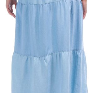 Introducing the Juniors Chambray Tiered Maxi Skirt. Channel that cute western vibe with this tiered chambray maxi skirt, offering a flowy fit for an effortless look. The smocked waistband gives it a comfortable fit around the waist. Perfect for your next concert or casual outing, this versatile maxi skirt is a must-have addition to your closet.