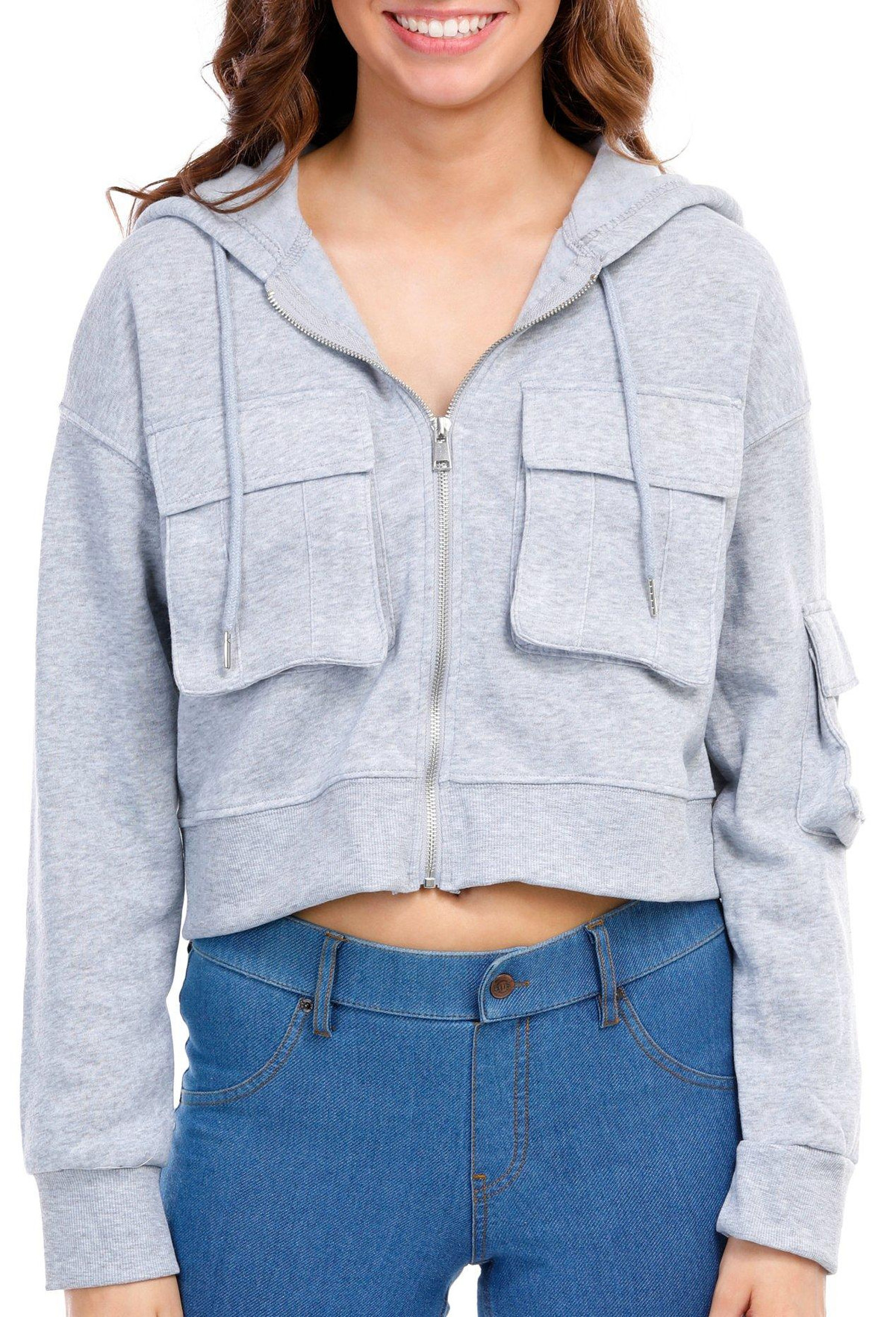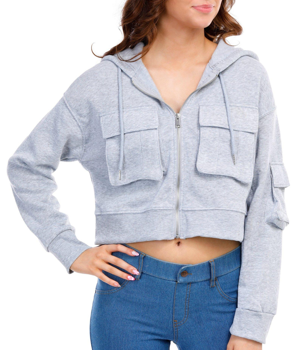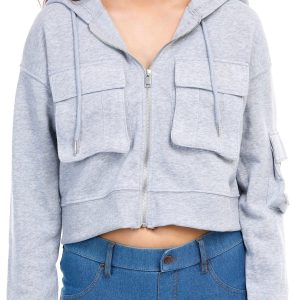 Introducing the Juniors Cropped Cargo Zip Up Jacket, made from 100% polyester for durability and comfort. This trendy jacket features a full front zip closure and a drawstring hooded neckline for a customizable fit. With cargo chest pockets and additional pockets on the sleeves, it offers ample storage. The soft fleece inner lining ensures warmth, while the 17-inch length adds a stylish, cropped look. Perfect for layering and casual wear, this jacket is a versatile addition to any wardrobe.
