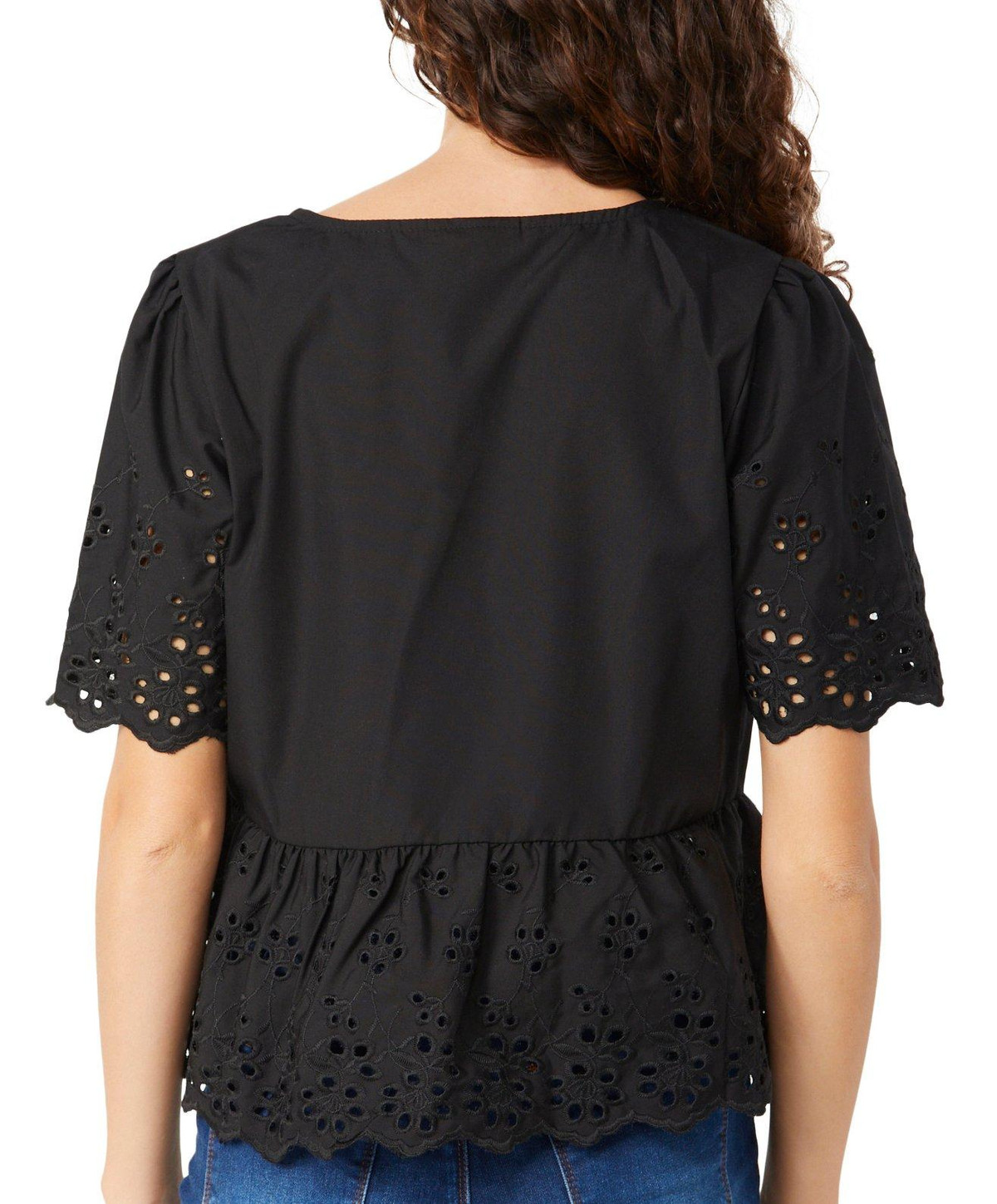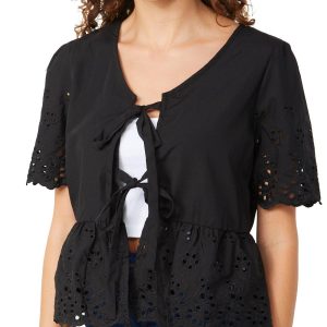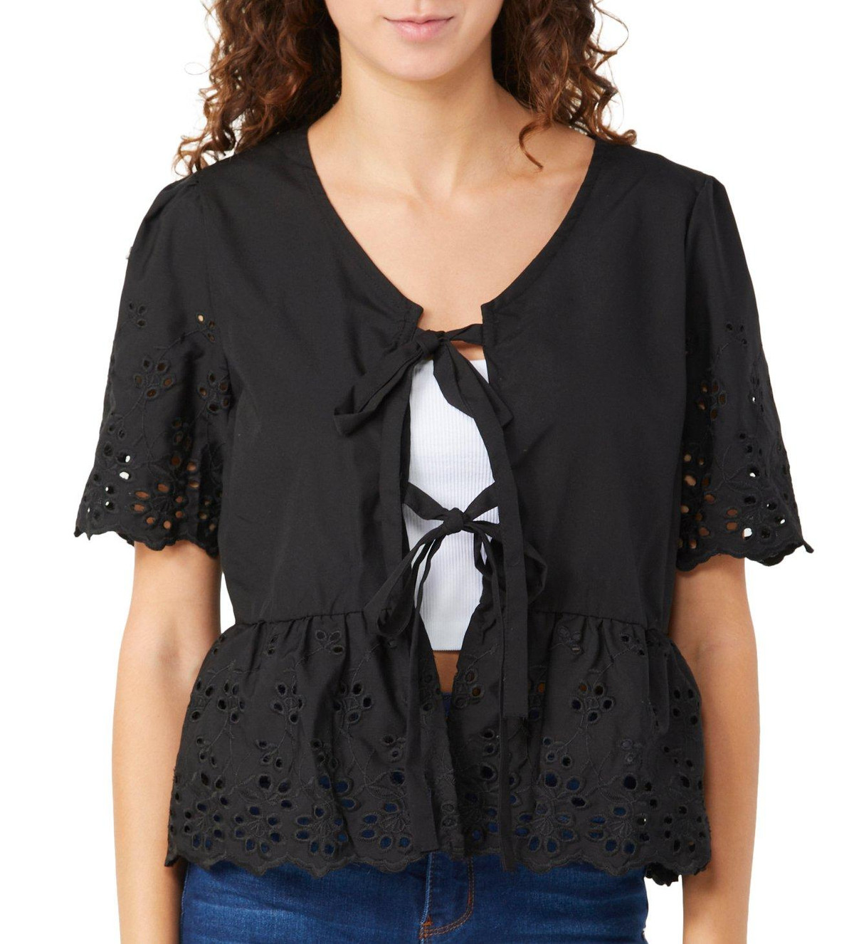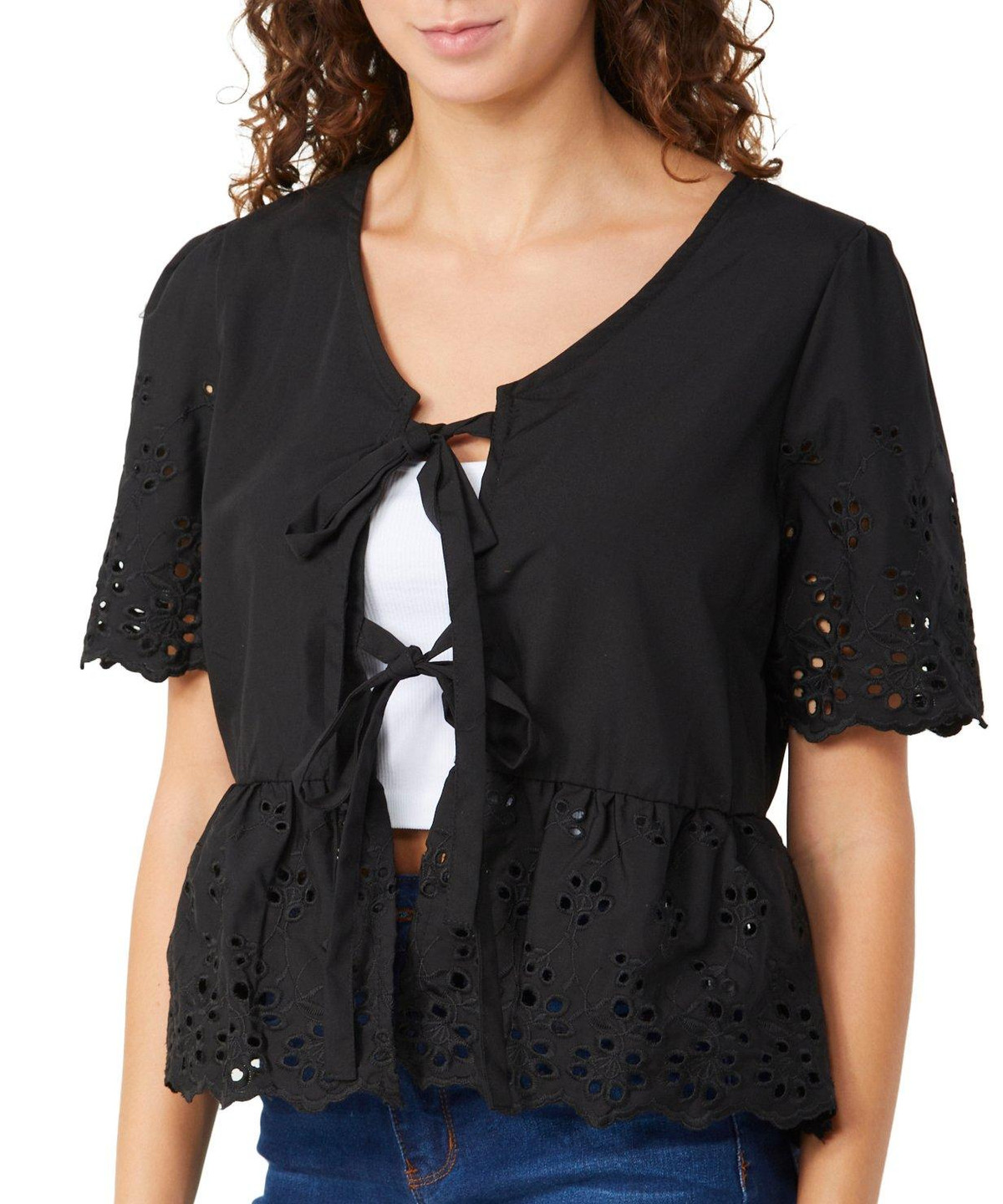 This juniors top adds a playful twist with eyelet trim and a double tie front. The solid color keeps it versatile, and eyelet trim creates a delicately beautiful design. Crafted from woven fabric, it blends structure with softness for a flattering fit. Fabrication 80% polyester, 20% cotton.