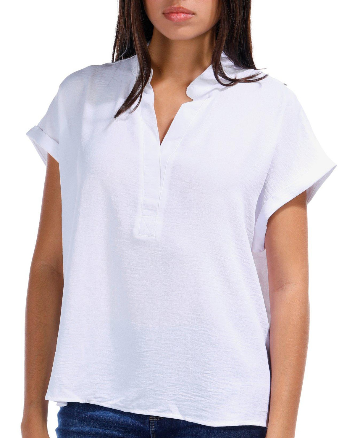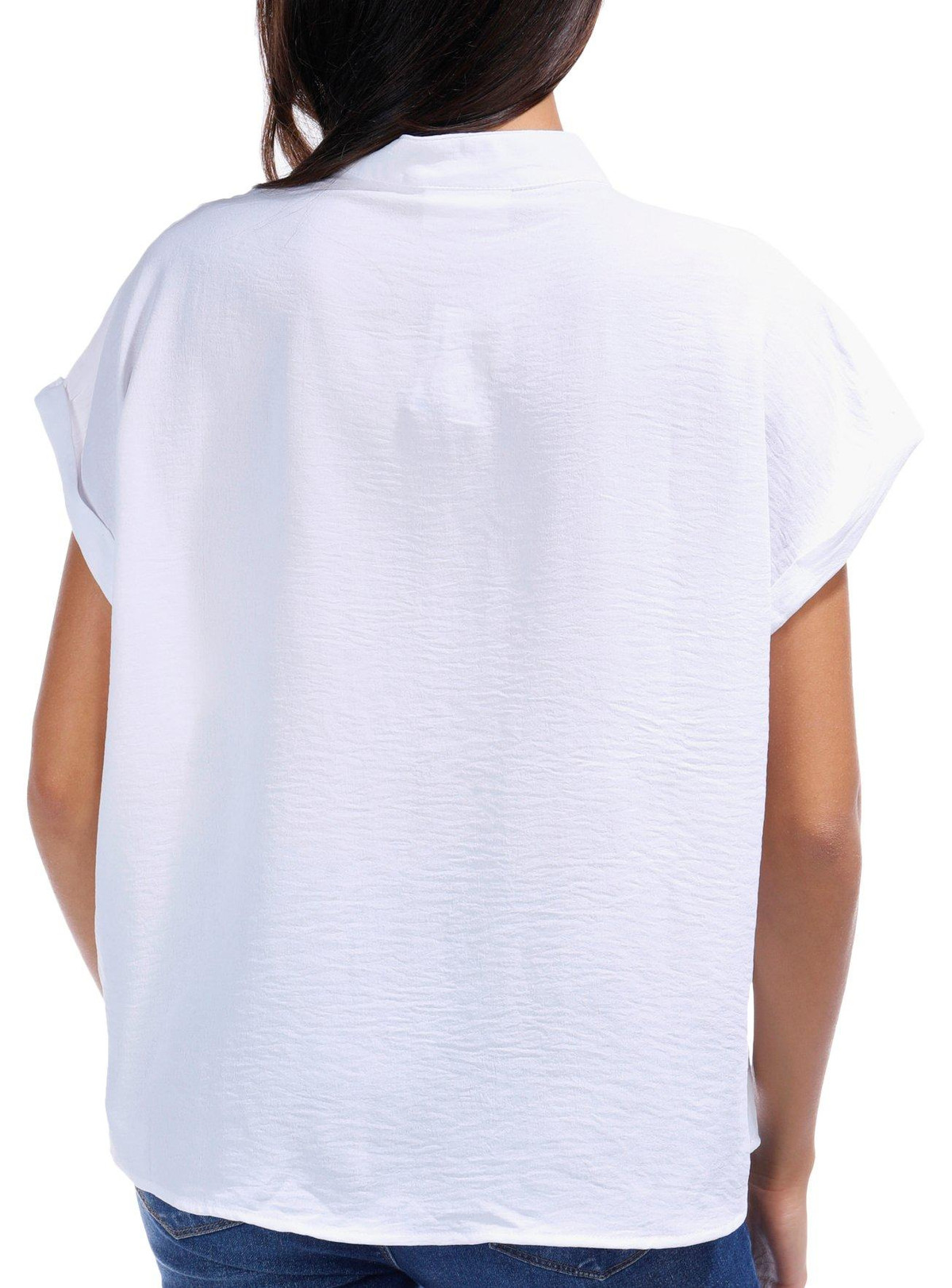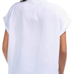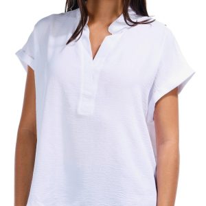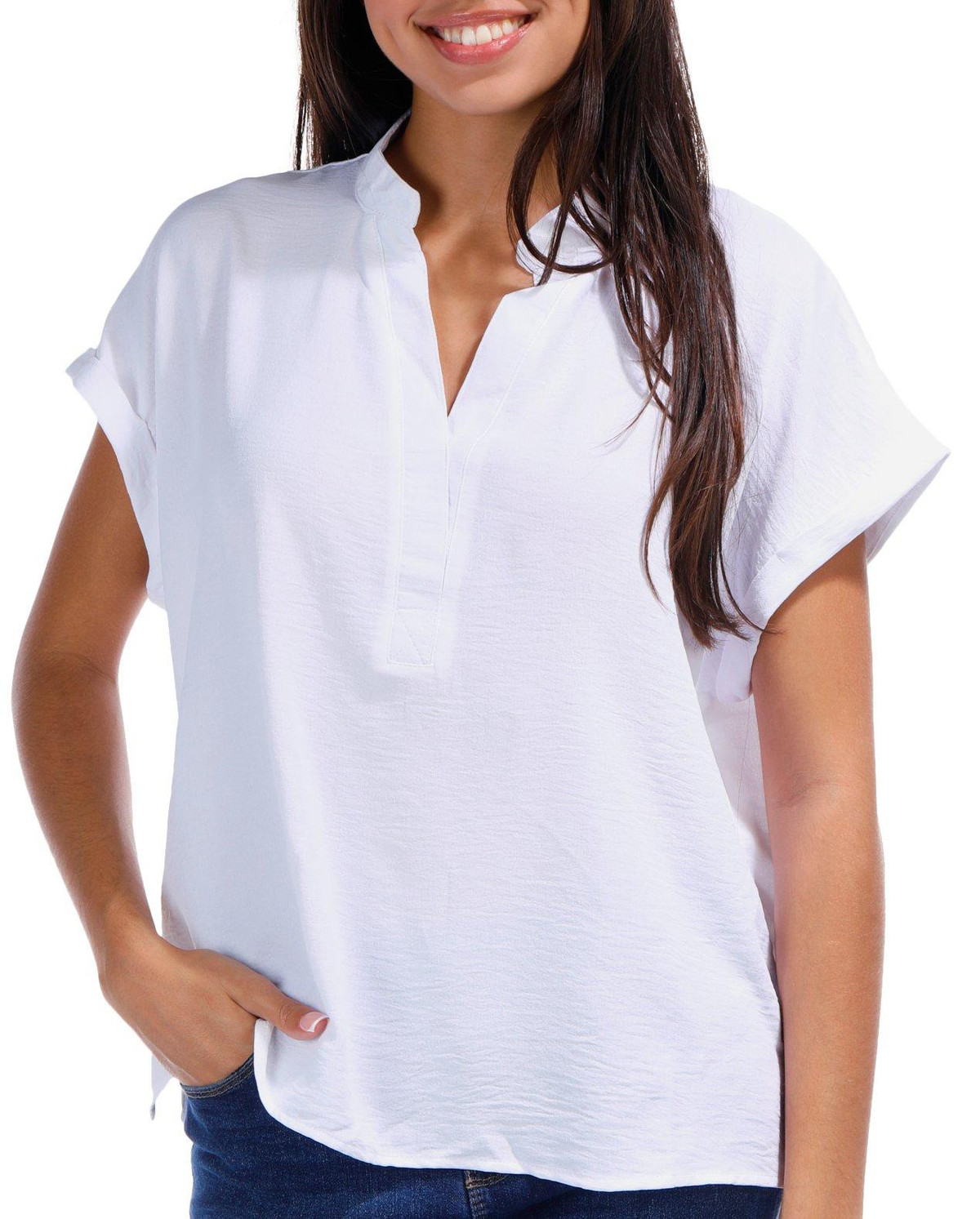 From special occasions to fashionable, everyday outfits, this short sleeve top is the perfect layer to pair with a camisole or cardigan. This top features a solid color design on lightweight wrinkle-style woven fabric, a split neckline, cuffed sleeves, and a side split hem. Fabrication is 100% Polyester. Top length measures approximately 23 in.