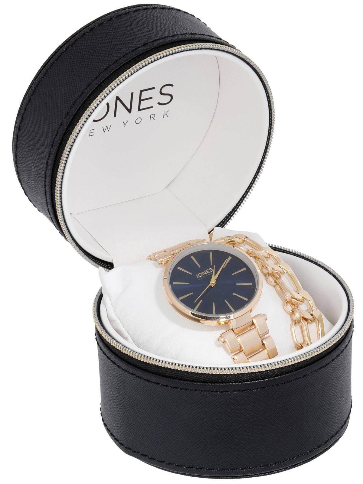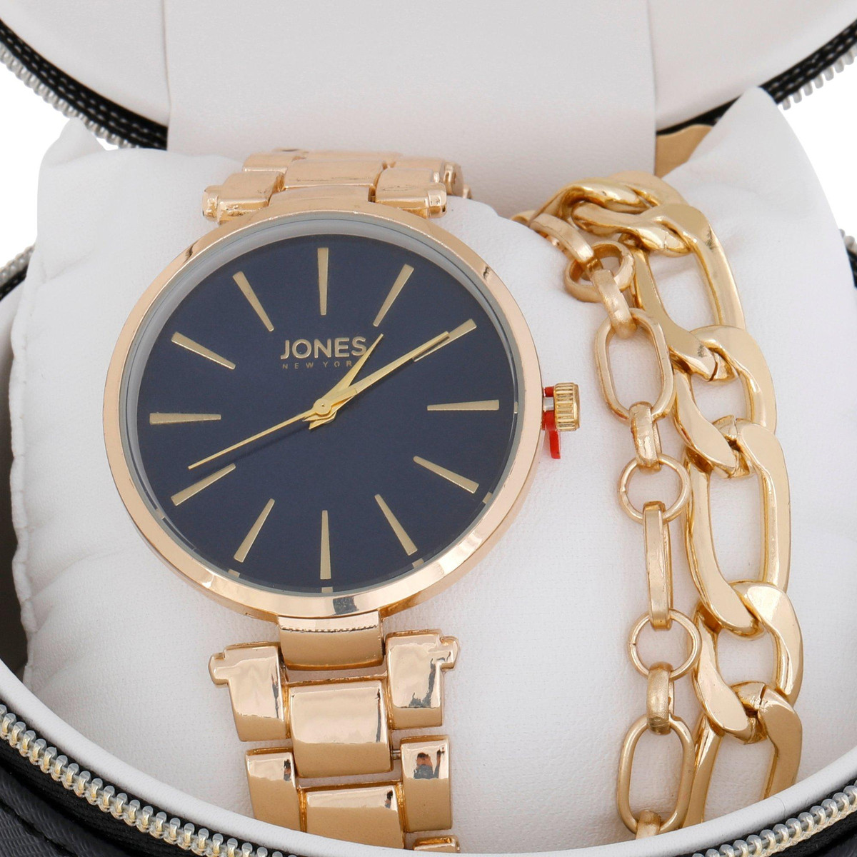 Elevate your accessory collection with the Jones New York Women’s 3-Piece Boxed Watch Set. This chic set features a sleek watch paired with coordinating bracelets, all presented in a stylish gift-ready box. Perfect for adding a touch of sophistication to any outfit or as a thoughtful gift for a loved one. Whether dressing up for a special occasion or adding flair to everyday wear, this set offers versatility and timeless appeal.