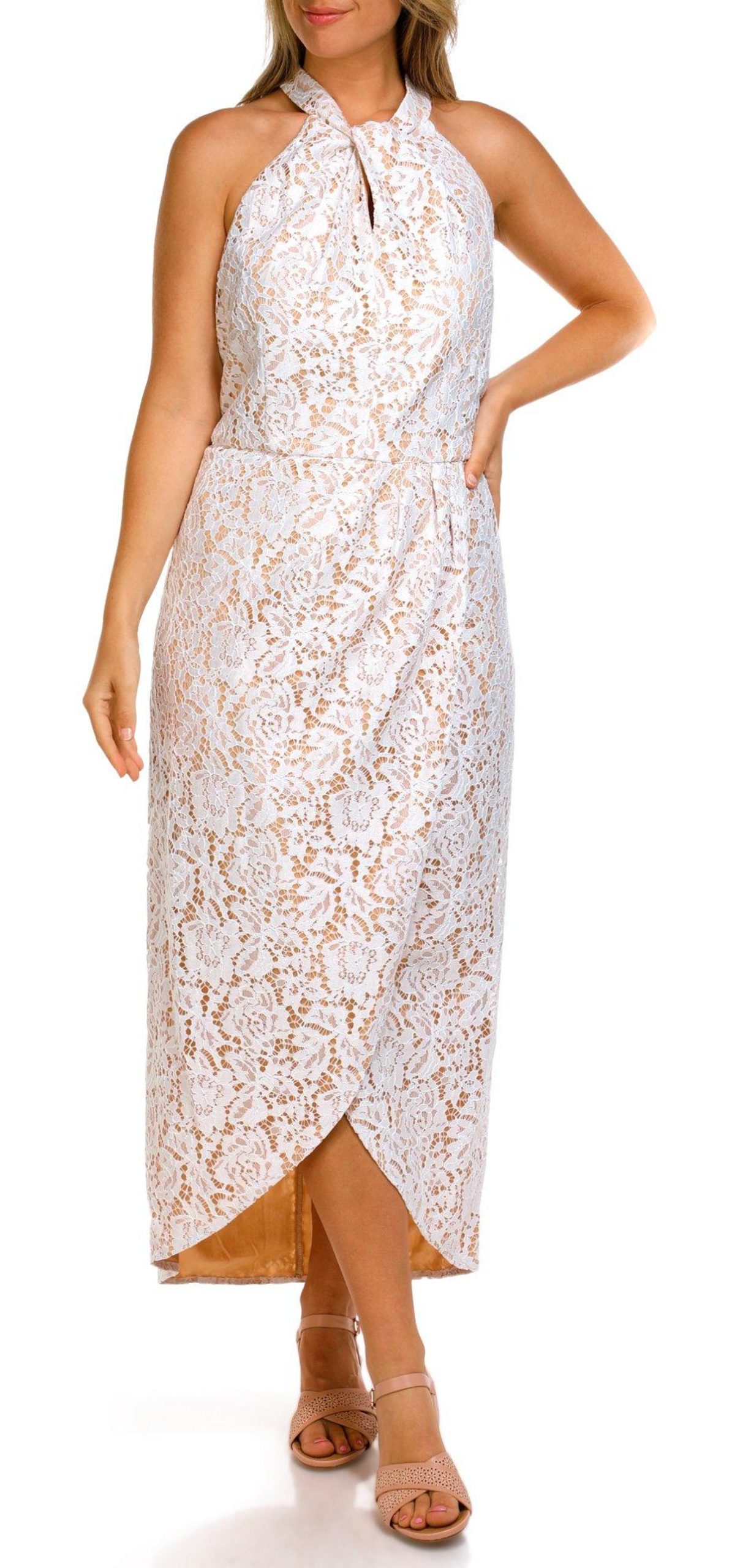 Elevate your evening look with this Women’s Twist Neck Lace High-Low Dress. Crafted from soft polyester, it features a delicate lace overlay, halter front neckline, and a chic back keyhole. The tulip hem and high-low design add graceful movement, while the back zip ensures a flattering fit.
