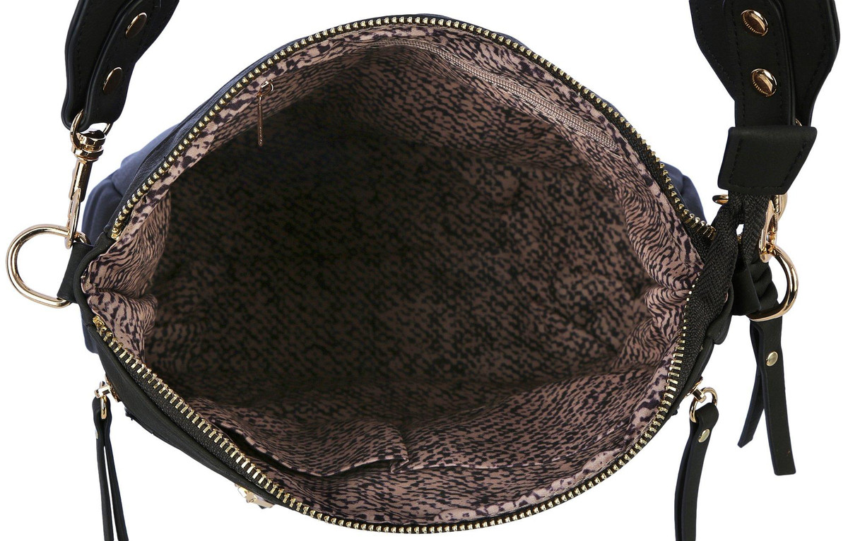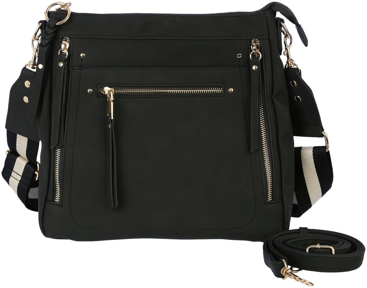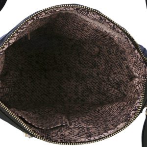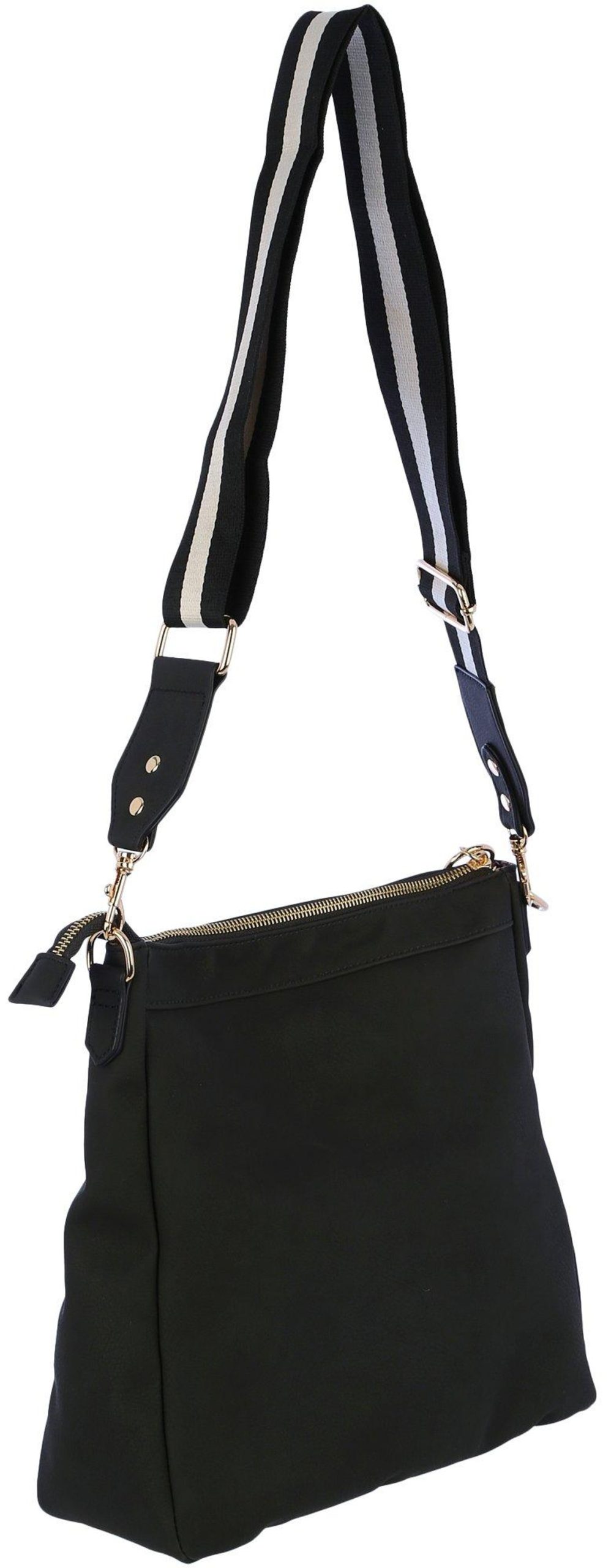 The Nikki crossbody bag features a stylish solid faux suede exterior, gold tone hardware, two removable crossbody straps, three exterior zip compartments, a top compartment with inner zip and slip pockets. Measures 17 in. x 6 in. x 9 in.