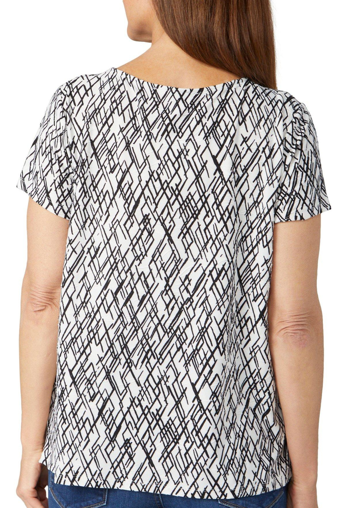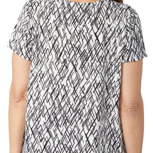 Enhance your wardrobe with this elegant Short Sleeve Top, crafted from brushed jacquard fabric for a luxurious and comfortable feel. The bar neck detail adds a modern and sophisticated touch, making this top perfect for both casual and dressy occasions. Pair it with tailored pants for a polished look or with jeans for a chic, everyday outfit. Fabrication is 95% polyester, 5% spandex.
