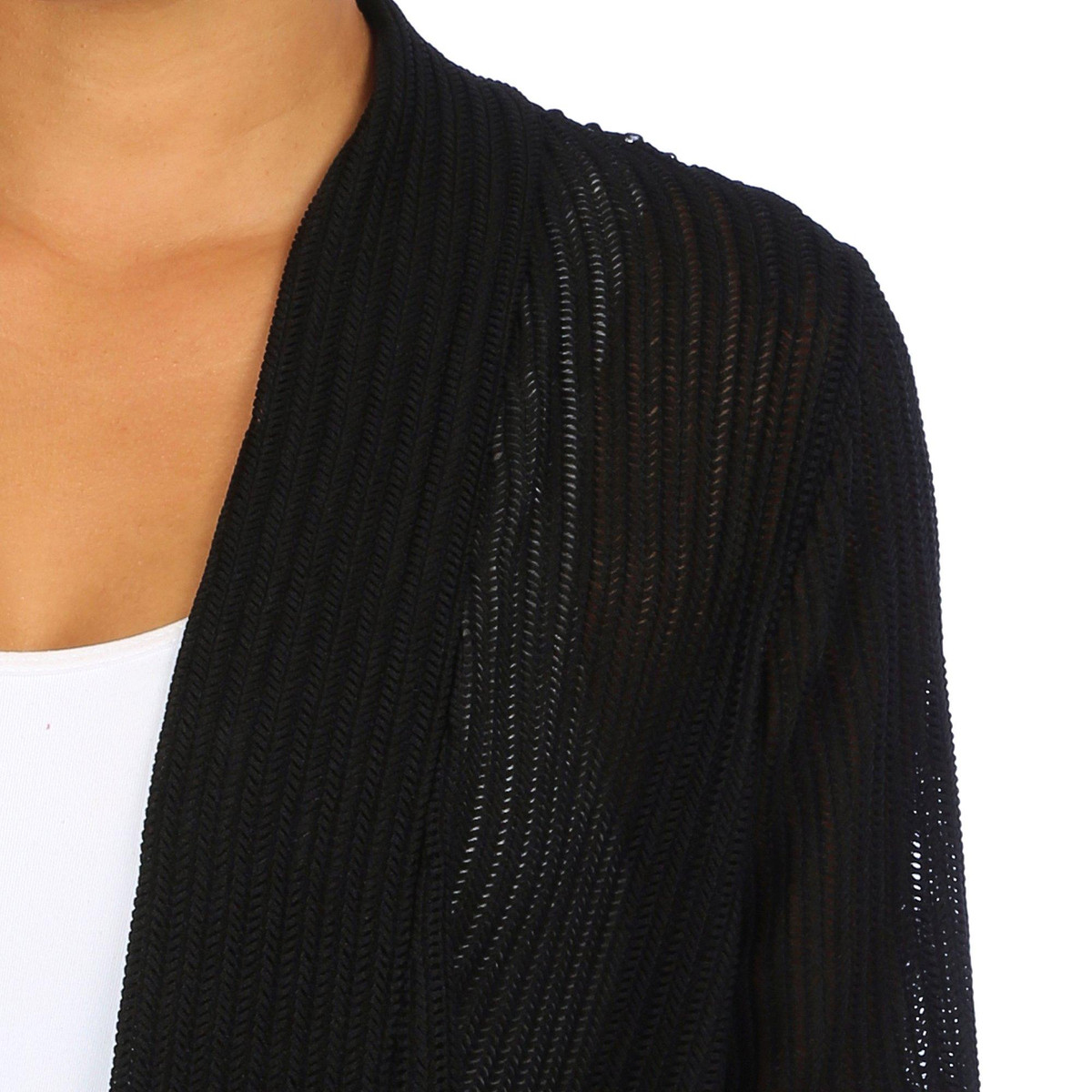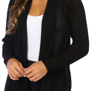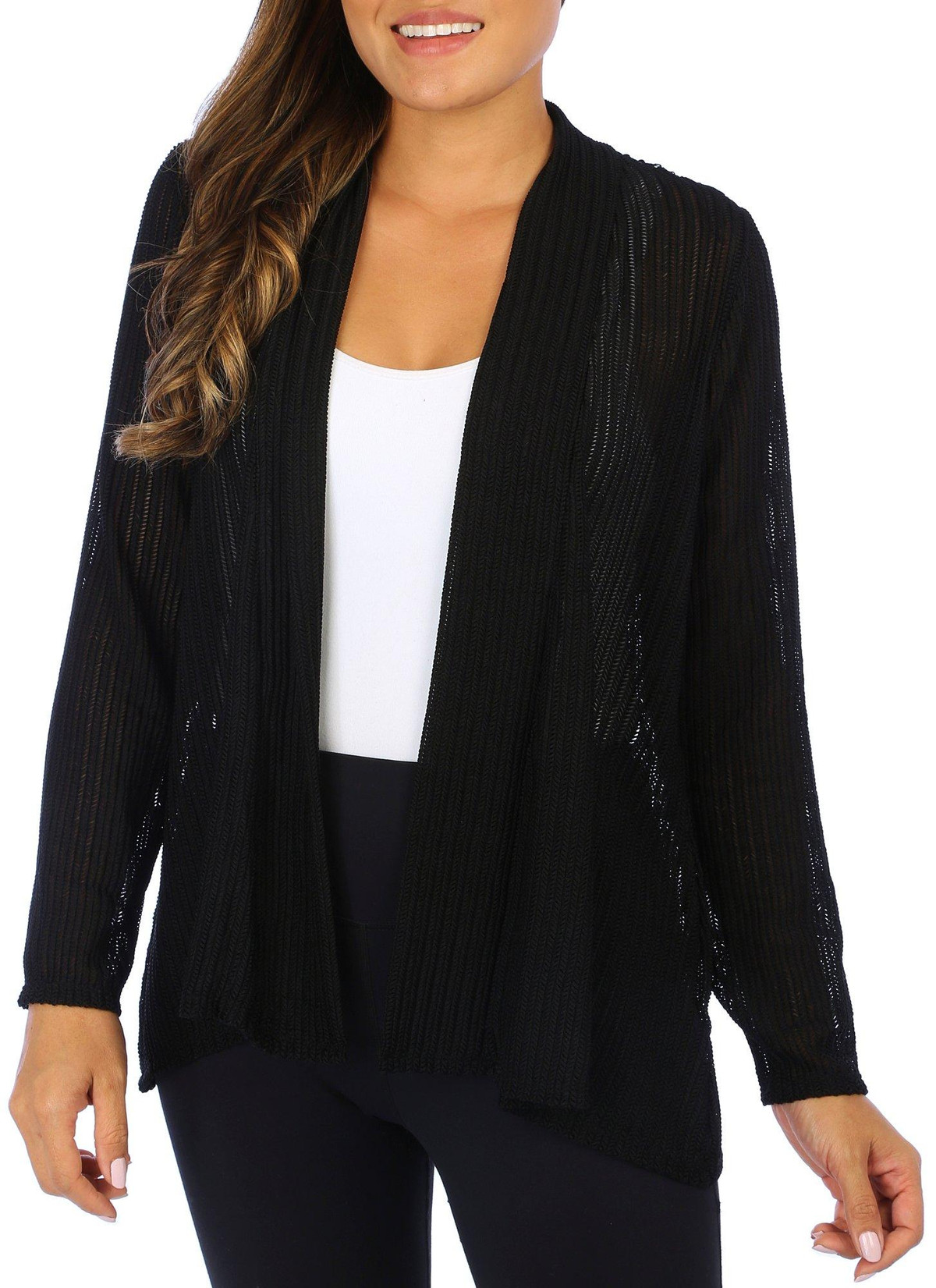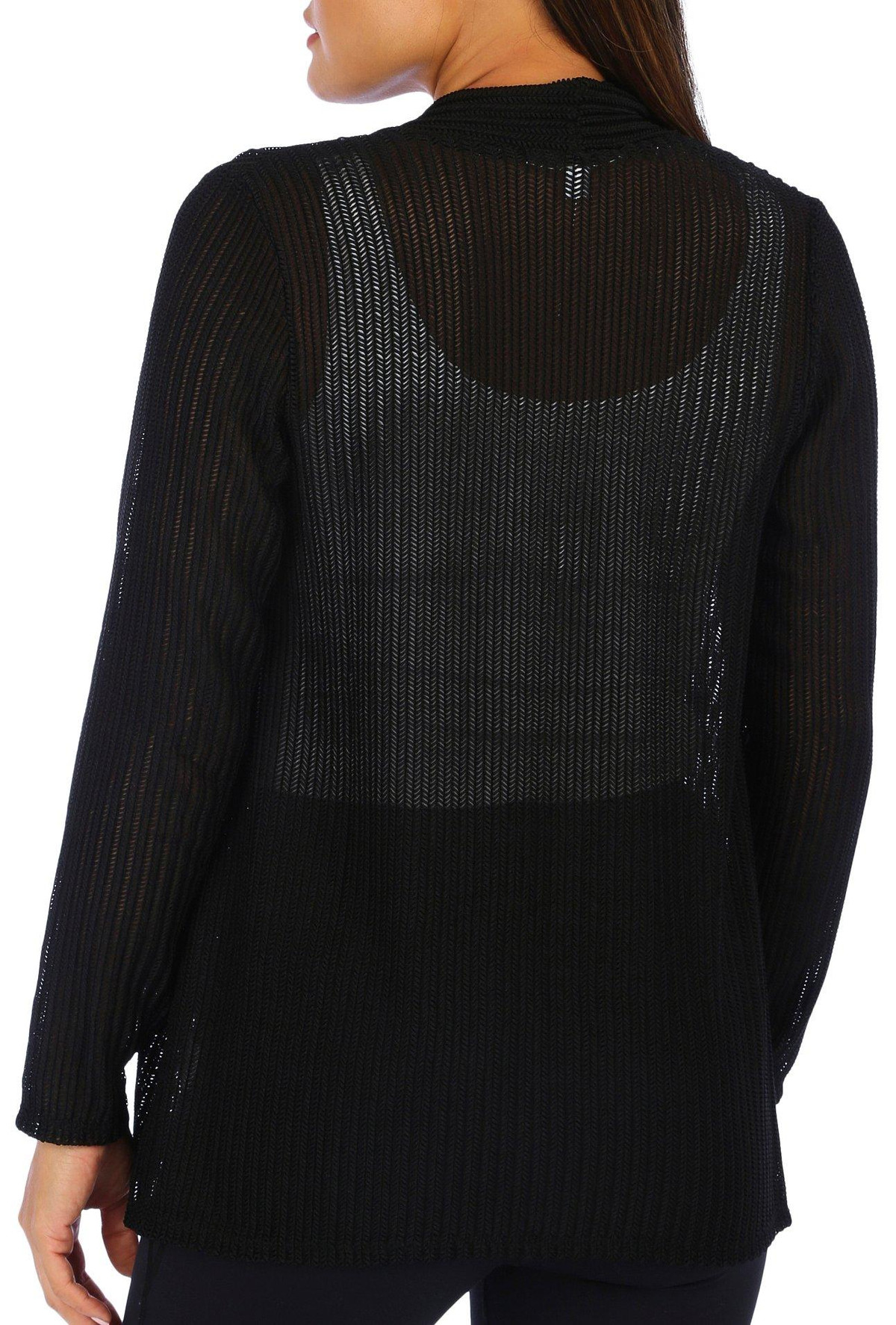 This cardigan features a solid color design on soft lightweight knit fabric, and open relaxed styling. The top length measures approximately 25 in. Fabrication 90% nylon, 10% spandex.