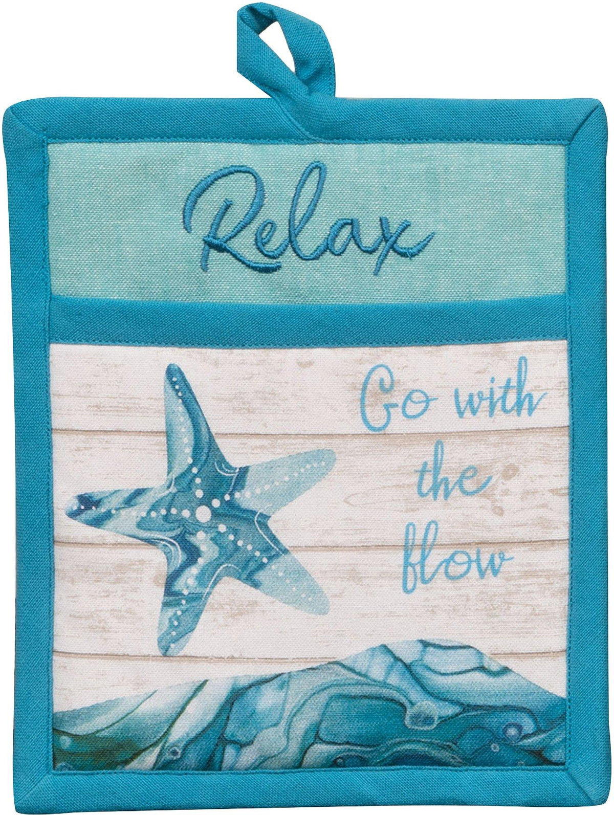 Add a touch of whimsy to your kitchen with this pocket mitt by Kay Dee Designs. Pocket mitt features a coastal starfish and Go With The Flow design, Relax embroidery, slip pocket on the front, and a loop for hanging. Measures 8”L x 8”W.
