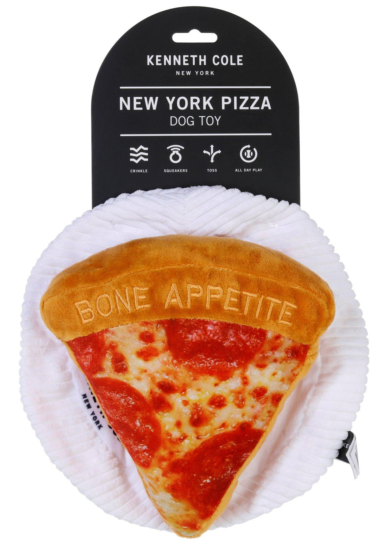 Serve up playful style with the Kenneth Cole Pizza on a Plate dog toy, featuring crinkle fabric in the plate and two squeakers in the plush slice for multisensory fun. Bone Appetite is embroidered on the crust for a cheeky touch. Ideal for light chewing, tugging or snuggling, its a fun pick for pups who love texture and sound. Measures approximately 9 in.
