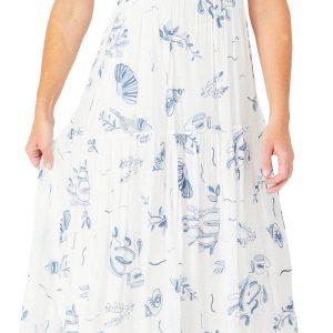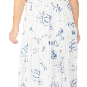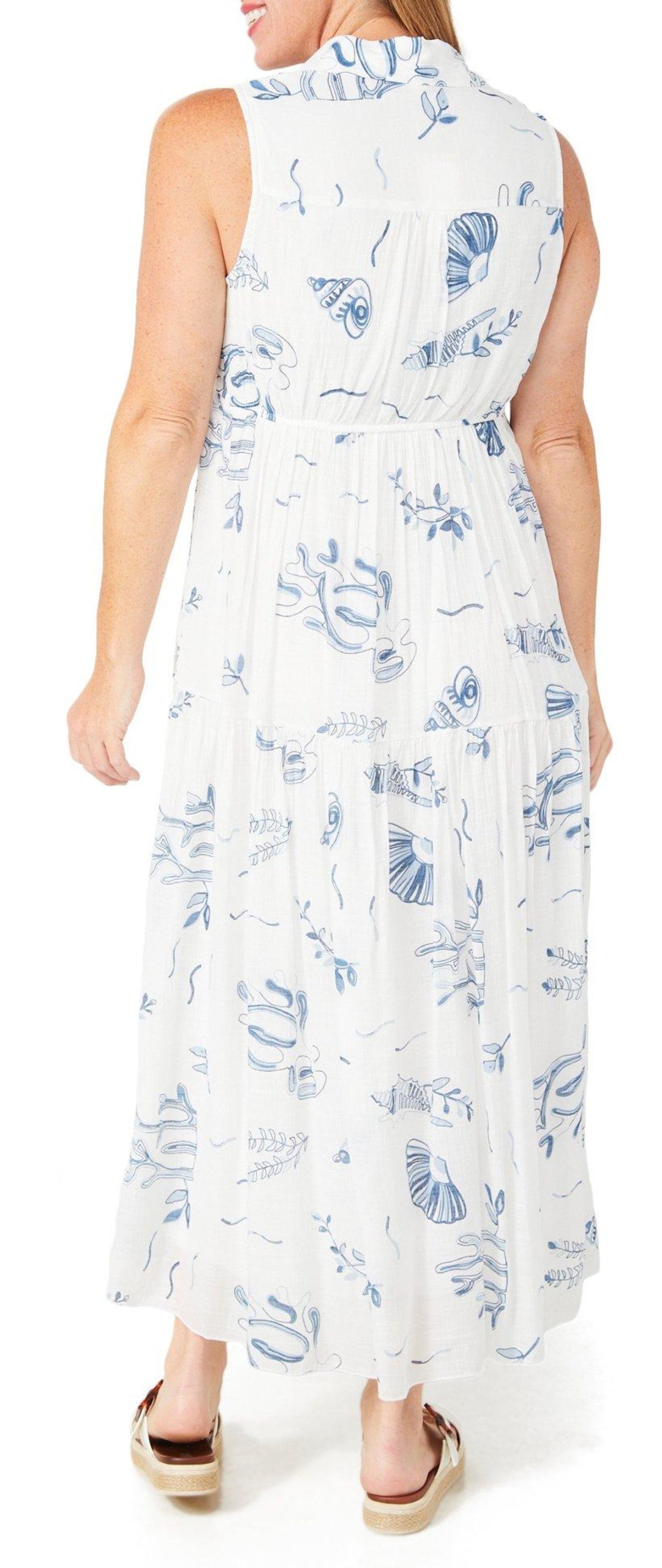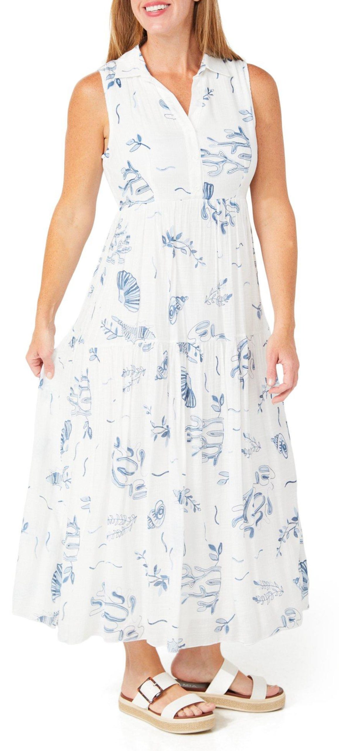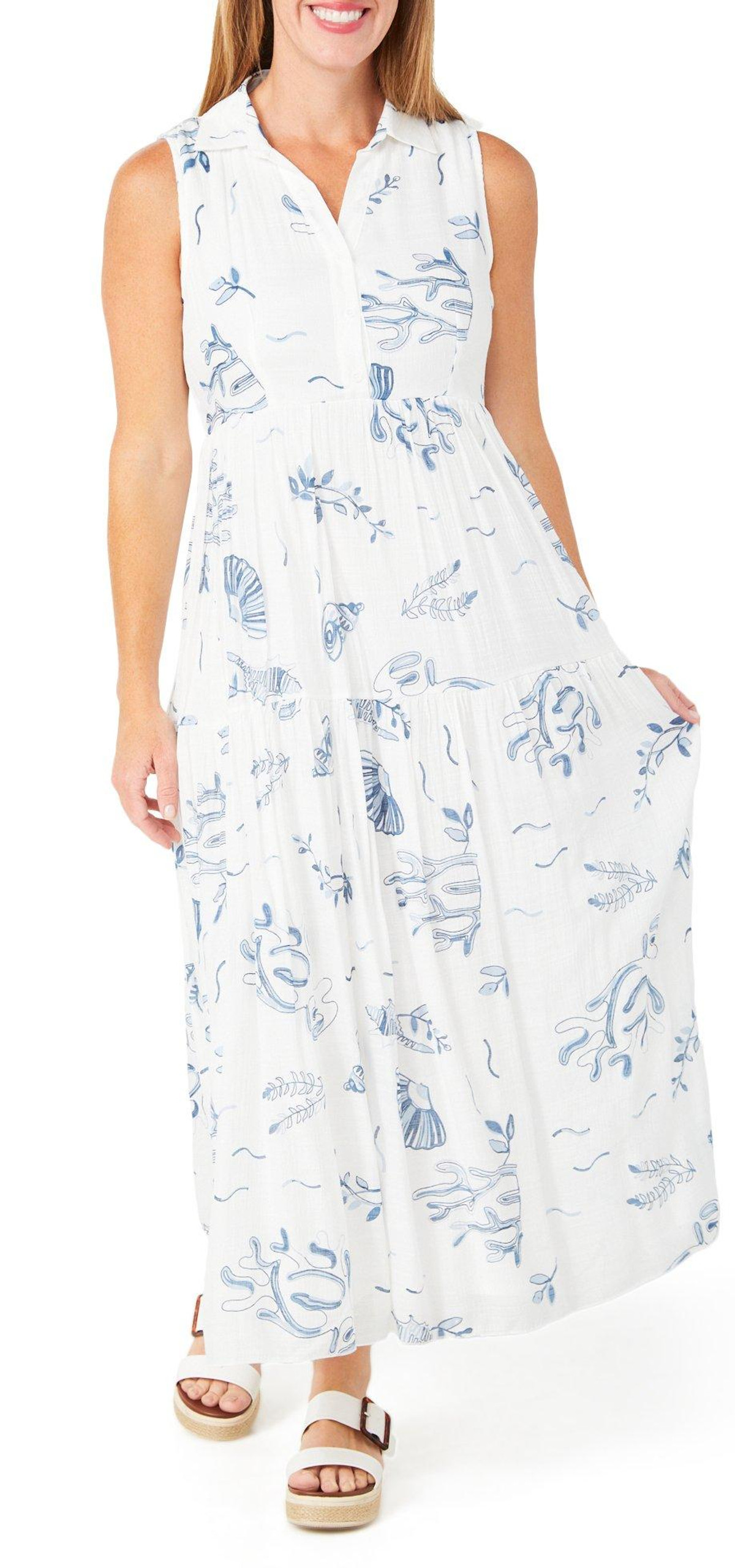 This womens long dress features a sleeveless design with a relaxed collar and split neck. The button front adds subtle detail while the flowy, lined fabric offers comfort and elegance for warm weather occasions. Fabrication is 58% rayon and 42% polyester.