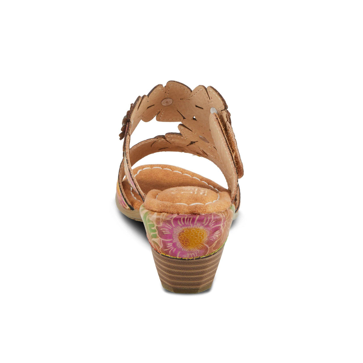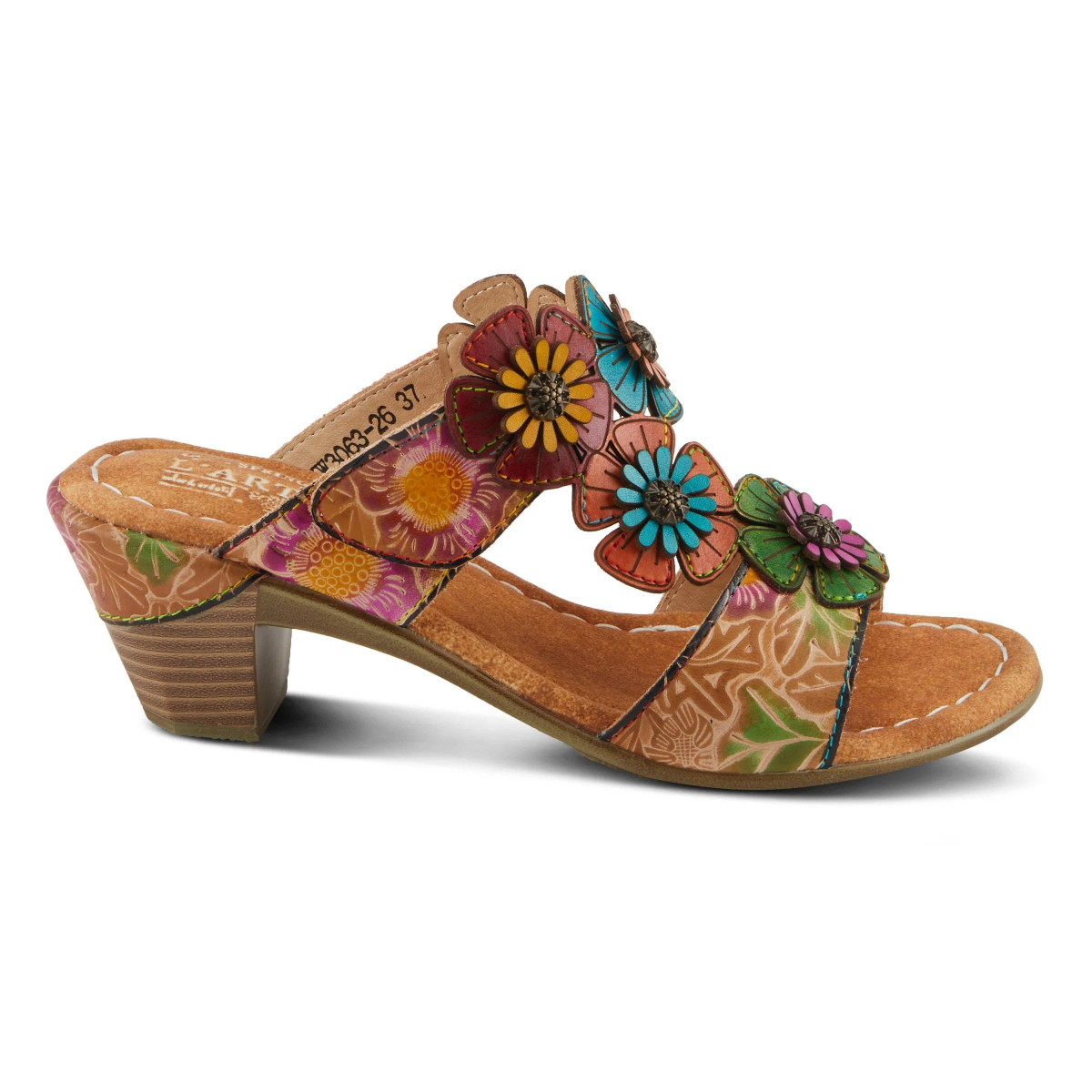 These unique, hand-painted sandals feature a leather wrap around the heel and a vibrant, multi-colored asymmetrical flower pattern on the upper.