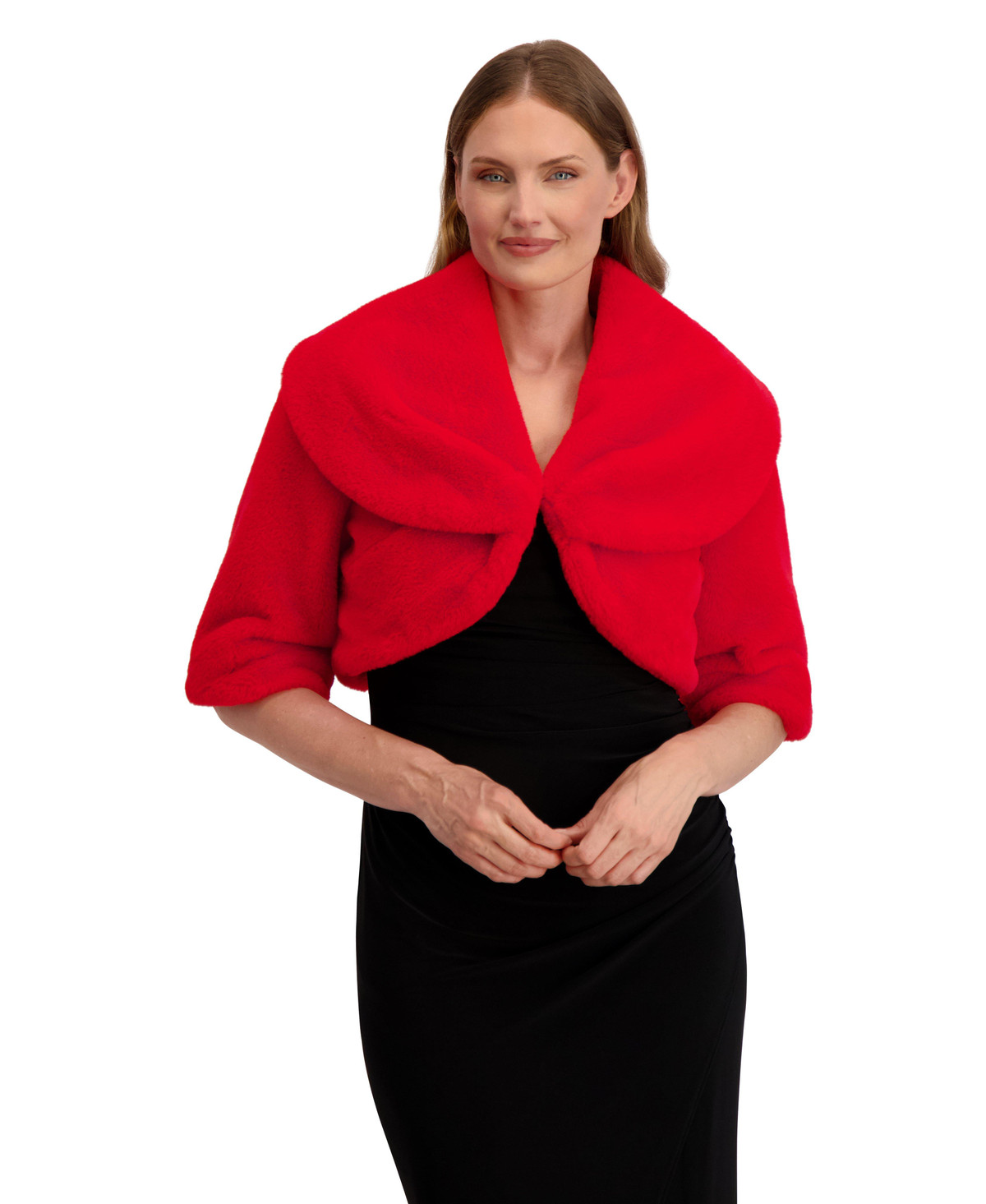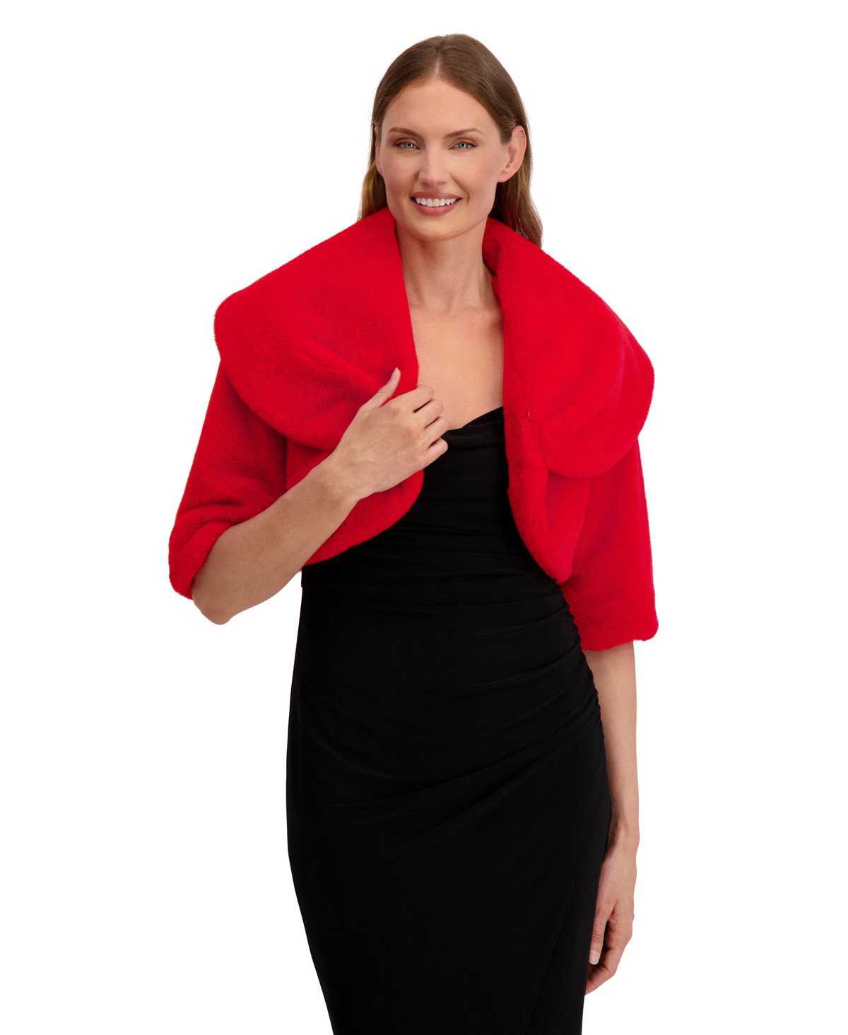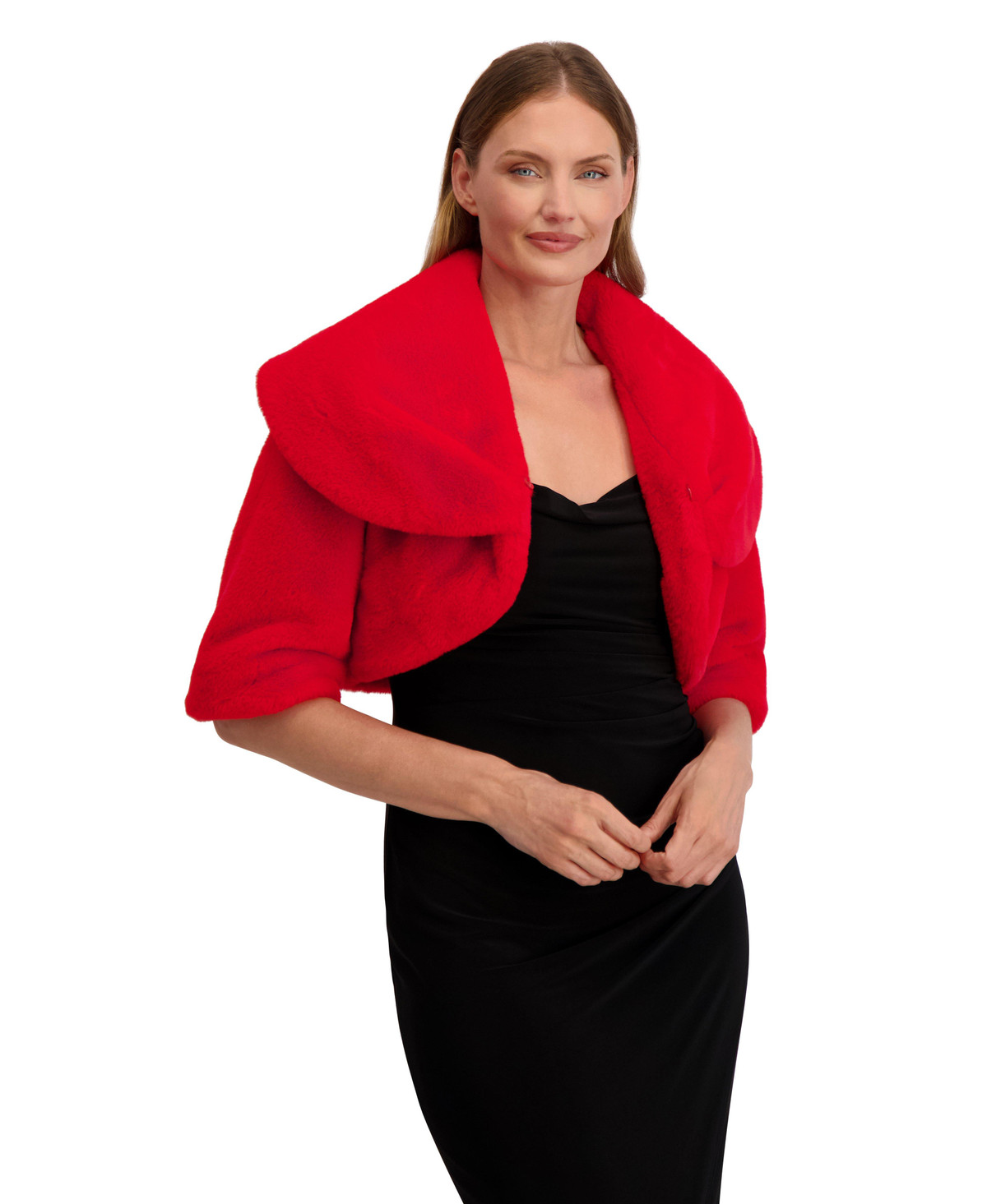 Elevate your cold-weather style with this ultra-soft faux fur shrug by Laundry by Shelli Segal. Featuring a wide collar, elbow-length sleeves, and a sleek hook-and-eye closure, its the perfect layer over your favorite slip dress. Chic, cozy, and effortlessly elegant. Shrug length measures 16 in.
