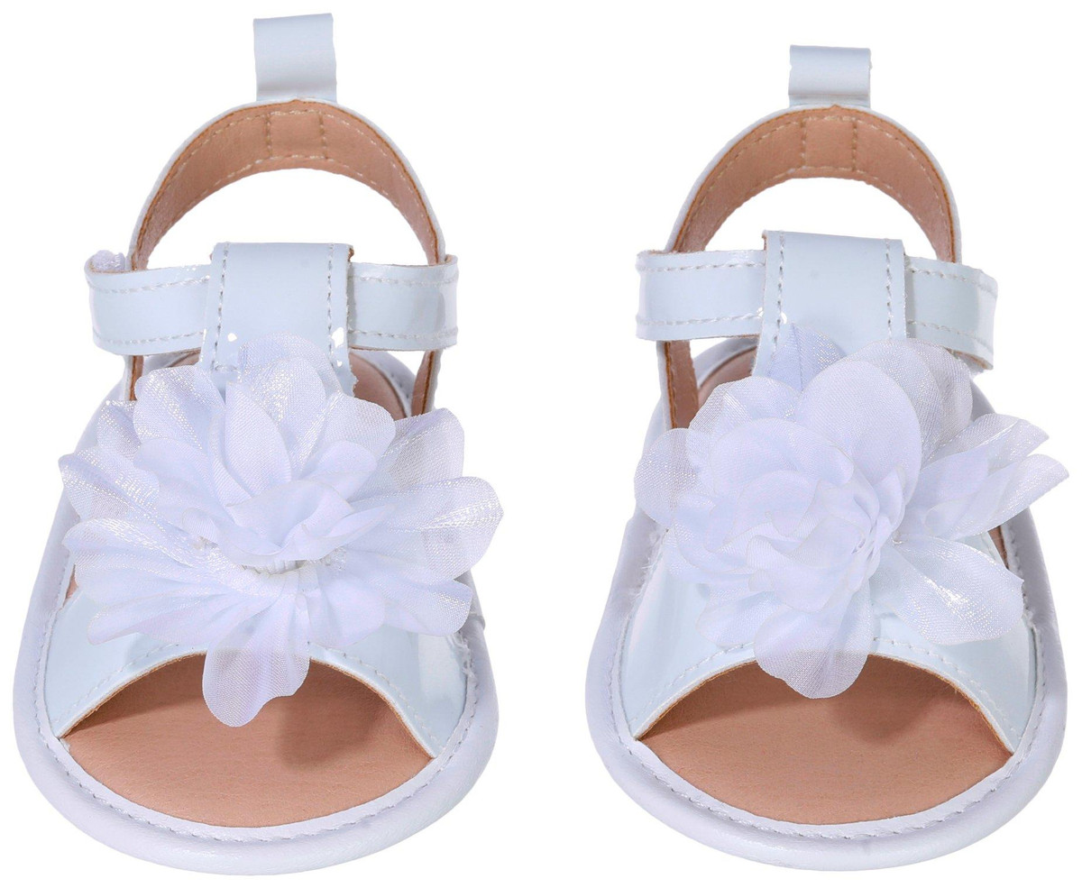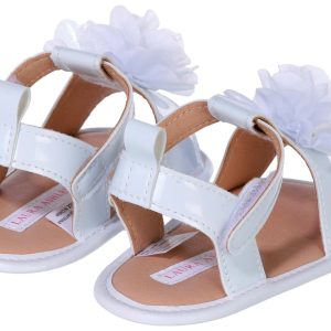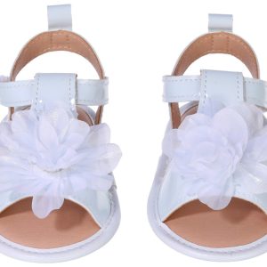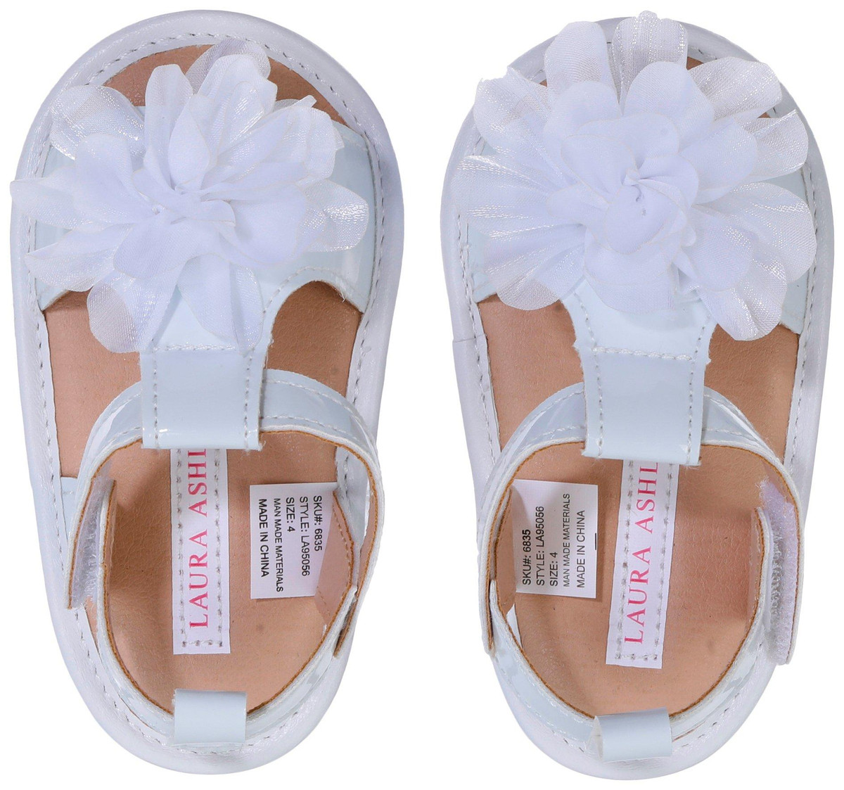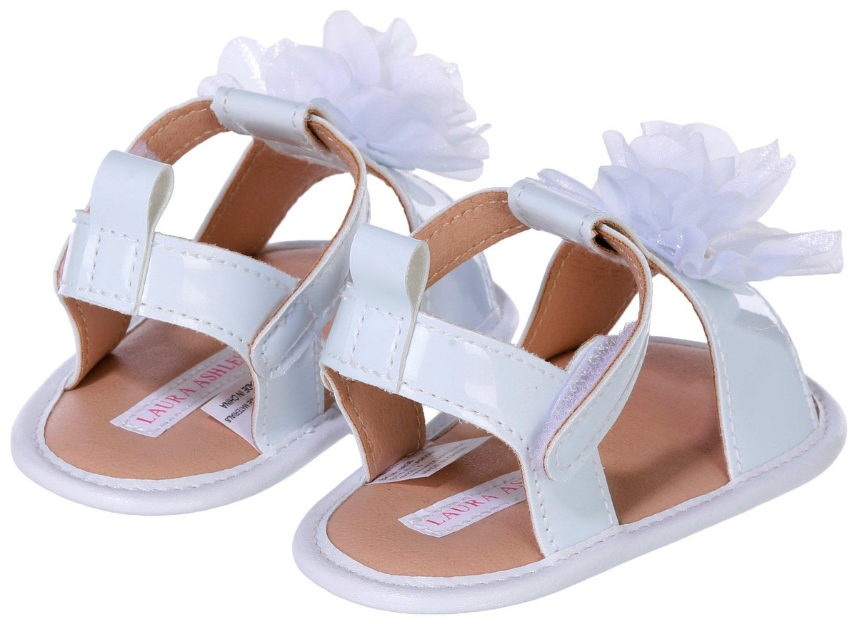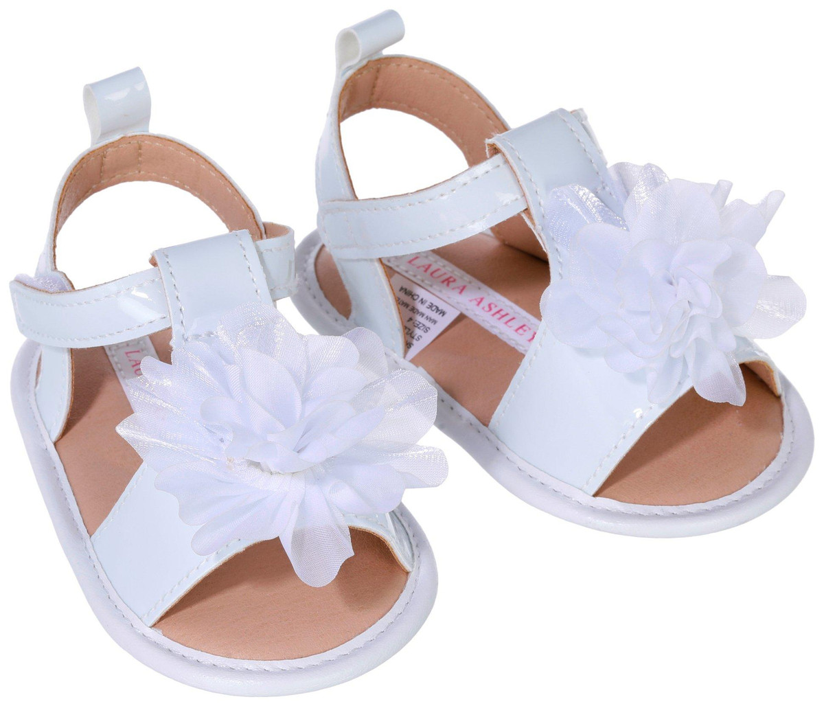 Add sweet charm to her steps with Laura Ashley Baby Girl Flower Sandals, featuring an open-toe design and soft velcro strap for easy on and off. A glossy, patent leather-like finish and a delicate flower accent on the toe add a dressy touch. Perfect for warm-weather outings, parties or everyday play with style.