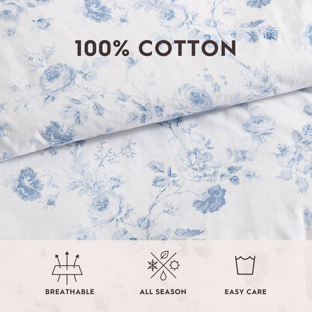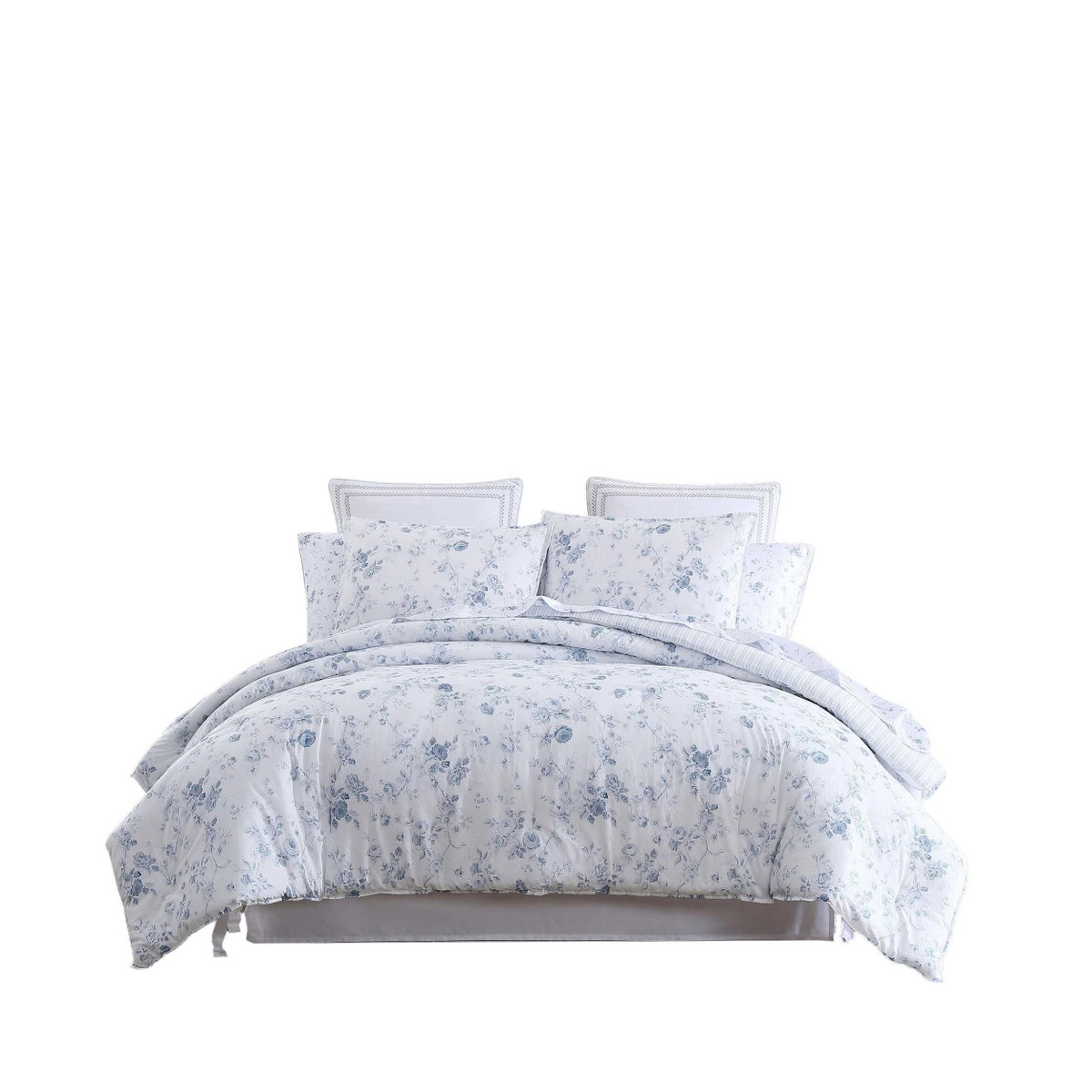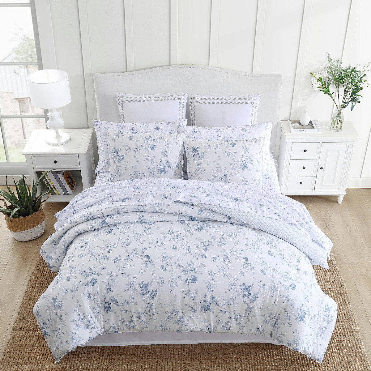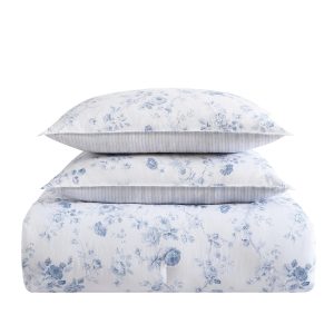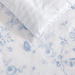 The Laura Ashley Belinda Comforter & Sham Set features a soft, feminine cottage rose print in classic blue on white. Reversing to a timeless shirting stripe, it blends beauty and versatility. Crafted for comfort and easy care, this set is machine washable in an extra-large capacity washer, perfect for adding a touch of floral charm to any bedroom.