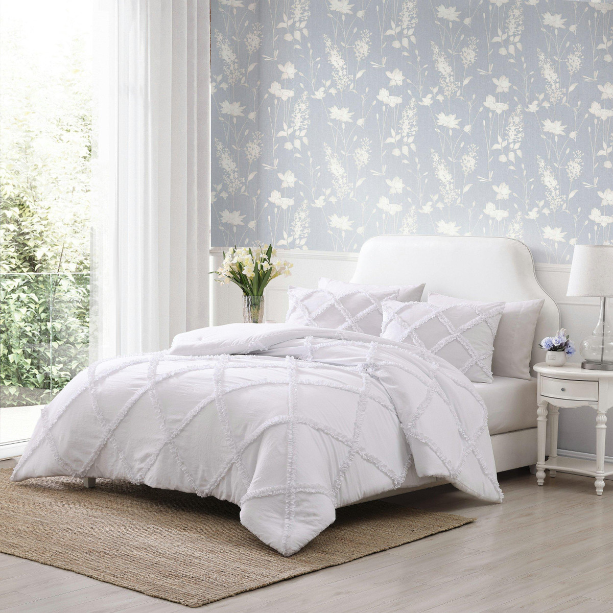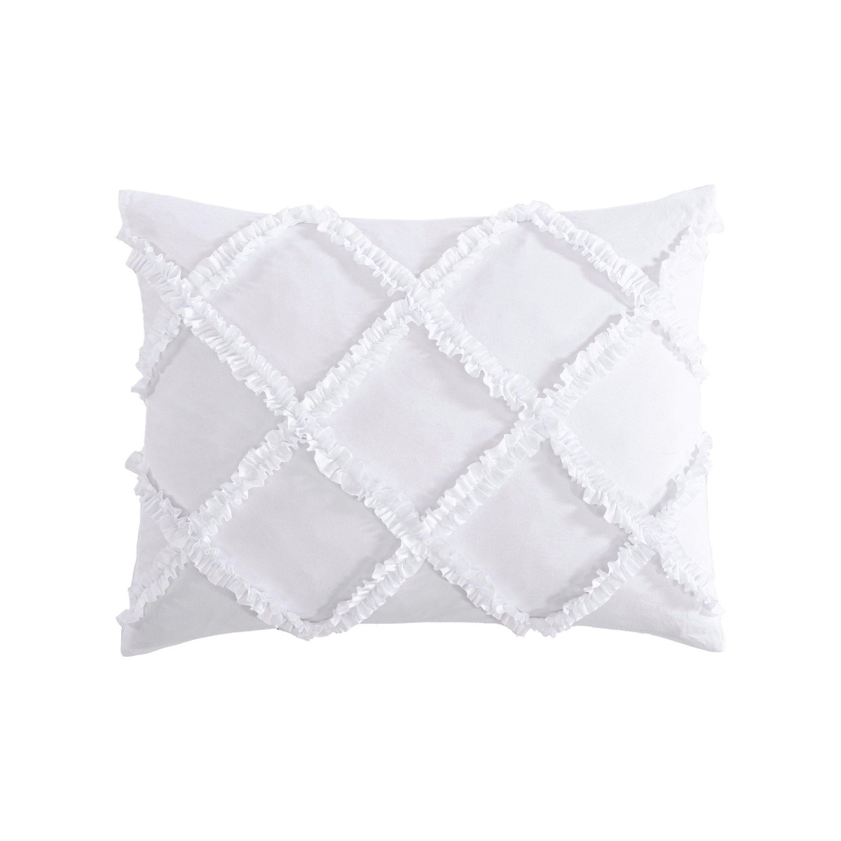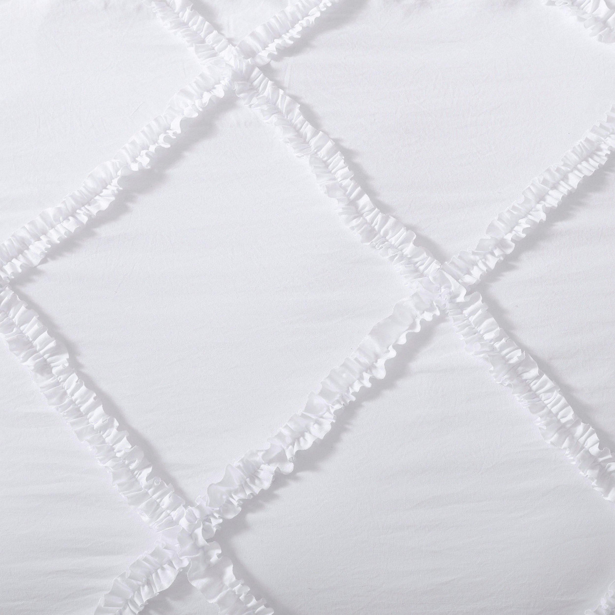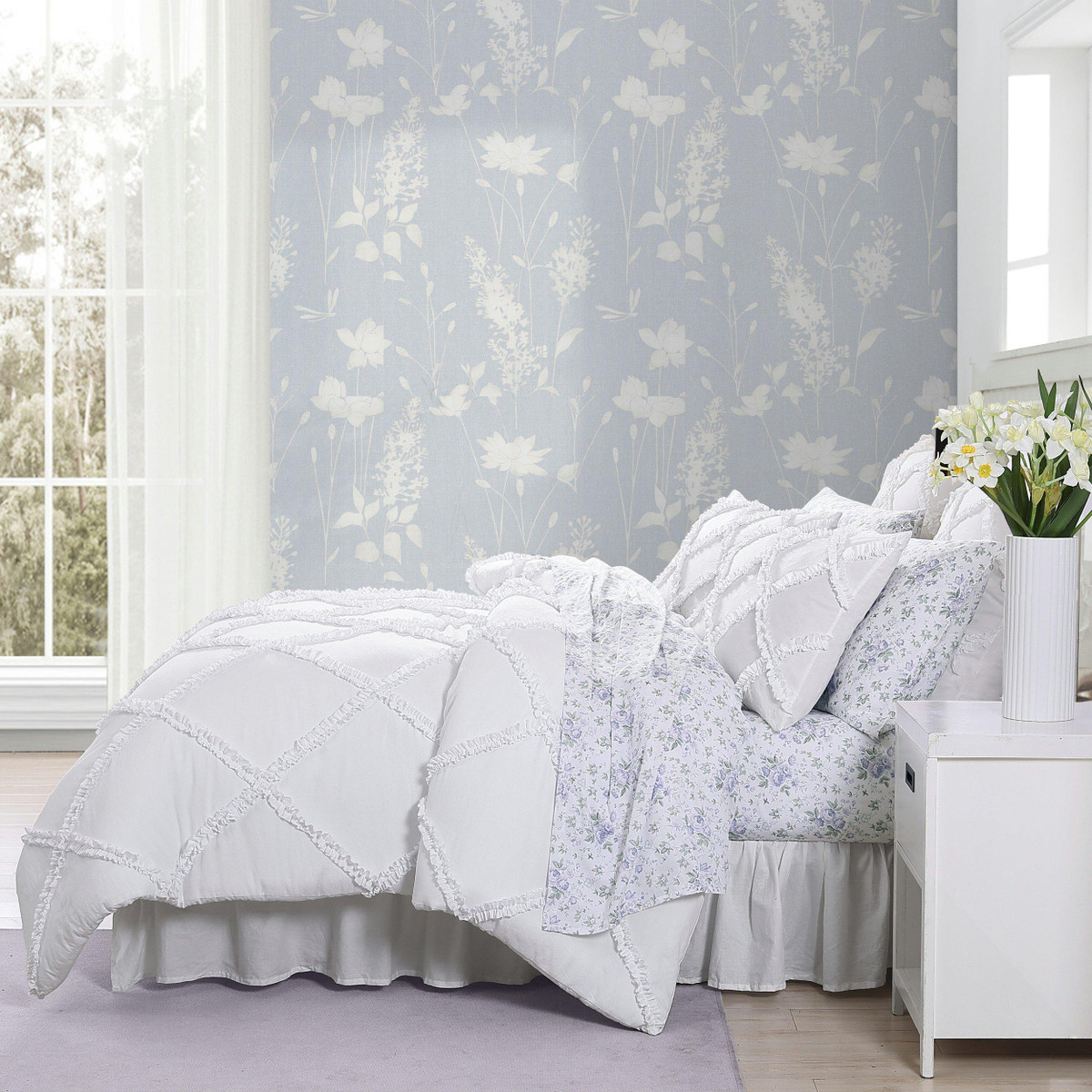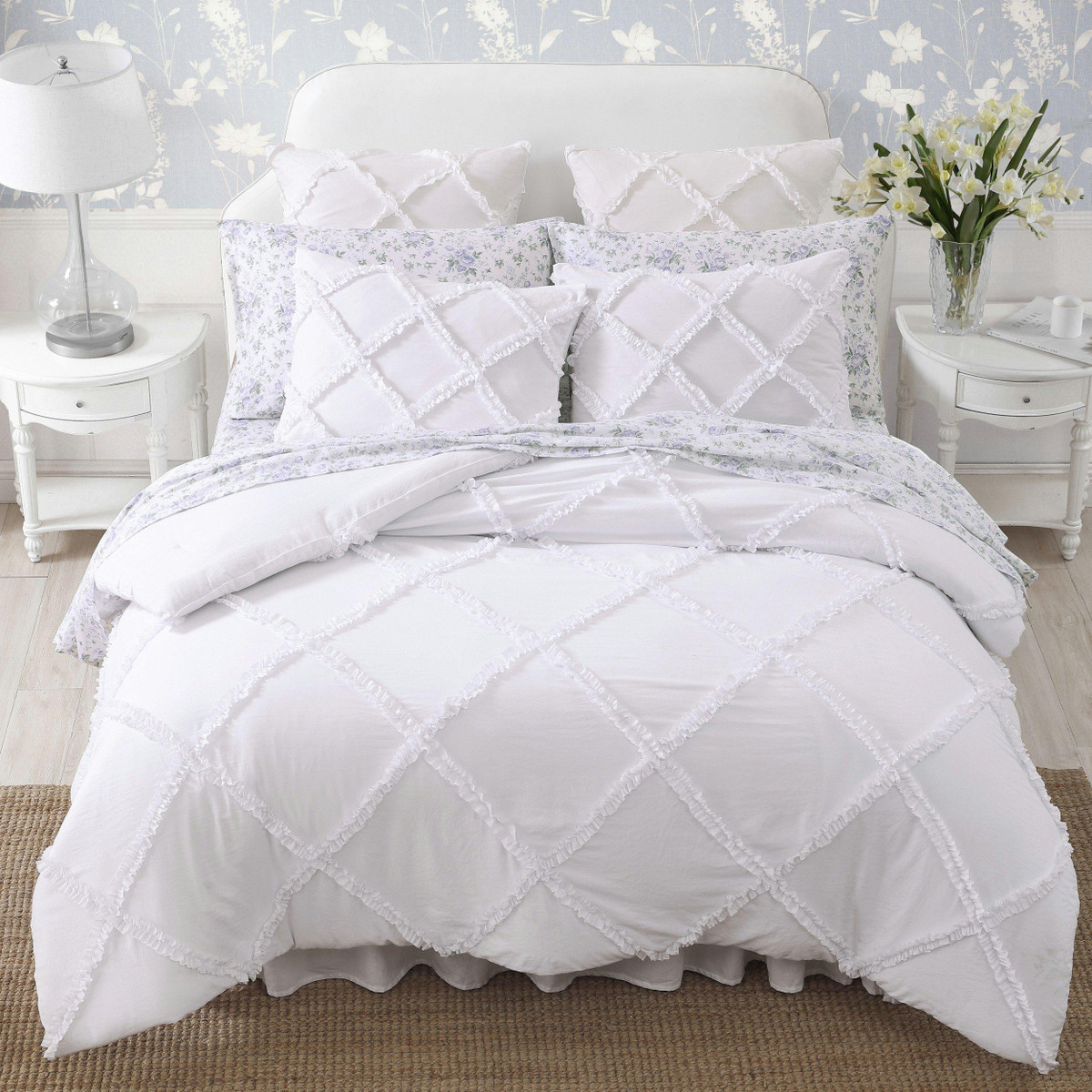 The Laura Ashley Norah Comforter & Sham Set exudes timeless elegance with romantic ruffles arranged in a diamond heirloom pattern. Crafted in soft, solid white microfiber, it offers a serene and versatile foundation for any bedroom. Lightweight and machine washable, it blends classic charm with effortless care, perfect for refined, layered styling.