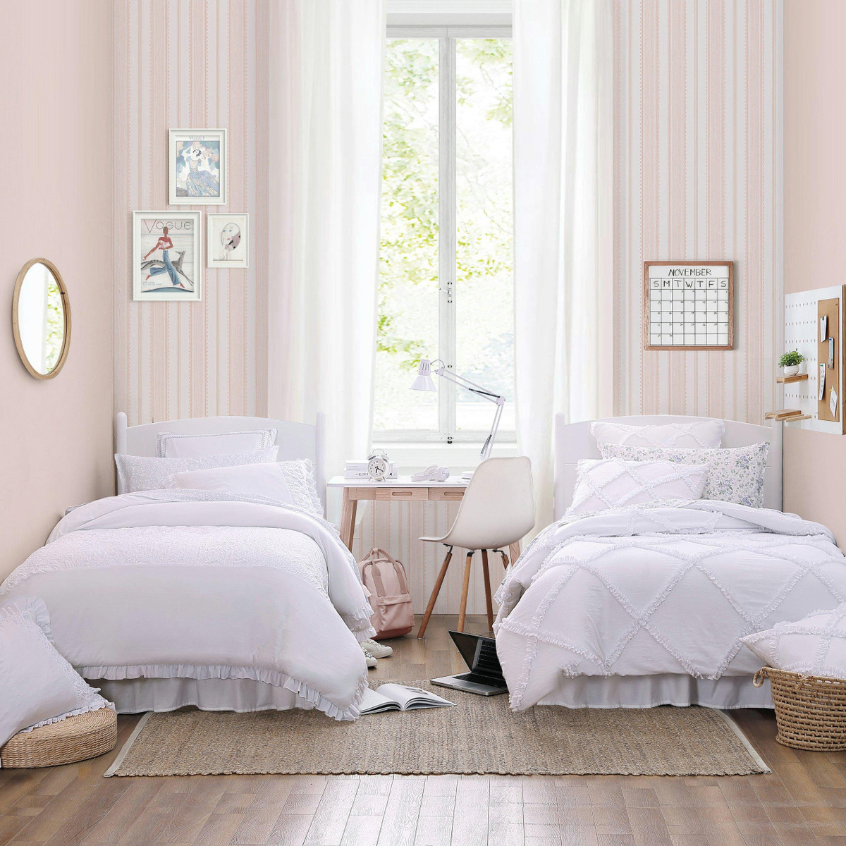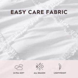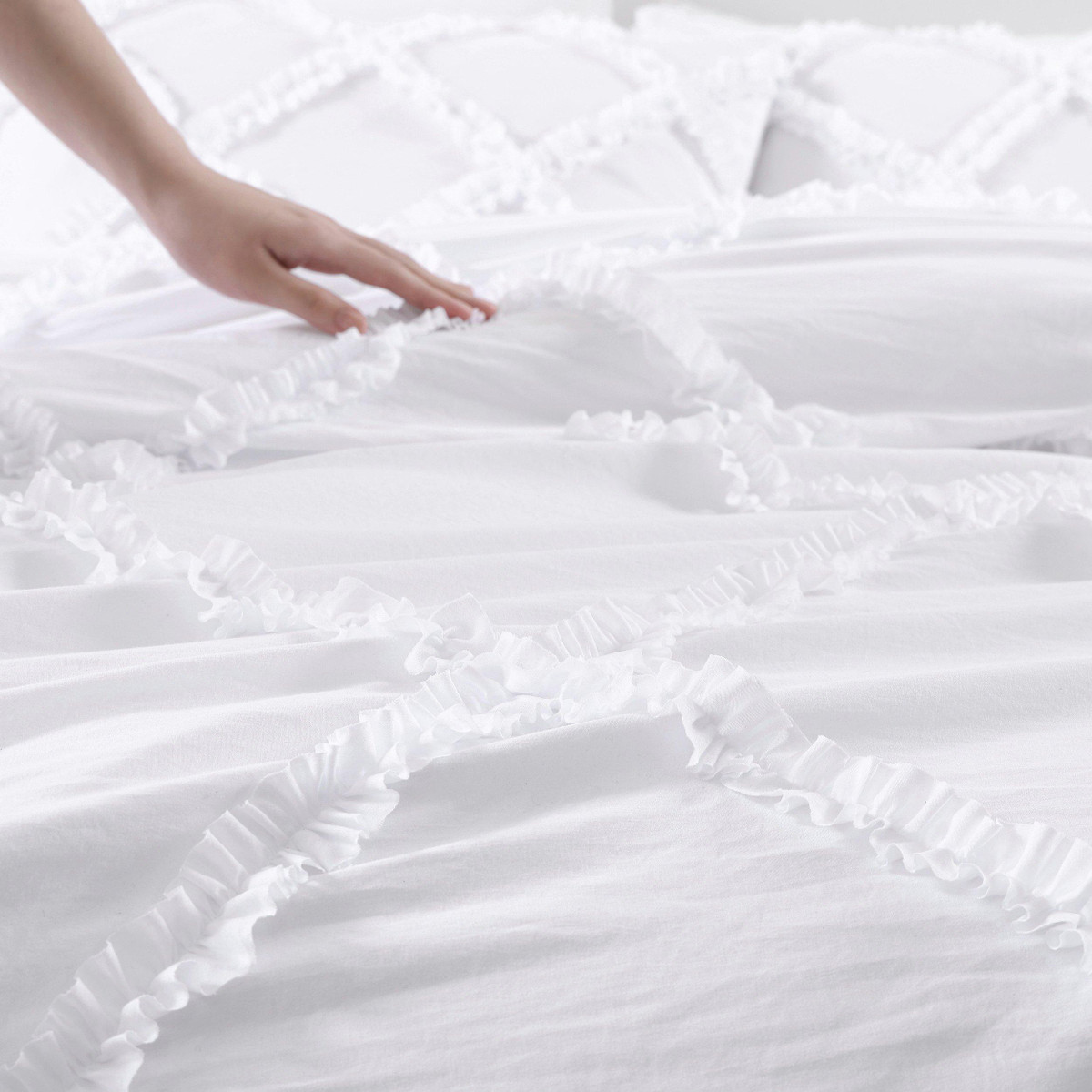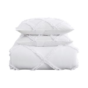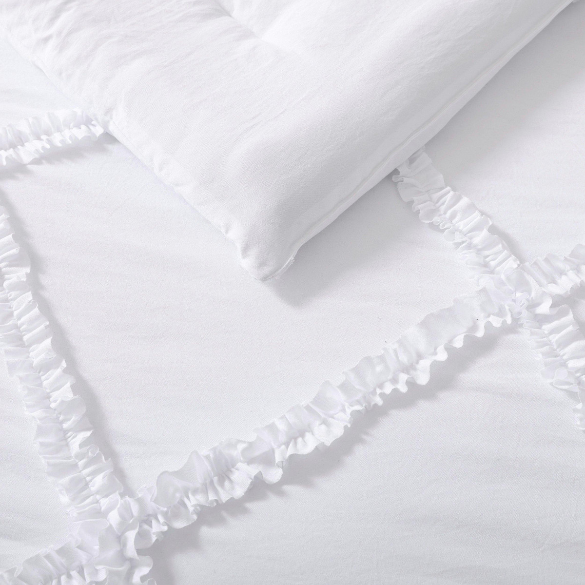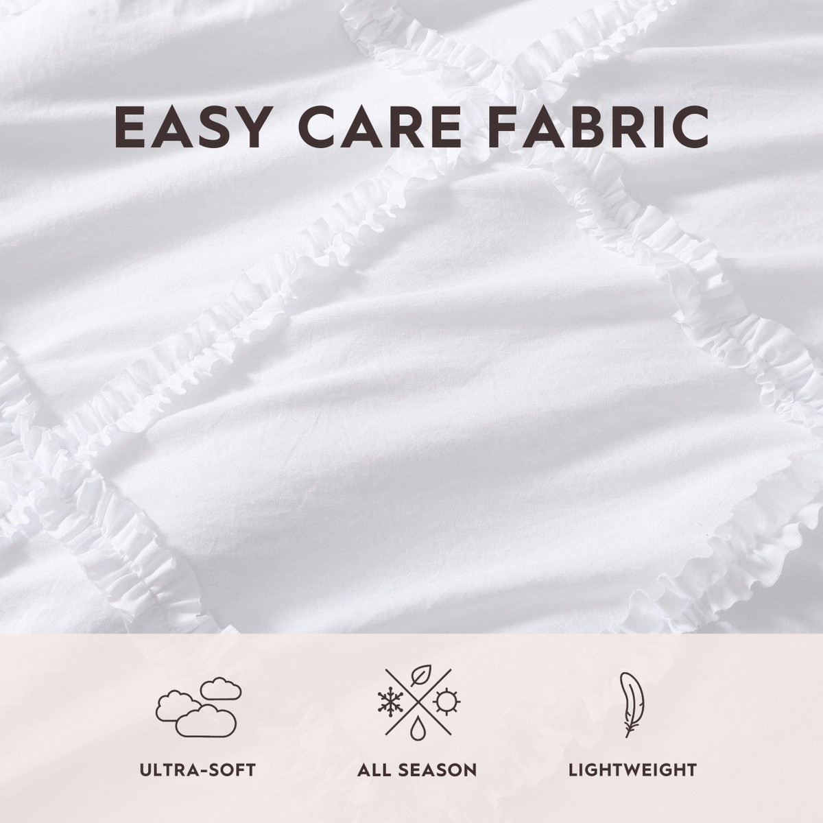 The Laura Ashley Norah Comforter & Sham Set exudes timeless elegance with romantic ruffles arranged in a diamond heirloom pattern. Crafted in soft, solid white microfiber, it offers a serene and versatile foundation for any bedroom. Lightweight and machine washable, it blends classic charm with effortless care, perfect for refined, layered styling.