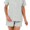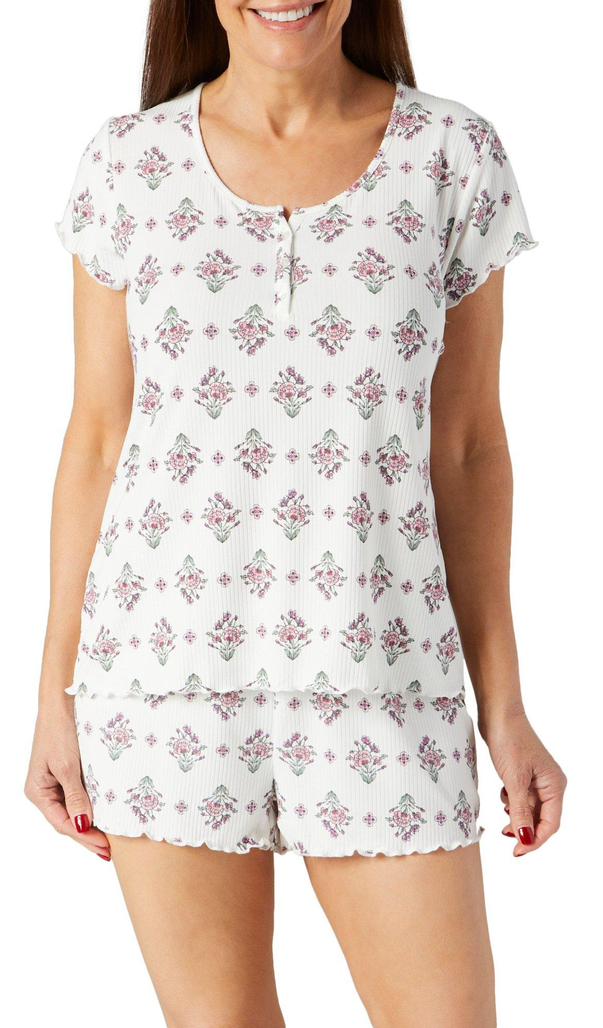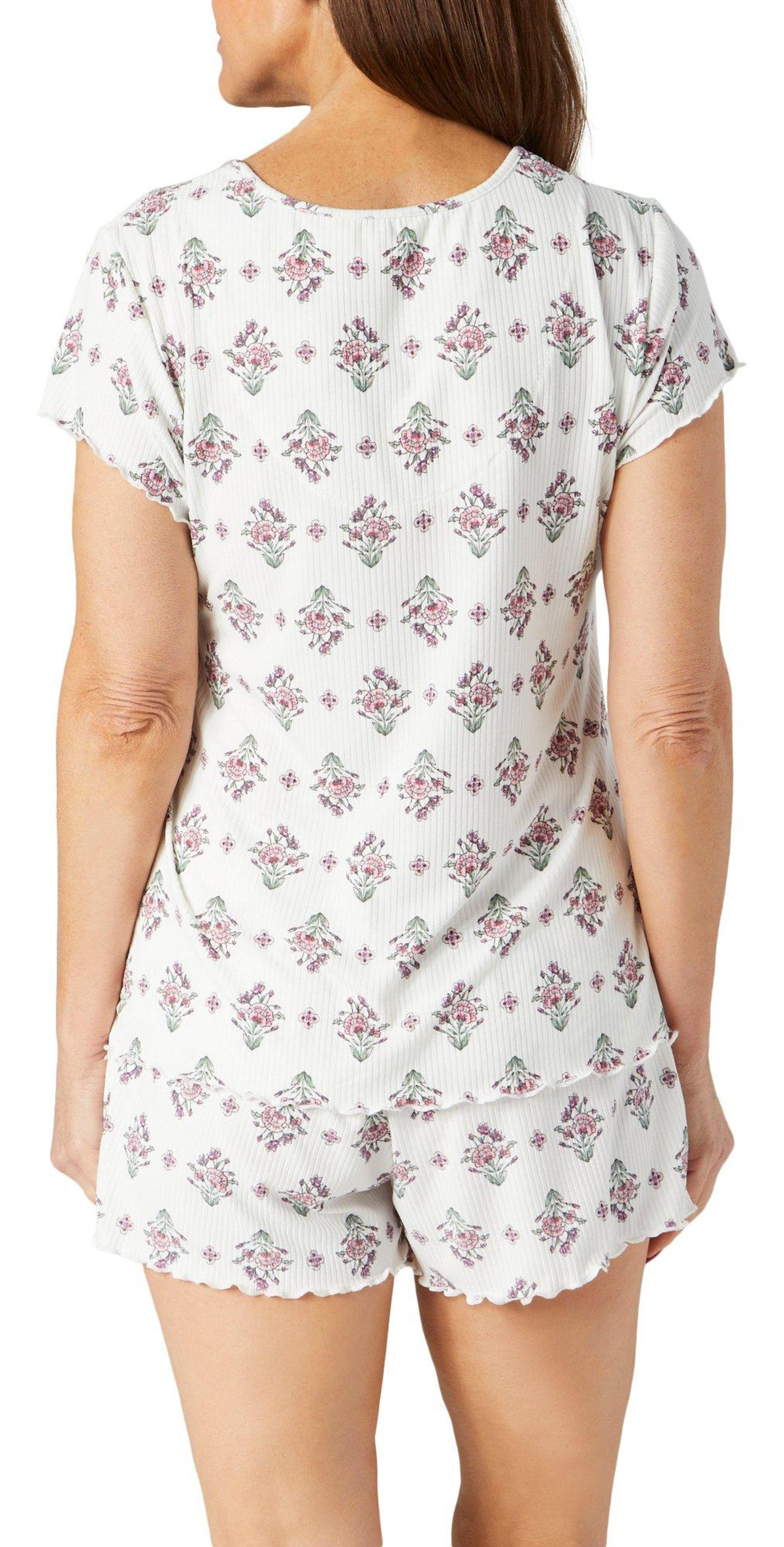 This sleepwear set features a print pattern on a lightweight knit fabrication. The short sleeve top features a split neck, a button down closure. The pull-on shorts feature an elastic waist and relaxed styling. The top measures approximately 24 in. The shorts inseam measures approximately 2 in. Fabrication is 94% polyester, 6% spandex.
