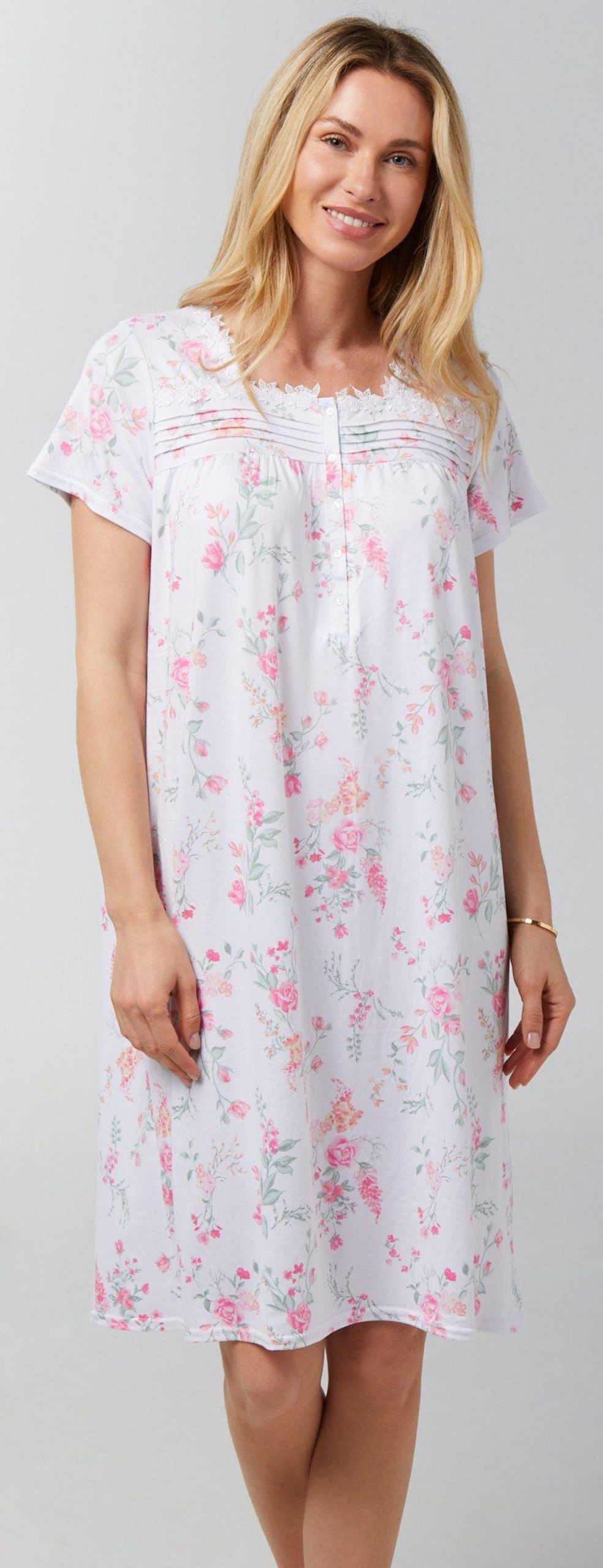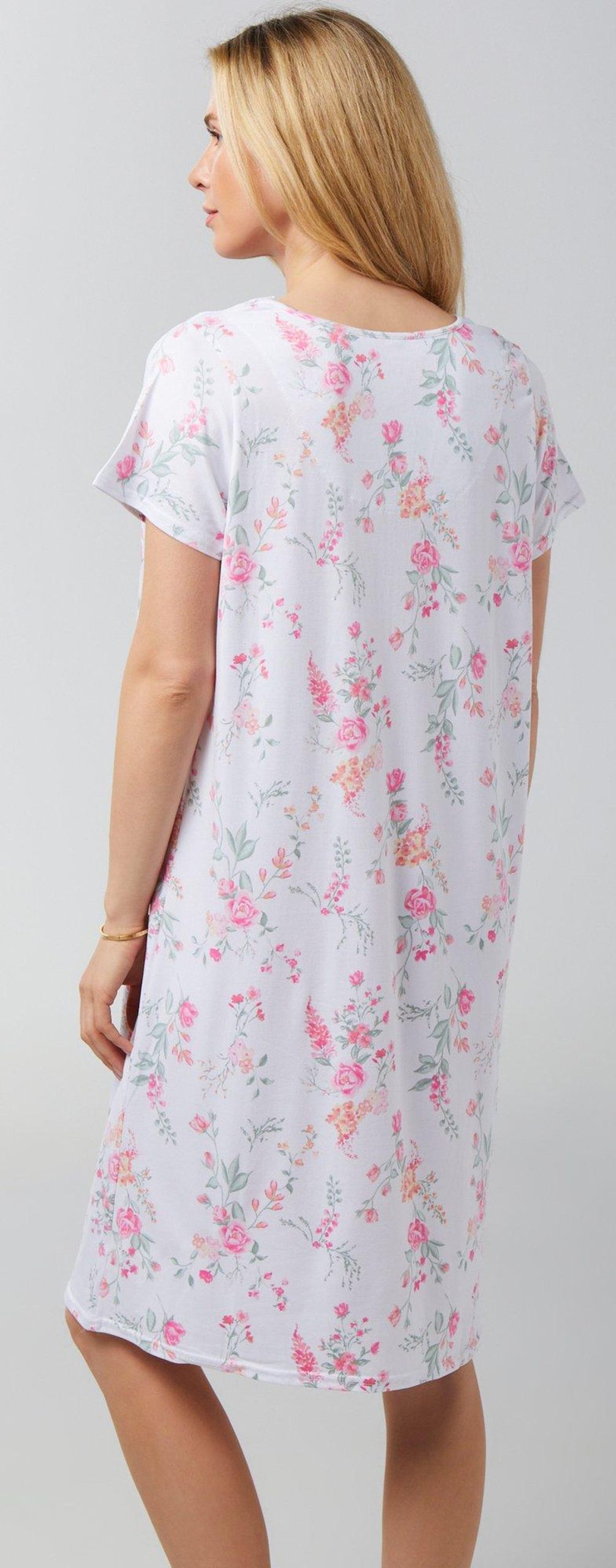 This short sleeve nightgown features a floral print design on oh-so-soft lightweight knit fabric, a square neckline, front stitching and a relaxed fit. Length measures approximately 40 in. Fabrication 90% polyester, 10% spandex.