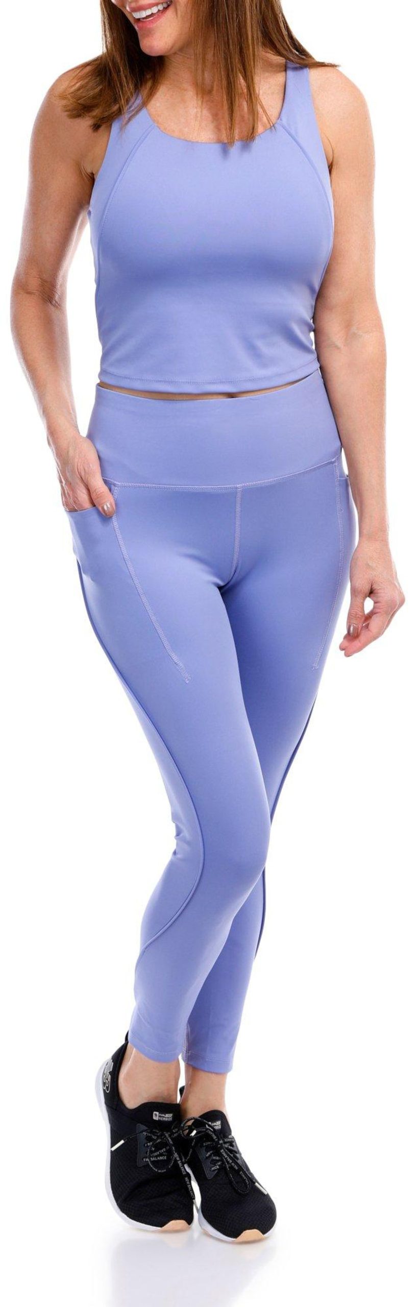 Introducing the 2-piece Perfect Piping Tank and Legging Set the ultimate activewear ensemble for style and performance. This set features a tank with a built-in bra and removable pads for customizable support, paired with leggings that offer 4-way stretch for maximum flexibility. The flattering seam lines enhance your silhouette, making you look and feel great during any workout. Inseam measures 25 in.