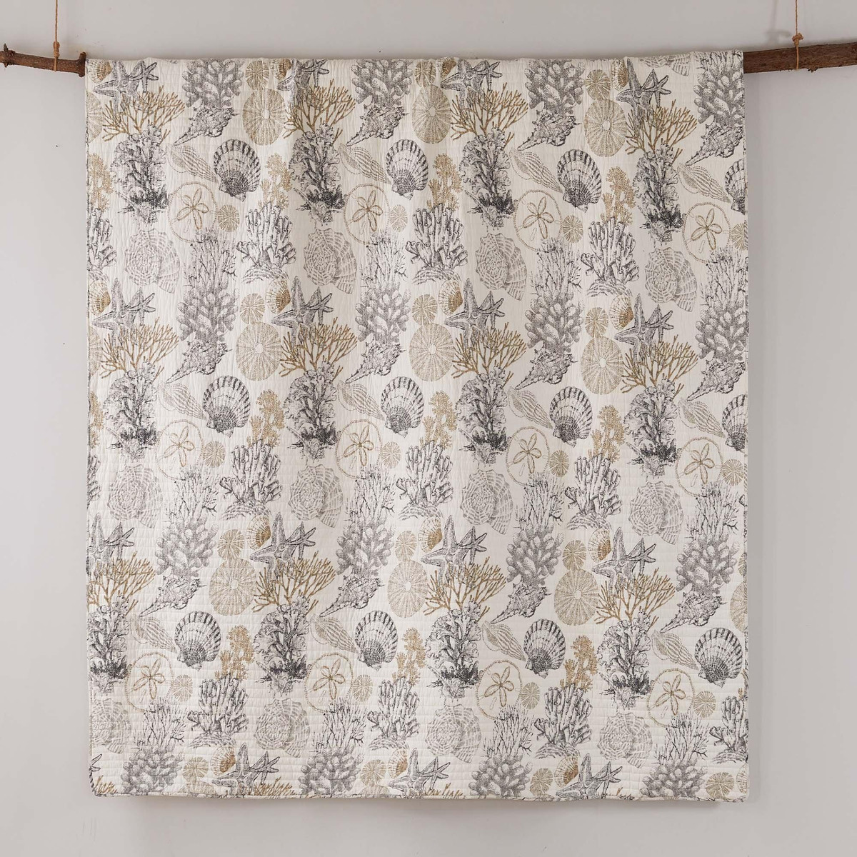 Escape to the coast with the Caspian Sea Reversible Quilt and Sham Set by Levtex Home. Inspired by a sun-kissed island getaway, it features starfish, shells, and coral in taupe and grey on a cream background. The reverse reveals soft coastal stripes in cream, grey, and taupe. Made from the softest lightweight cotton and machine washable, this nautical bedding set brings ocean-inspired comfort and style to your bedroom.