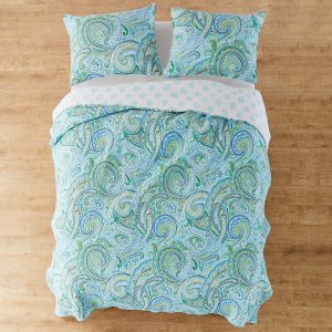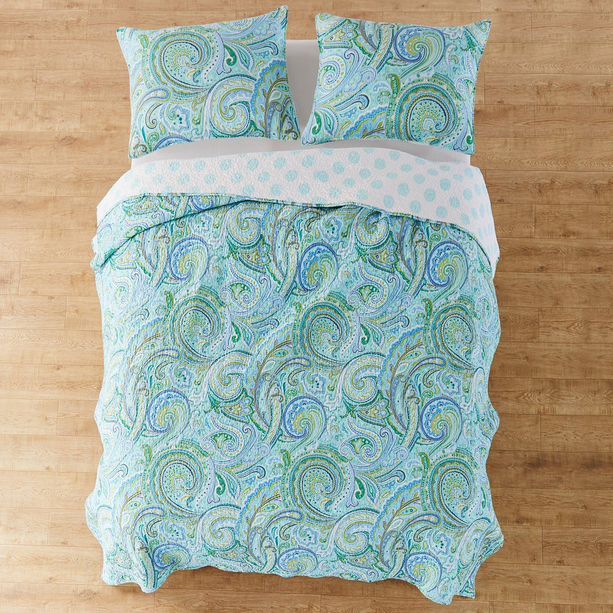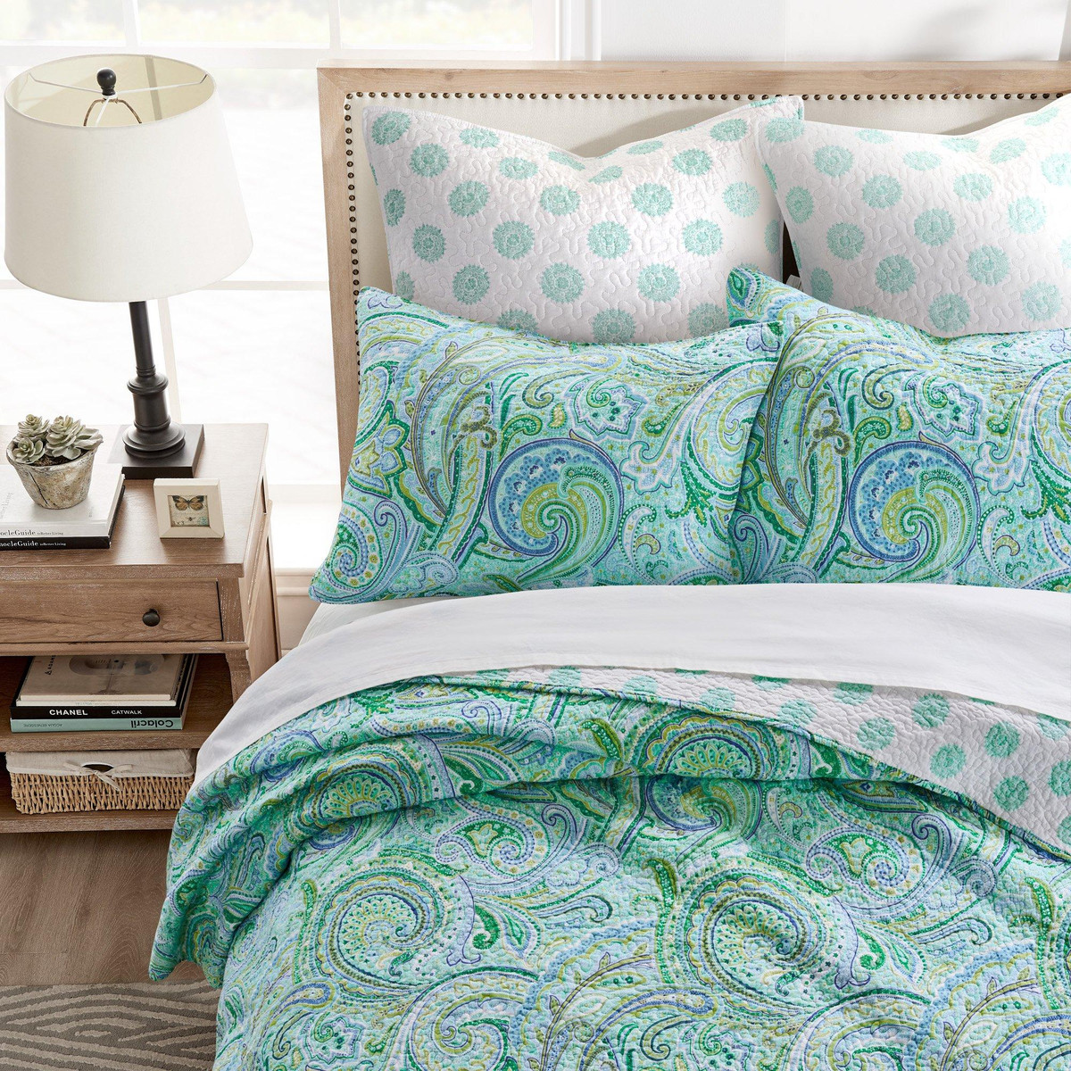 Brighten your space with the Darjeeling Teal Reversible Quilt and Sham Set by Levtex Home. Inspired by traditional paisley, it features rich teals, greens, and blues in an intricate design on one side, and a teal medallion pattern on the reverse. Made from soft, lightweight cotton with a cotton-rich fill, its cozy, colorful, and machine washable. Perfect for a vibrant bedroom refresh.