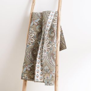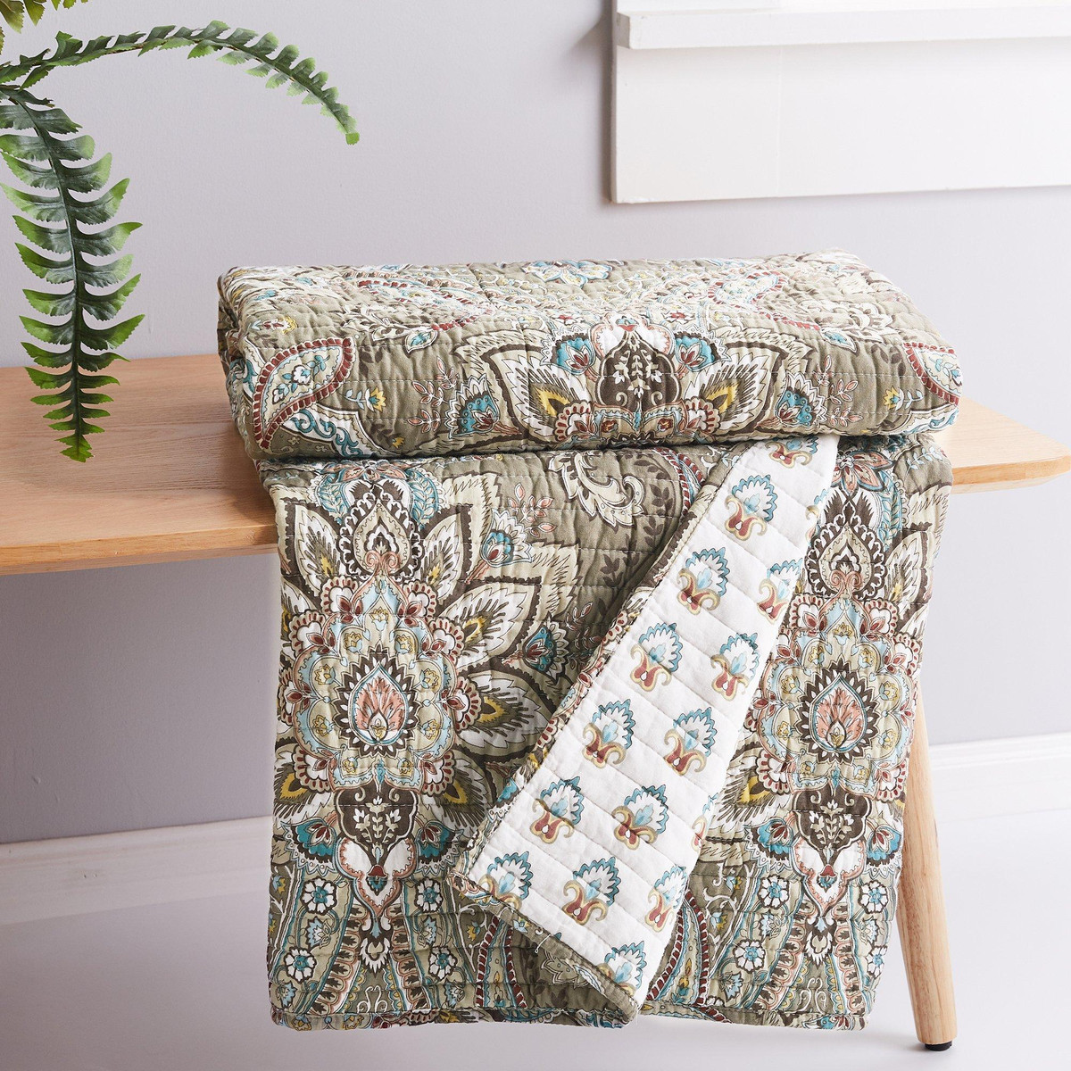 Elevate your space with the Kassandra Reversible Quilted Throw by Levtex Home. Inspired by opulent European tapestries, it showcases a grand medallion motif in taupe and beige with rich accents of red, teal, and green. The reverse reveals delicate mini-medallions on a cream backdrop. Crafted from ultra-soft, lightweight cotton, it offers timeless elegance and comfort. Measures 50 in. x 60 in.