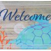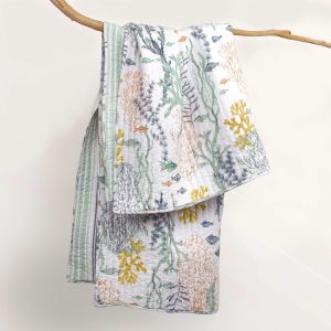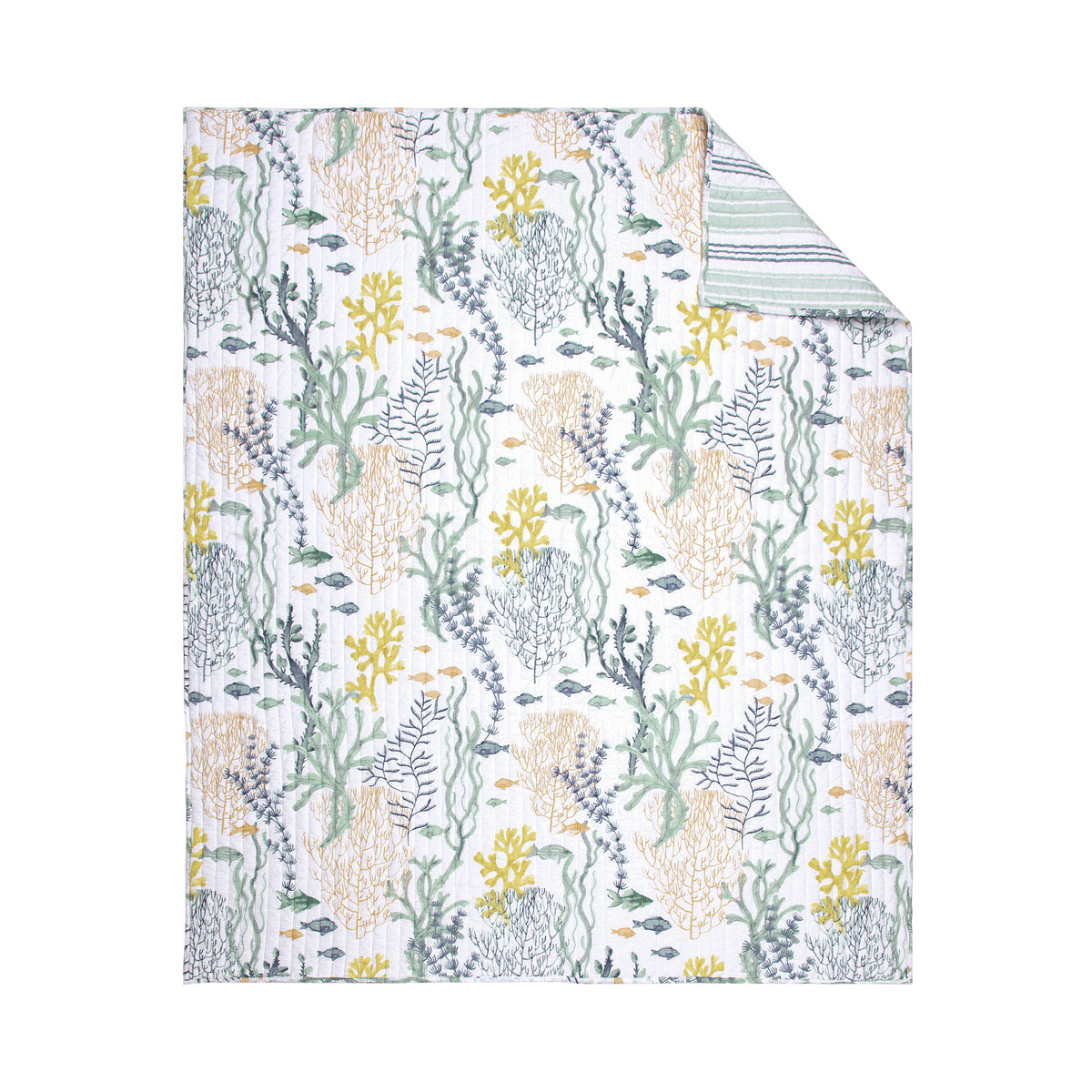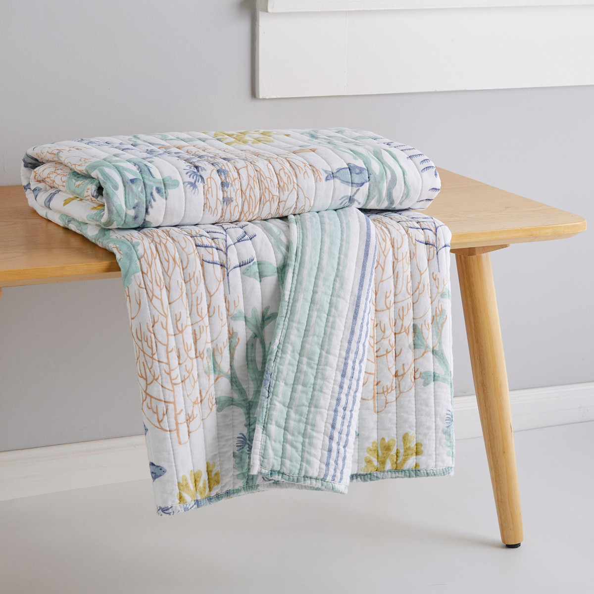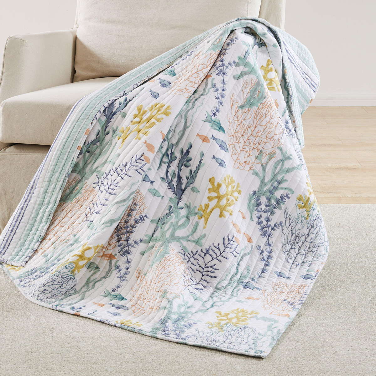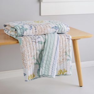 Immerse your space in coastal beauty with the Ocean Meadow Reversible Throw by Levtex Home. Bursting with vibrant fish and coral in teal, blue, coral, white, and ochre, the front evokes an underwater paradise. Flip it to reveal serene teal and blue stripes for a fresh, nautical look. Crafted from soft cotton with a cozy cotton-rich fill, this throw is machine washable, perfect for adding ocean-inspired charm and comfort to any room. Measures 50 in. x 60 in.