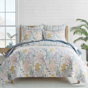 Drift into a seaside dream with the Ocean Meadow Reversible Quilt and Sham Set by Levtex Home. Featuring vibrant coral reef life in teal, blue, coral, and ochre, it brings oceanic charm to your space. The reverse reveals soothing teal and blue stripes on white. Crafted from soft cotton with a plush cotton-rich fill, its as refreshing as a sea breeze. Machine washable for easy care.