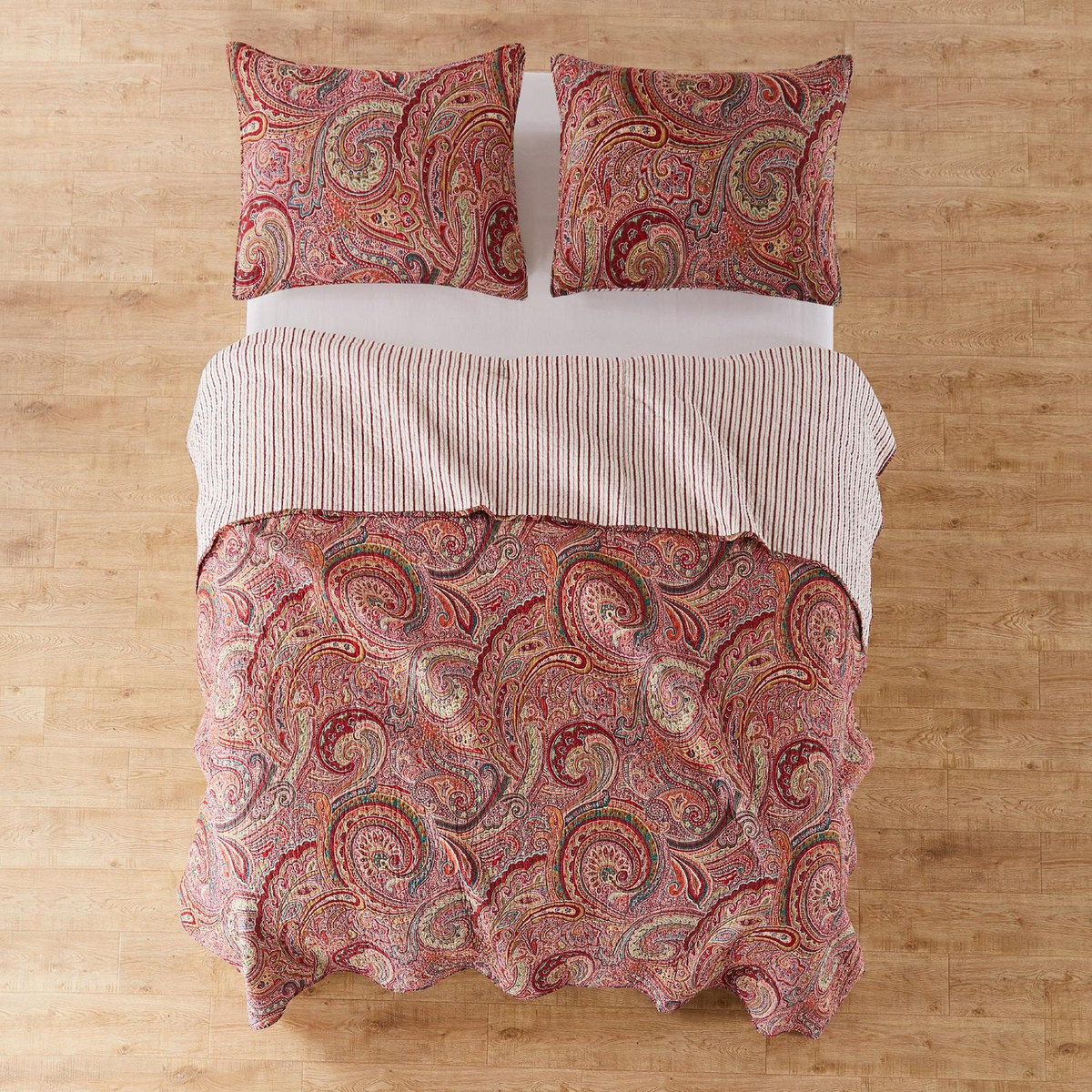 Wrap your space in warmth and elegance with the Spruce Red Reversible Quilt and Sham Set by Levtex Home. Crafted from soft, lightweight cotton, it features a rich, intricate paisley design in deep burgundies, reds, and tans. Flip it to reveal a timeless red stripe for a fresh look. This machine-washable set blends traditional charm with modern comfort, adding a sophisticated, colorful touch that transforms any bedroom or bathroom.