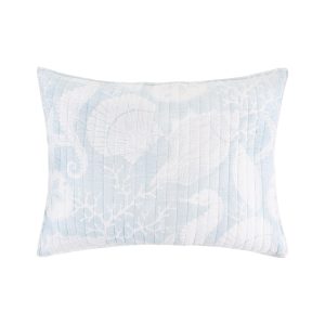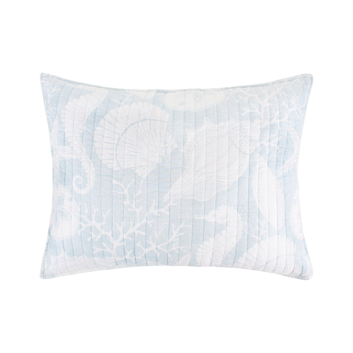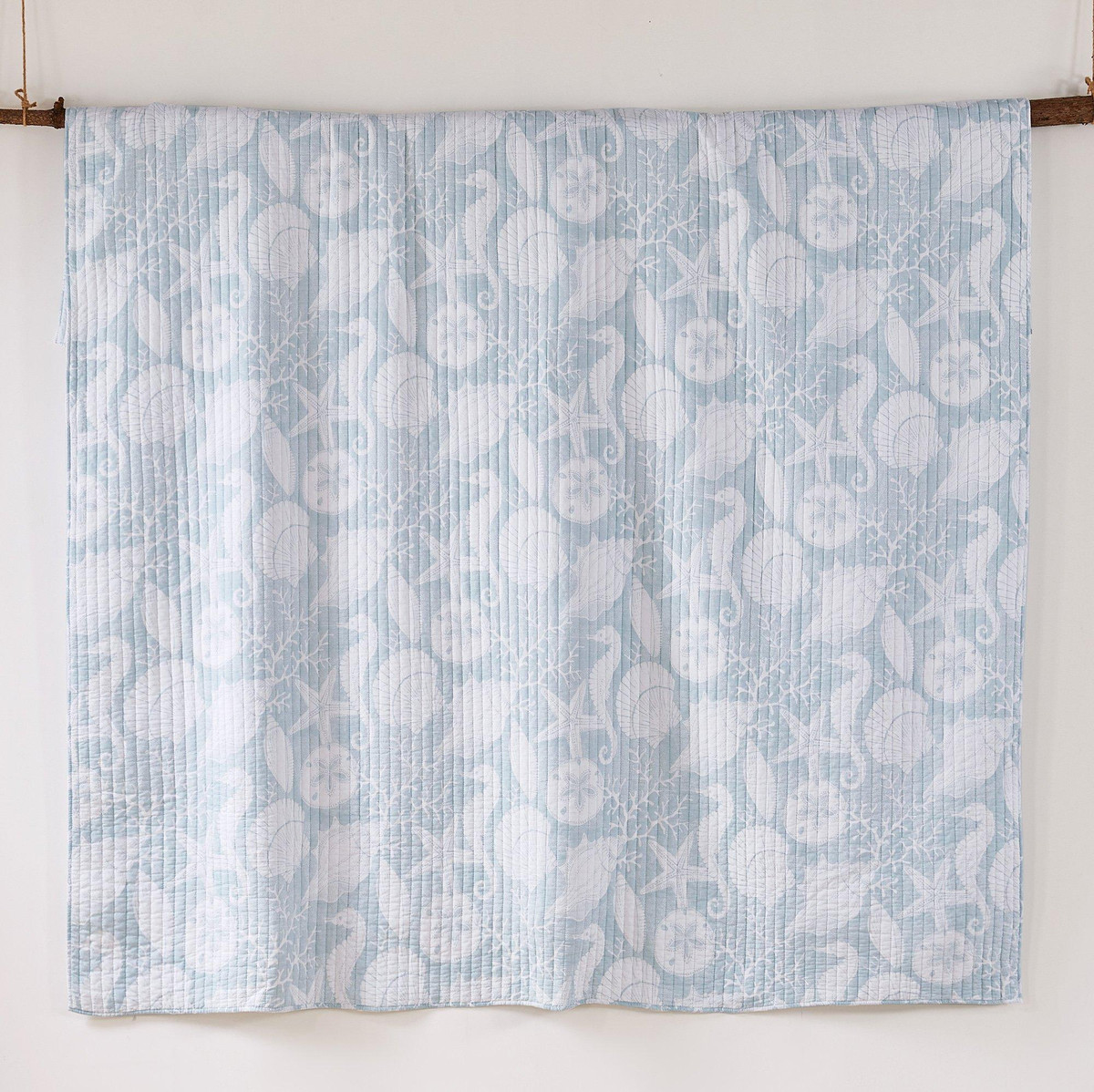 Bring coastal charm to your bedroom with the Stillwater Reversible Quilt and Sham Set by Levtex Home. Inspired by sunlit shorelines, it features intricate coral and shell patterns in off-white on a pale blue background. The reverse offers a classic blue and white stripe. Made from the softest lightweight cotton and machine washable, this beach-inspired bedding set delivers comfort, style, and a refreshing ocean vibe.