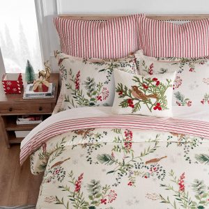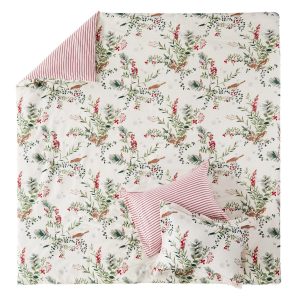 The Winterberry Forest Duvet Cover Set by Levtex Home is inspired by a classic holiday. Offered in green, red, grey and cream, this design will immediately transform your bedroom. Made with a soft and luxurious cotton, this duvet cover set features an idyllic nature scene. It has an array of leafy branches with spruce needles, flowers, berries and songbirds on the front and a classic red and white stripe on the reverse. It closes with easy to use, durable buttons. Machine washable.
