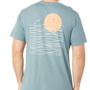 This mens tee features a soft cotton build with a bold sunset graphic on the back. Designed for casual comfort and laid back style with a touch of visual flair. Fabrication is 100% cotton.