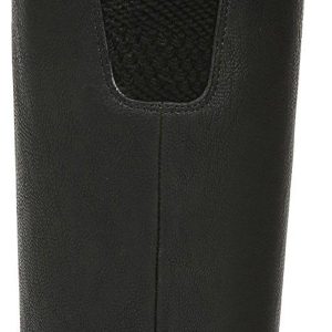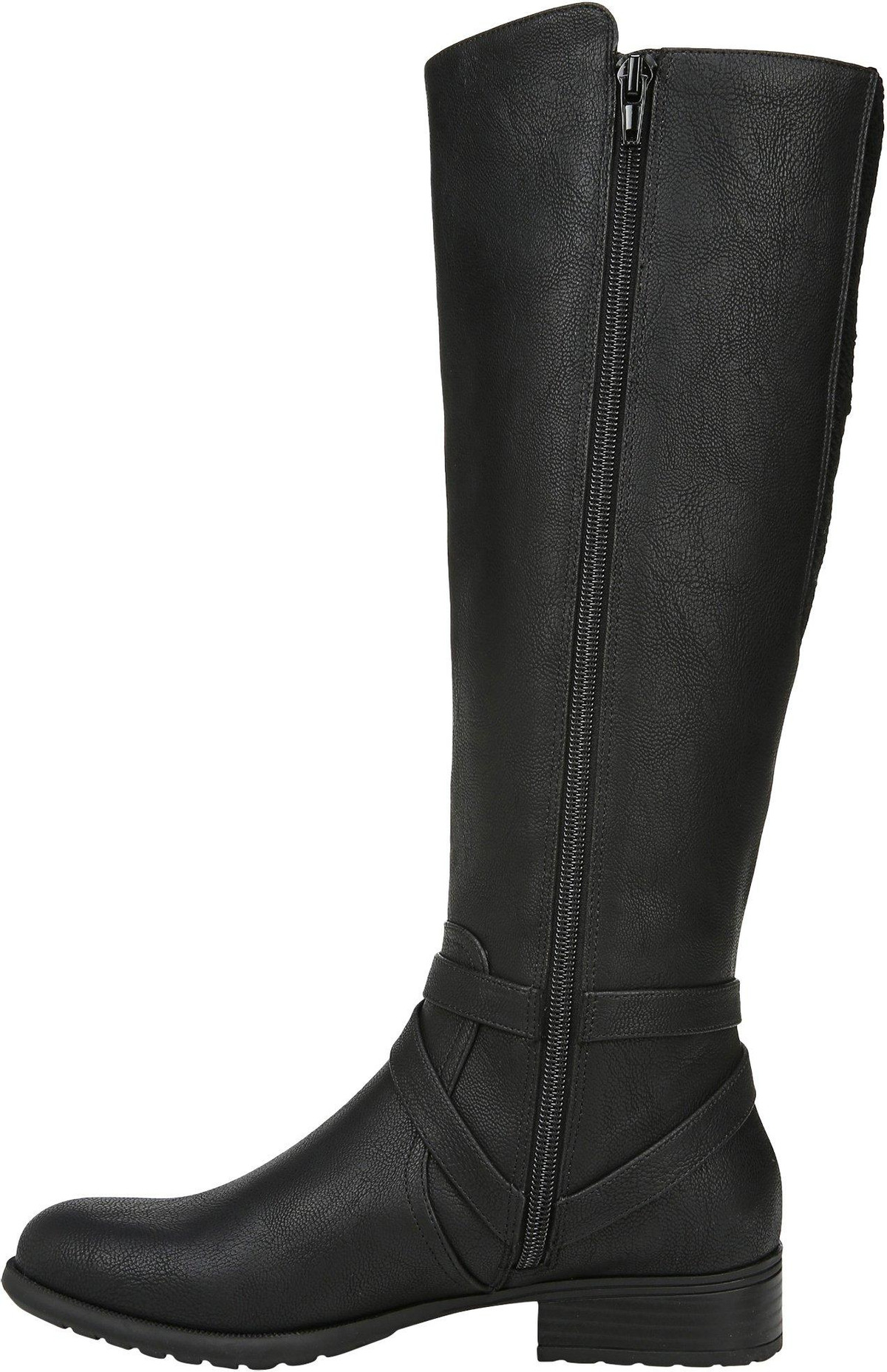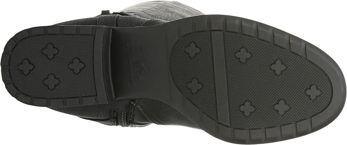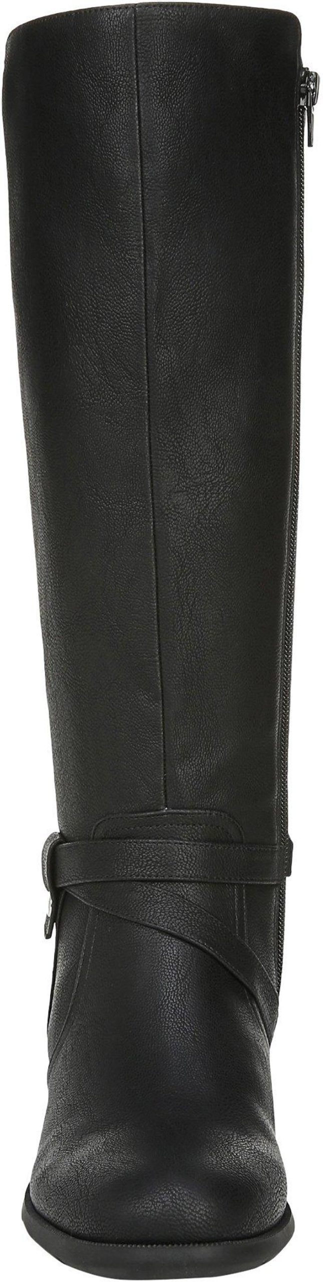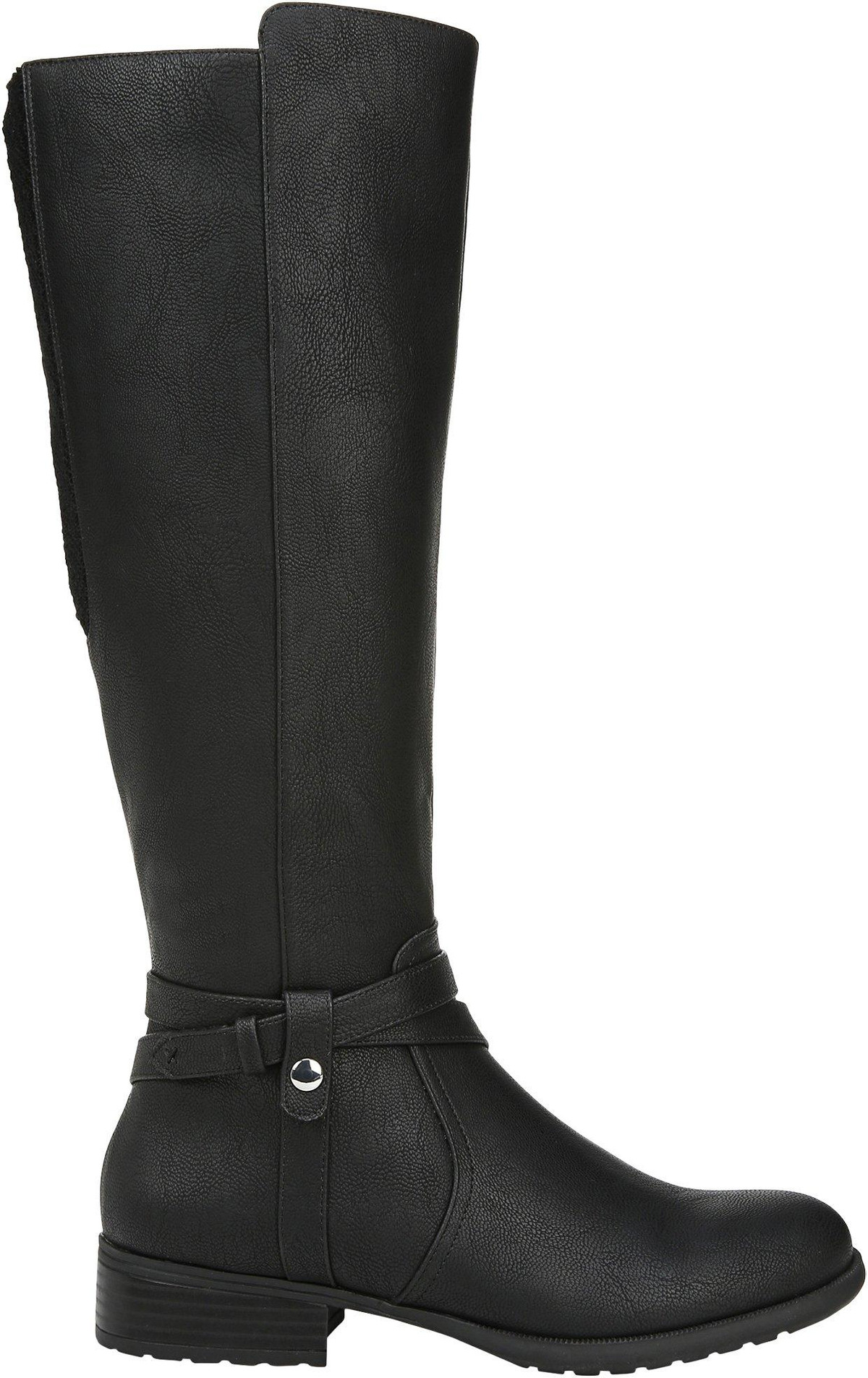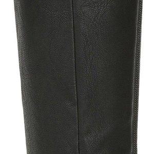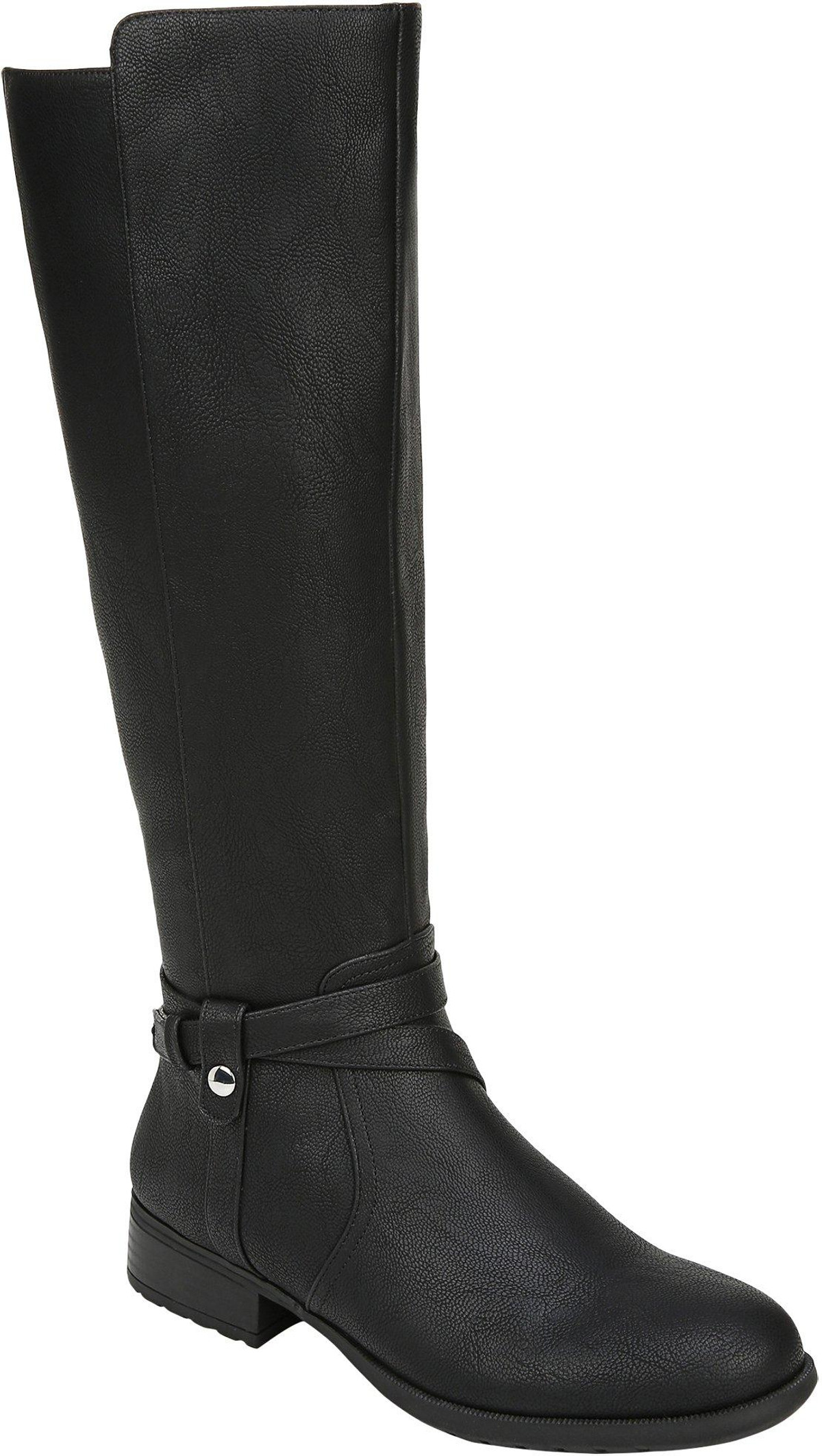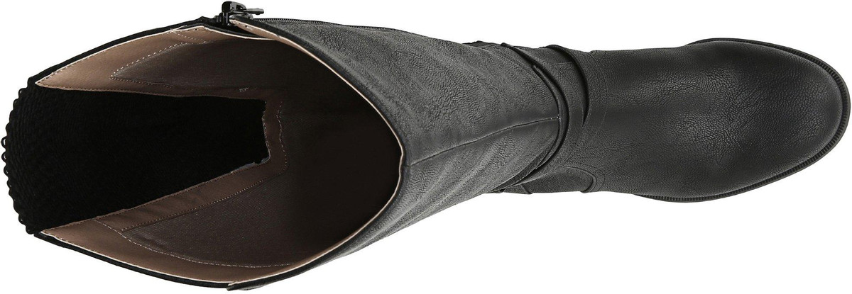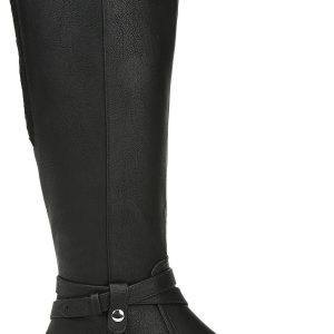 Classic & comfortable, this water-resistant riding boot will keep you looking & feeling great all season. Water-resistant faux leather upper with a round toe, crisscrossing strap detail, metallic stud, & stretch back panel. Boot shaft is 15.25” & calf circumference is 18”.