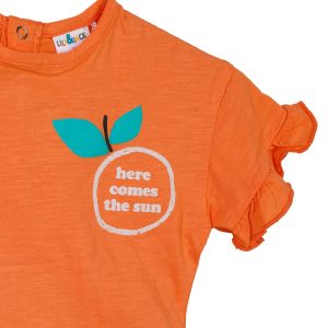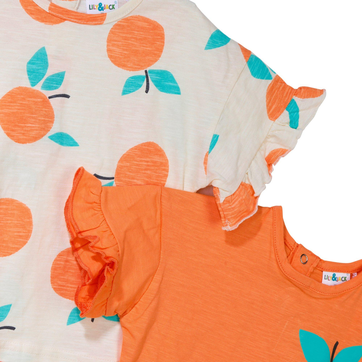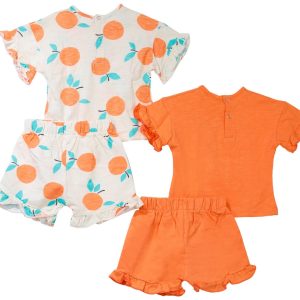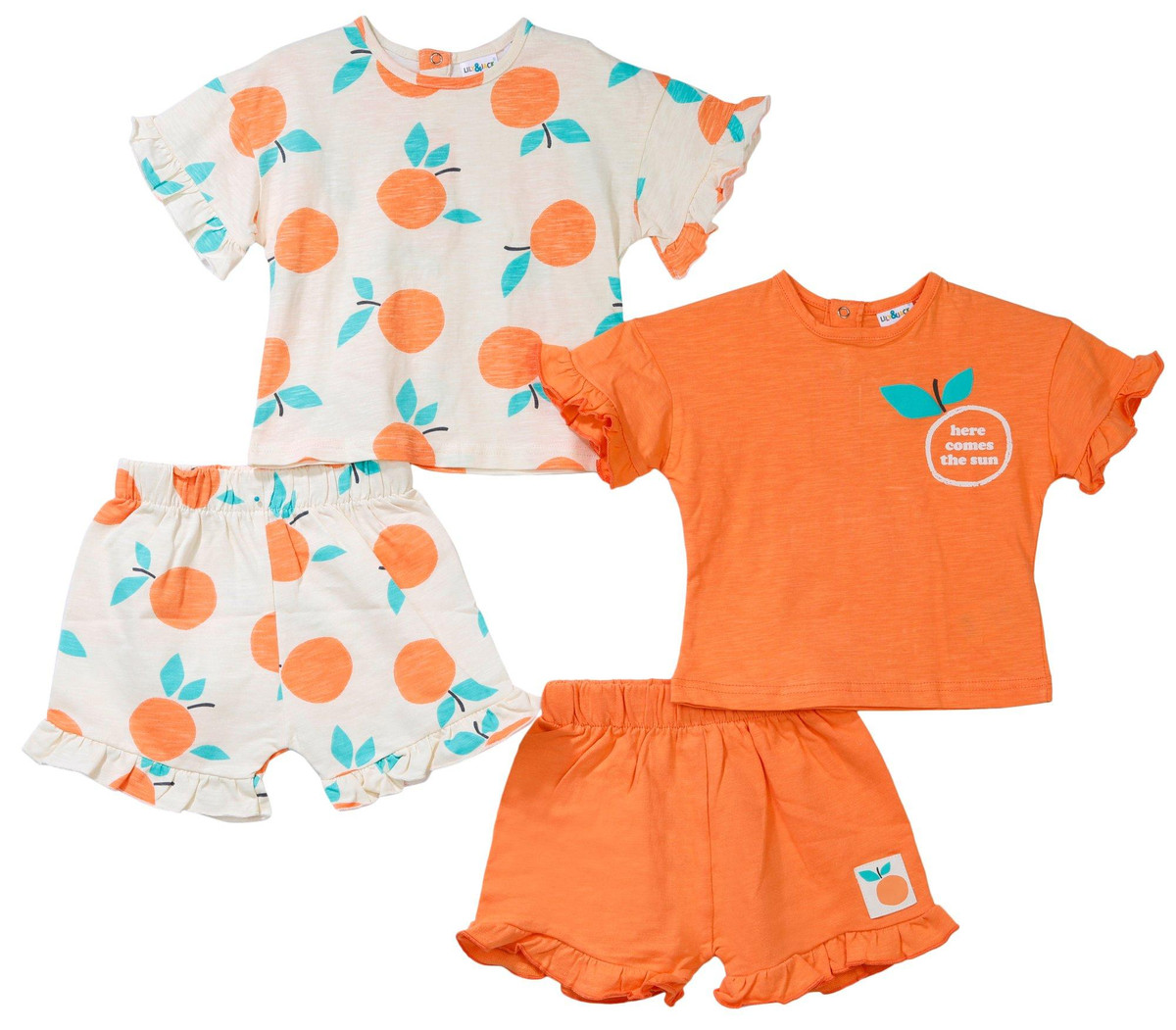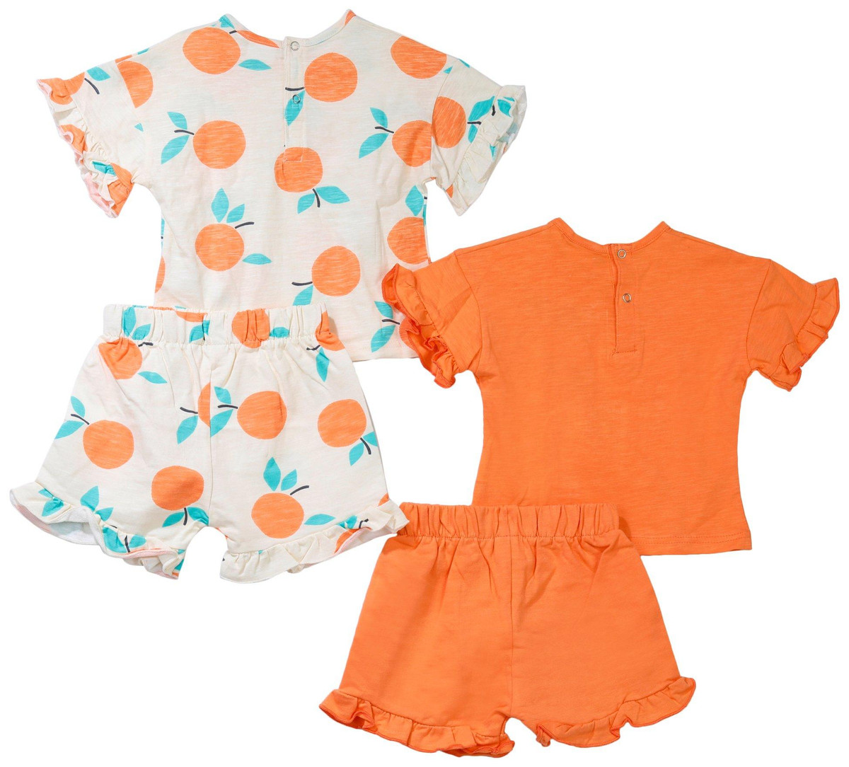 This four piece set from Lily and Jack can be worn in four stylish combinations. With two ruffle leg shorts and two crew neck tops featuring ruffled sleeves, you can mix and match for a fresh look or stay prepared for any spills. The orange fruit pattern adds a playful touch perfect for sunny days.