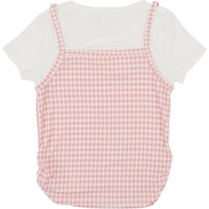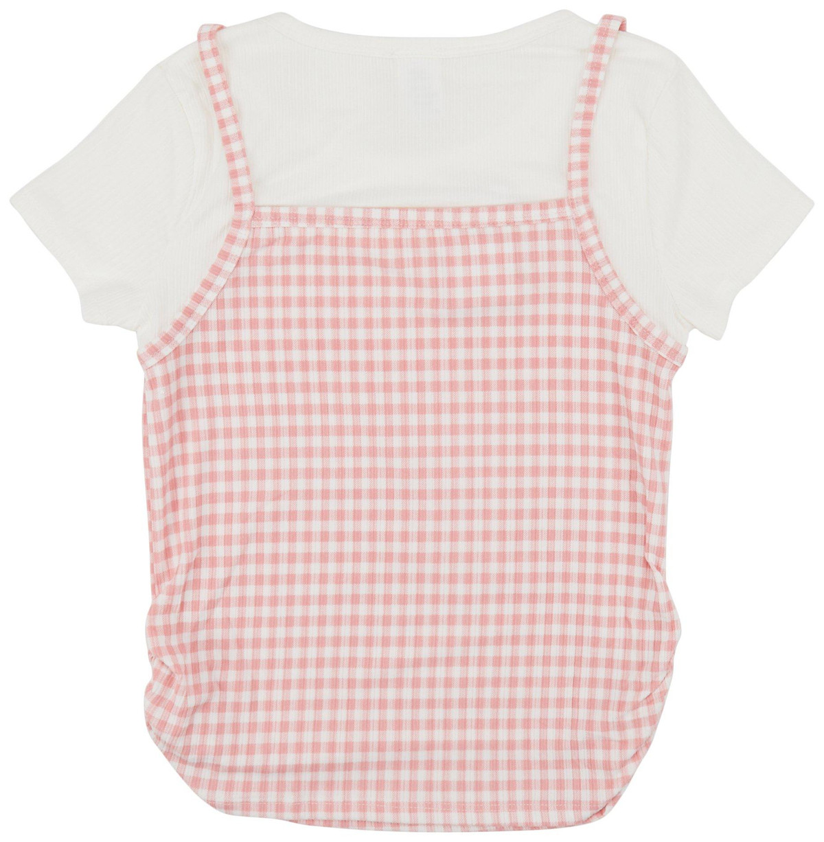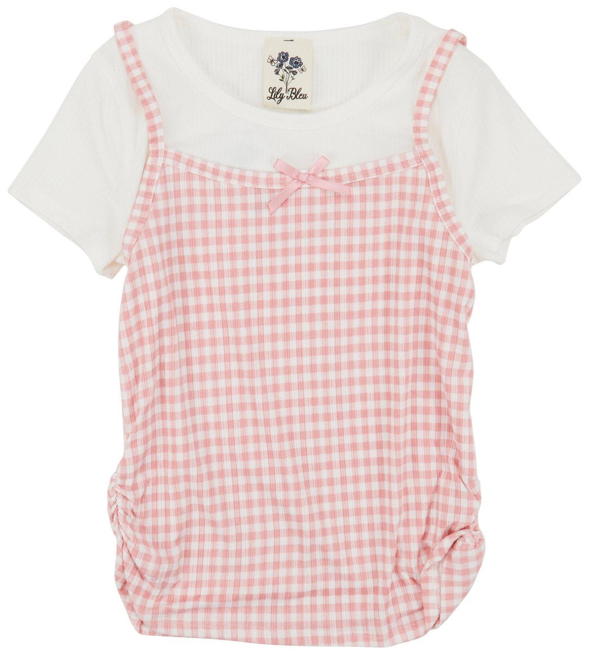 Introducing the Big Girls 2Fer Gingham Print Top, a stylish and versatile piece for any wardrobe. Made from a blend of polyester and spandex, this top offers a comfortable and stretchy fit. It features a trendy layered 2Fer look, a classic gingham print, a crew neckline, and short sleeves. Perfect for casual outings or special occasions, this top combines fashion and comfort effortlessly.