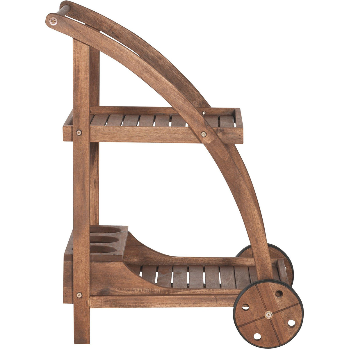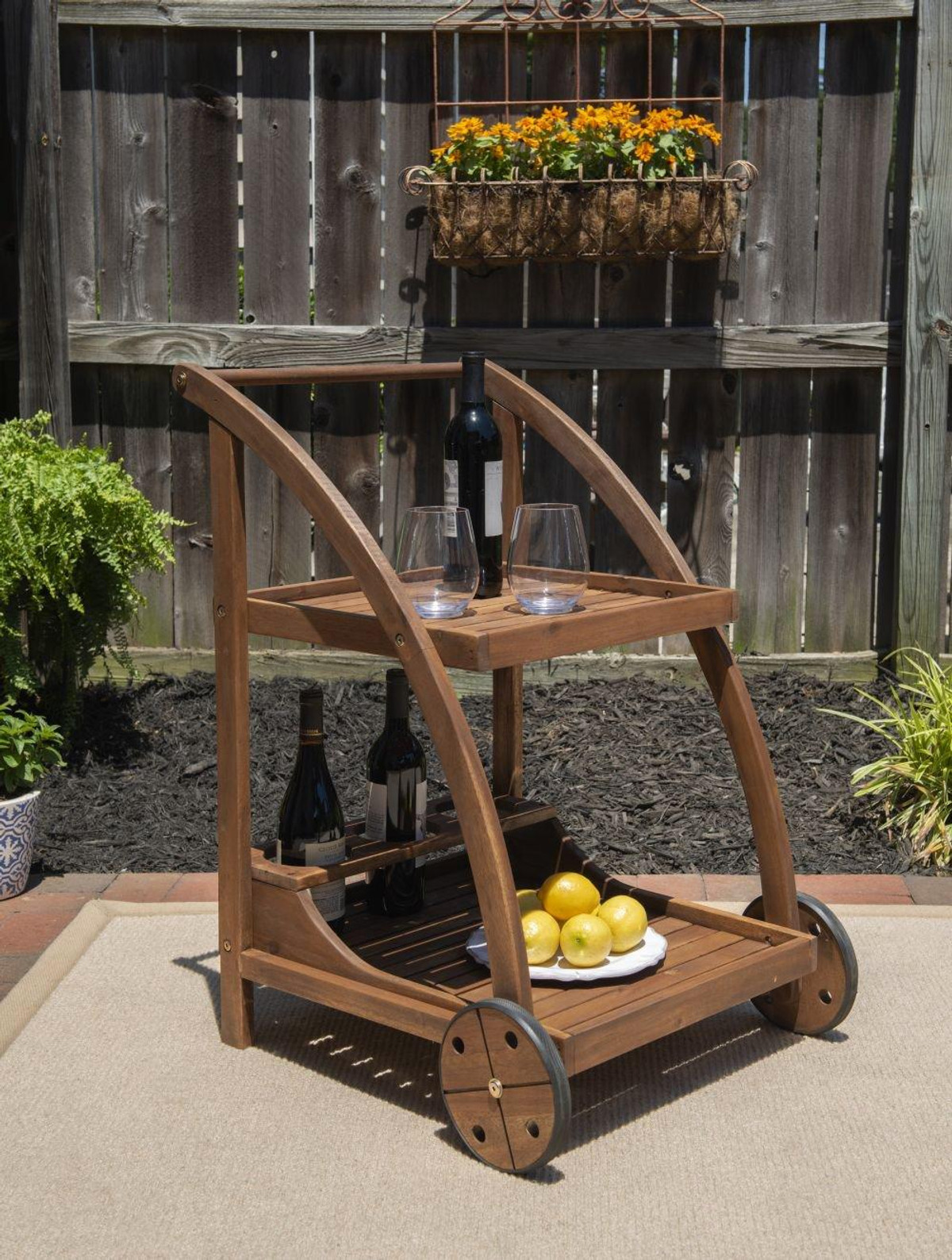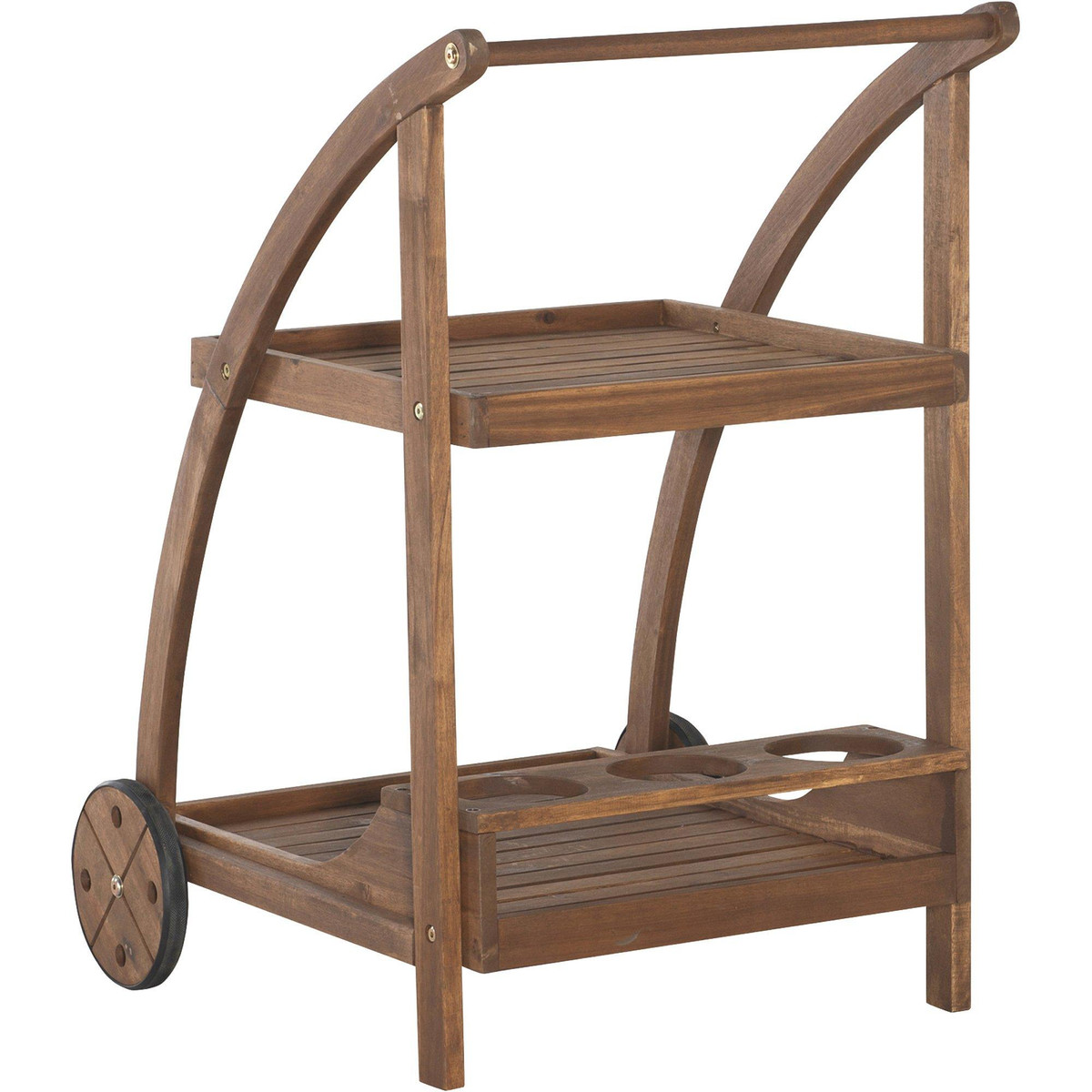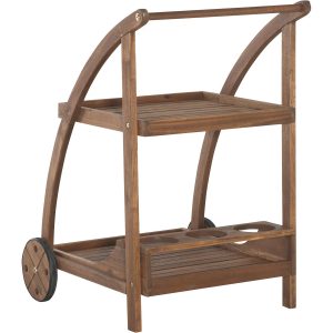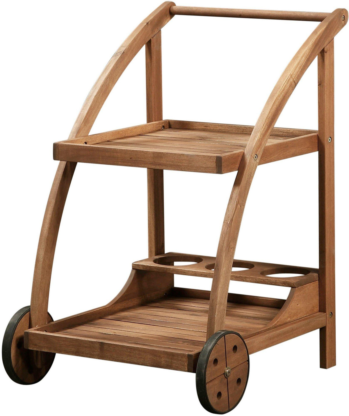 Linon skillfully combines the latest trends with quality home decor. Perfect for the avid gardener, the Catalan Trolley is sturdy and durable for your outdoor space. The trolley features two levels of storage and display space. Large front wheels make it simple to move around your yard. The teak finish easily complements any existing decor. Measures 24.41”W x 21.06”D x 31.5”H.