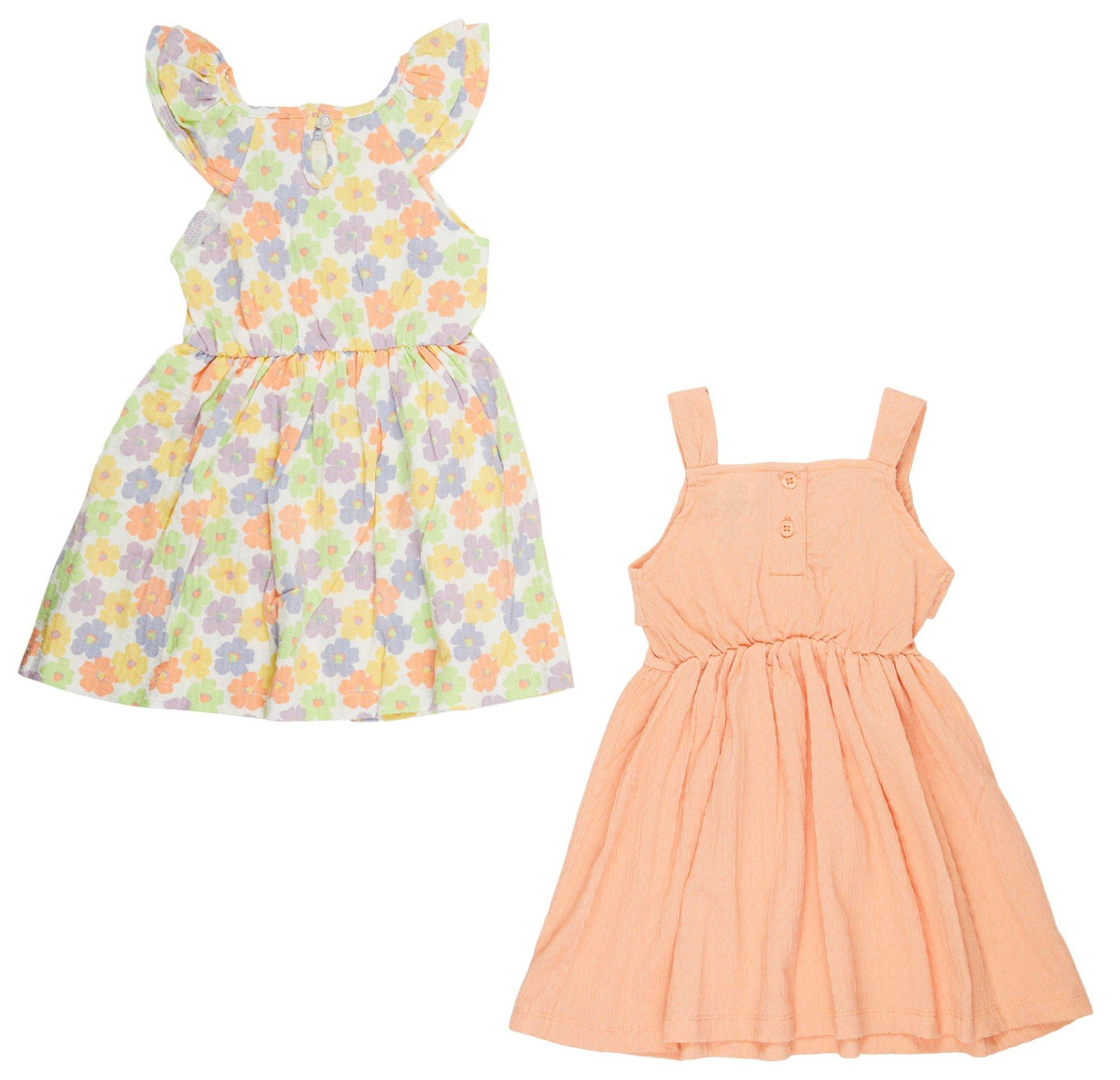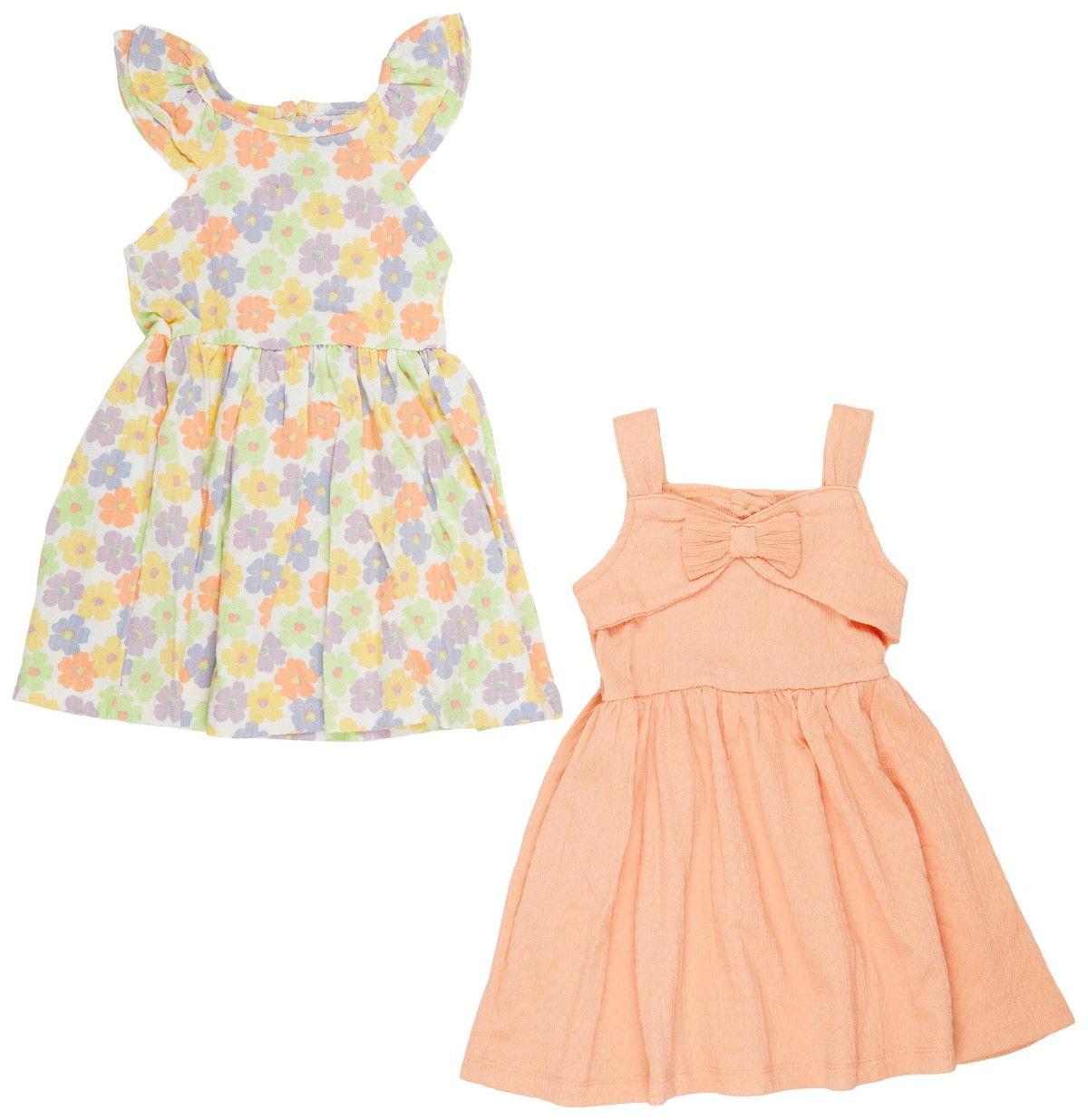 This 2 pack of Little Lass toddler dresses brings twice the charm with two sleeveless styles. The floral dress is made from soft 100 percent cotton with ruffle tank sleeves for a breezy look, while the peach dress blends polyester and spandex for stretch and features a sweet bow at the chest. Perfect for warm days and picture-ready moments.