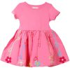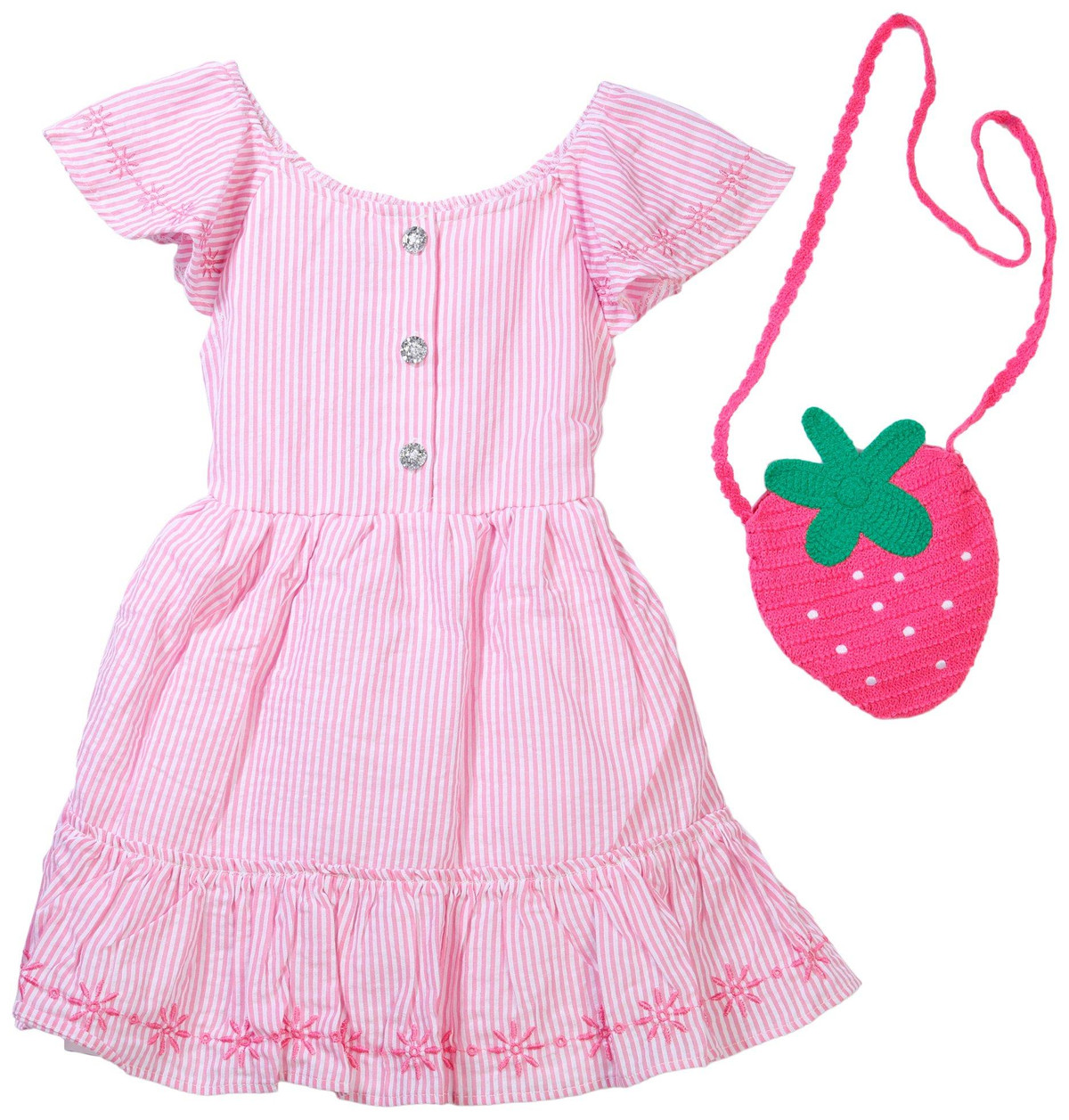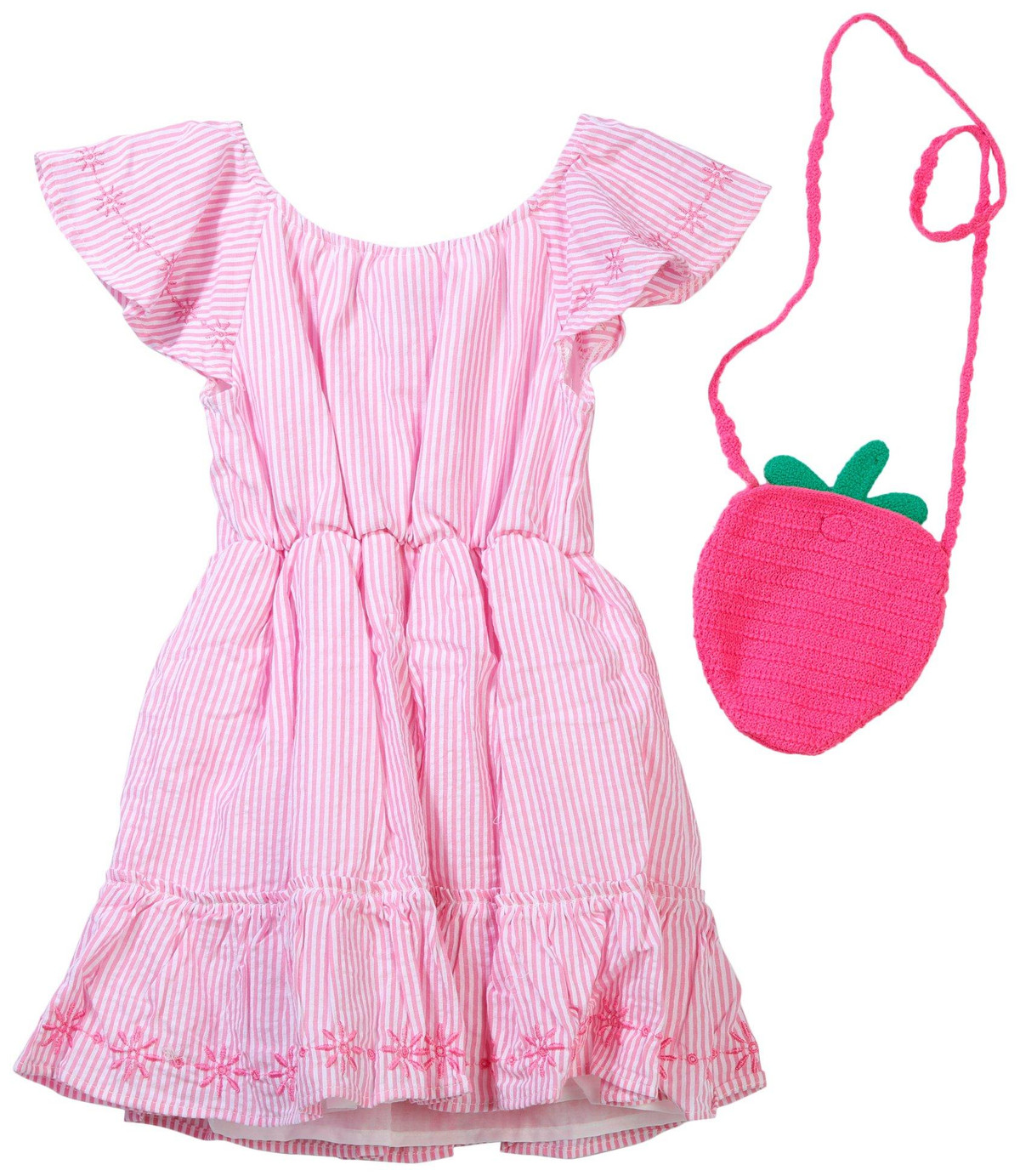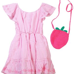 The Little Girls 2 Pc Dress Set is a delightful outfit featuring a short sleeve striped dress made from a soft cotton and polyester blend. It comes with a charming crochet strawberry purse, adding a playful and sweet touch to her look.