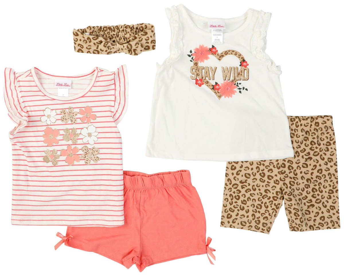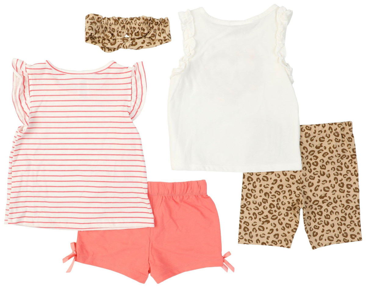 Mix, match, and play all day with this vibrant 5-piece set! Featuring two sleeveless tops, two comfy shorts, and a coordinating headband, each piece comes in cheerful prints and colors for endless outfit combos. Soft, breathable fabric keeps your little one cool and stylish.