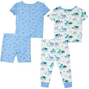 Wrap him in comfort and charm with the Baby Boys 4 Piece Dinosaur Pajama Set. Featuring two coordinated outfits with playful dinosaur prints, the set includes one short-sleeve top with shorts and another with long pants for versatile sleepwear options. Crafted from soft fabric for restful nights and easy layering. Machine wash cold for hassle-free care.