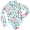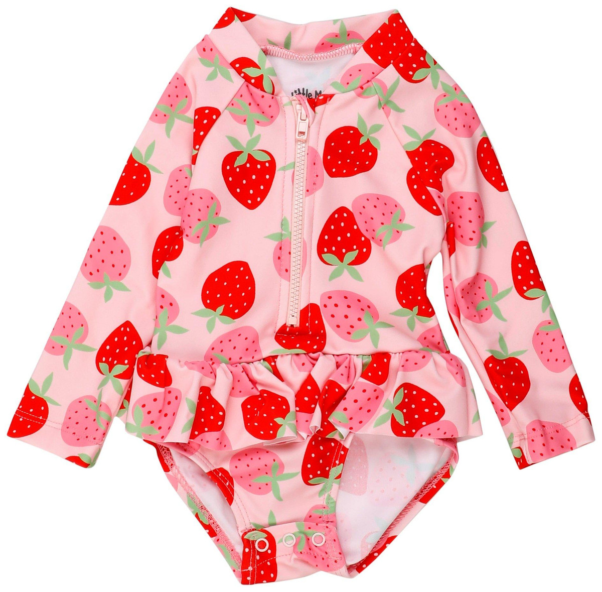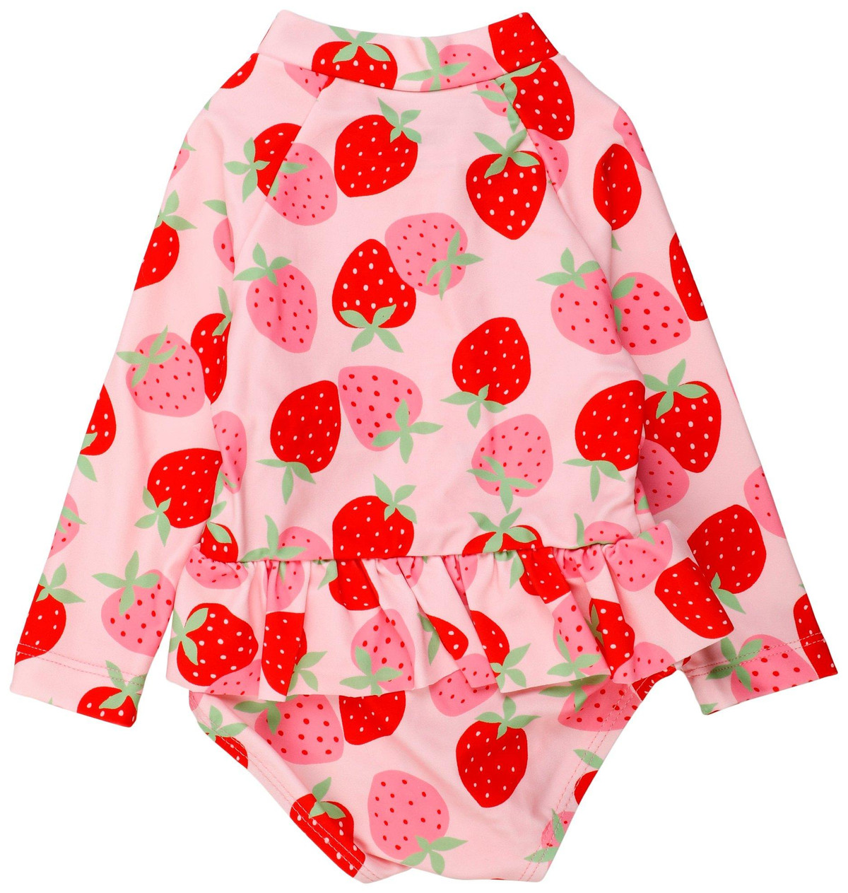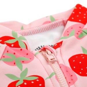 Make a splash in this Strawberry Rash Guard Swimsuit! Featuring UPF 50+ sun protection with long sleeves, a 3/4-zip front with a chin guard, and vibrant strawberry print design. Adorable ruffle around the waist for twirling. Fully lined for comfort and crafted with stretch for the perfect fit. Fabrication is: 82% nylon, 18% spandex. Lining: 100% polyester.