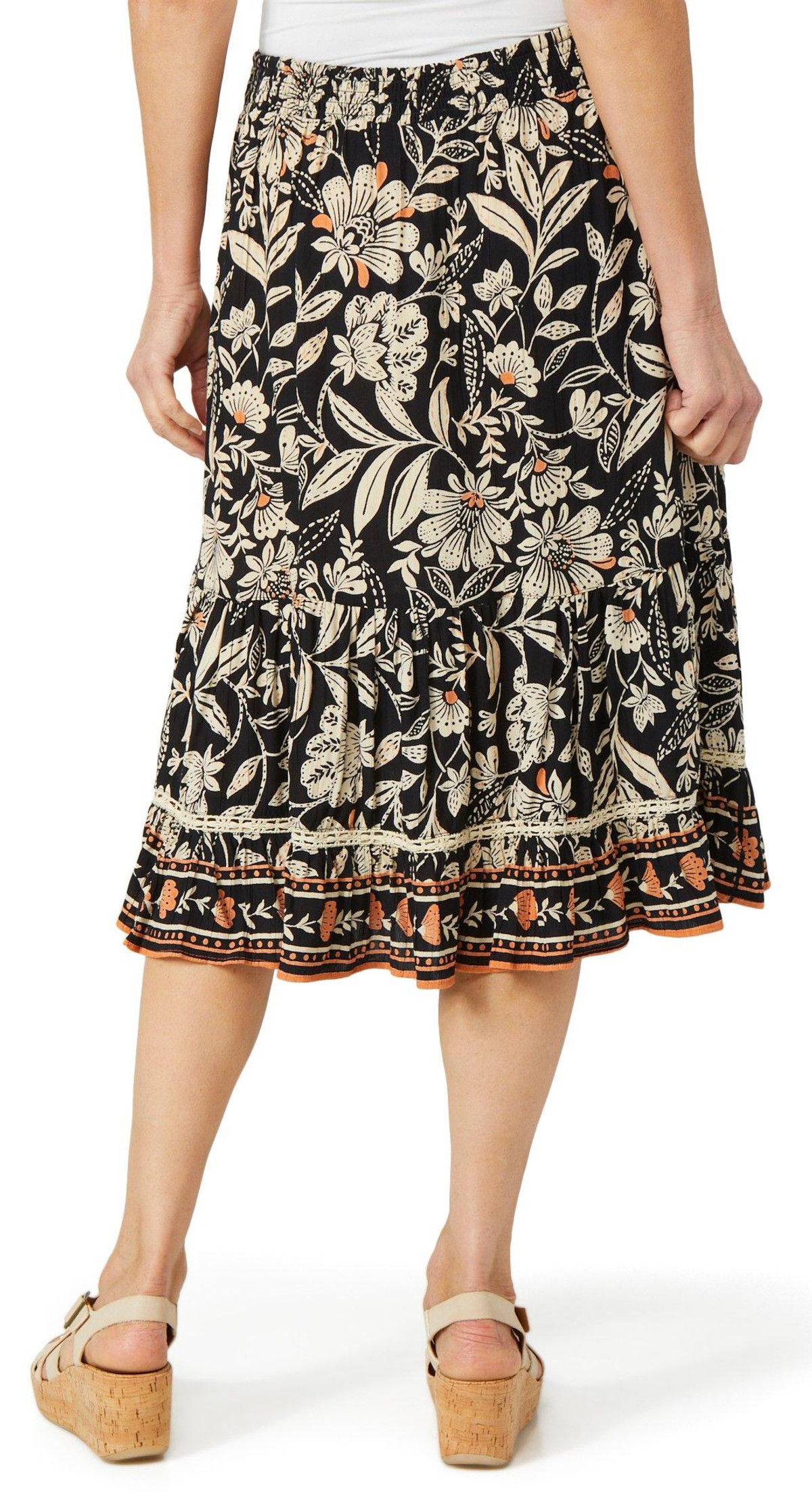 This womens floral tiered midi skirt is made of 100 percent rayon for a soft and airy feel. It features a charming floral print, elastic waistband with tassel drawstring ties and a ruffle hem that adds a touch of playful elegance to any outfit.