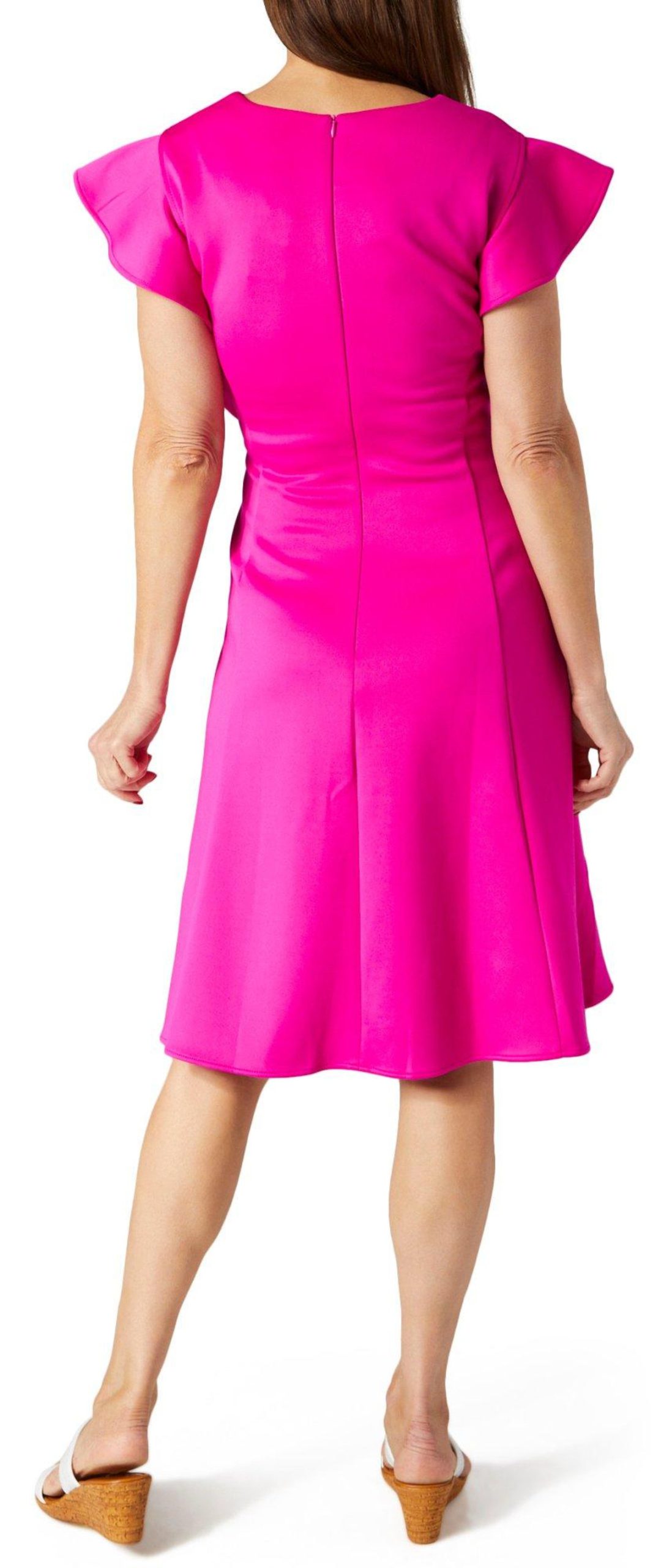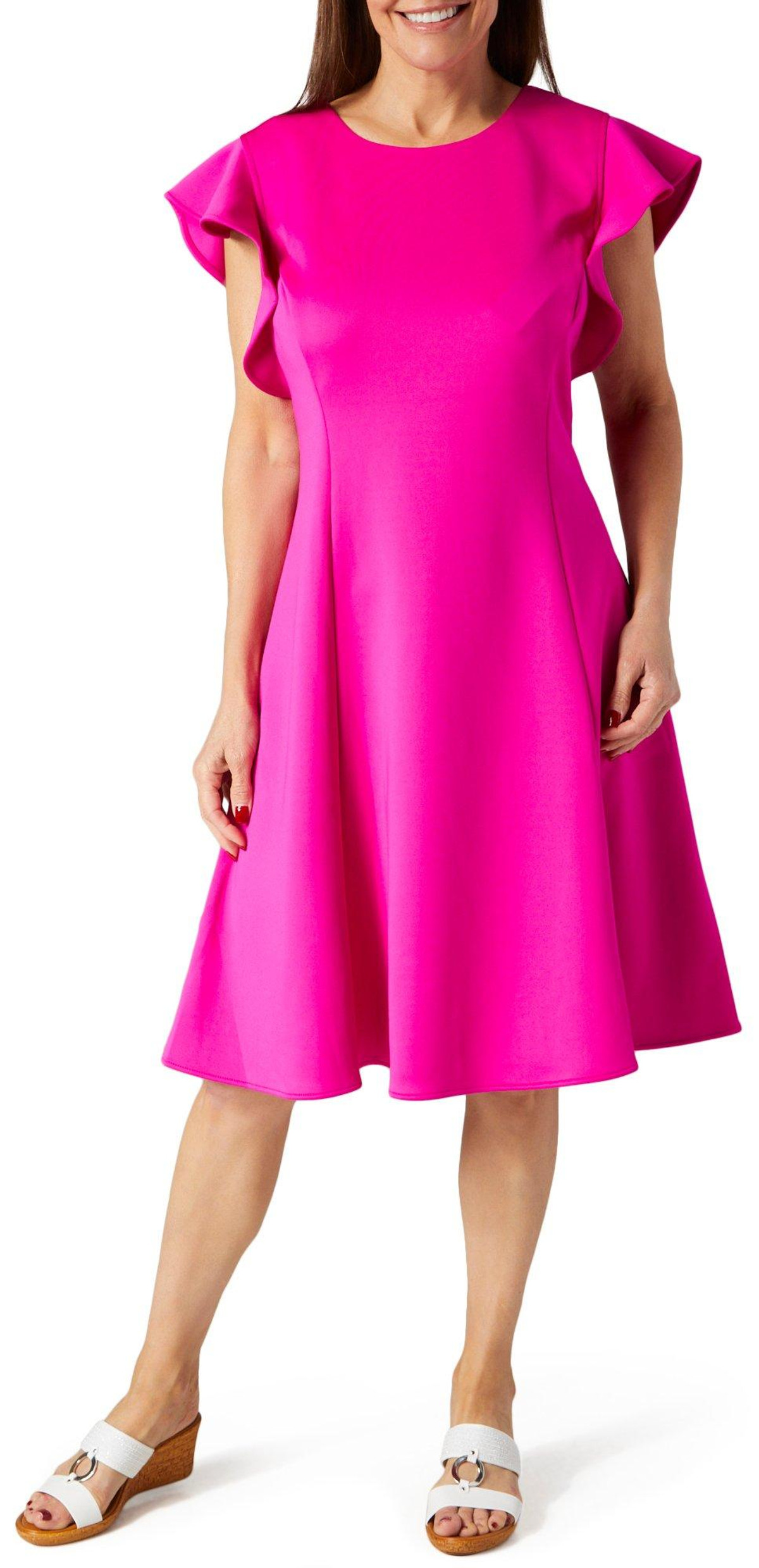 Enhance your wardrobe with our Women’s Cap Sleeve Fit & Flare Dress. Made from a blend of polyester and spandex, this dress features a stylish solid color, ruffle cap sleeves, and a back zip entry. With a flattering 39-inch length, it offers a perfect combination of elegance and comfort for any occasion.