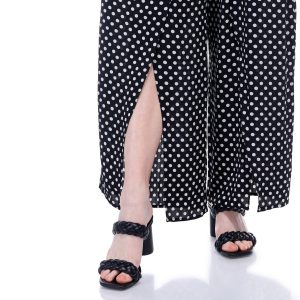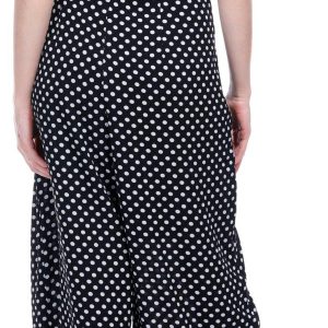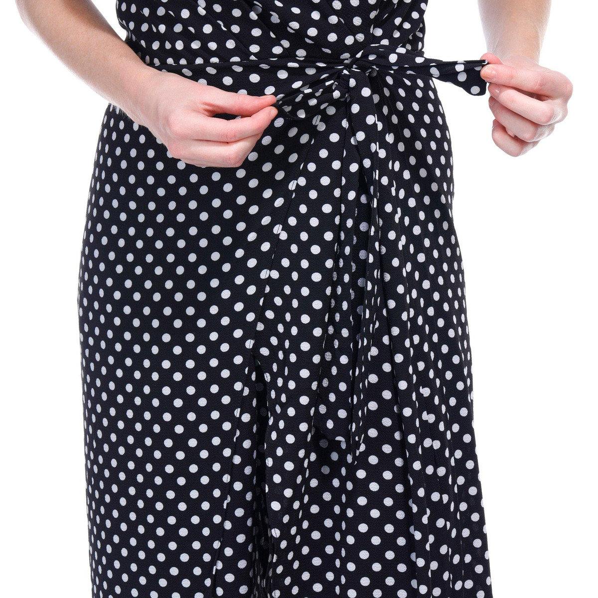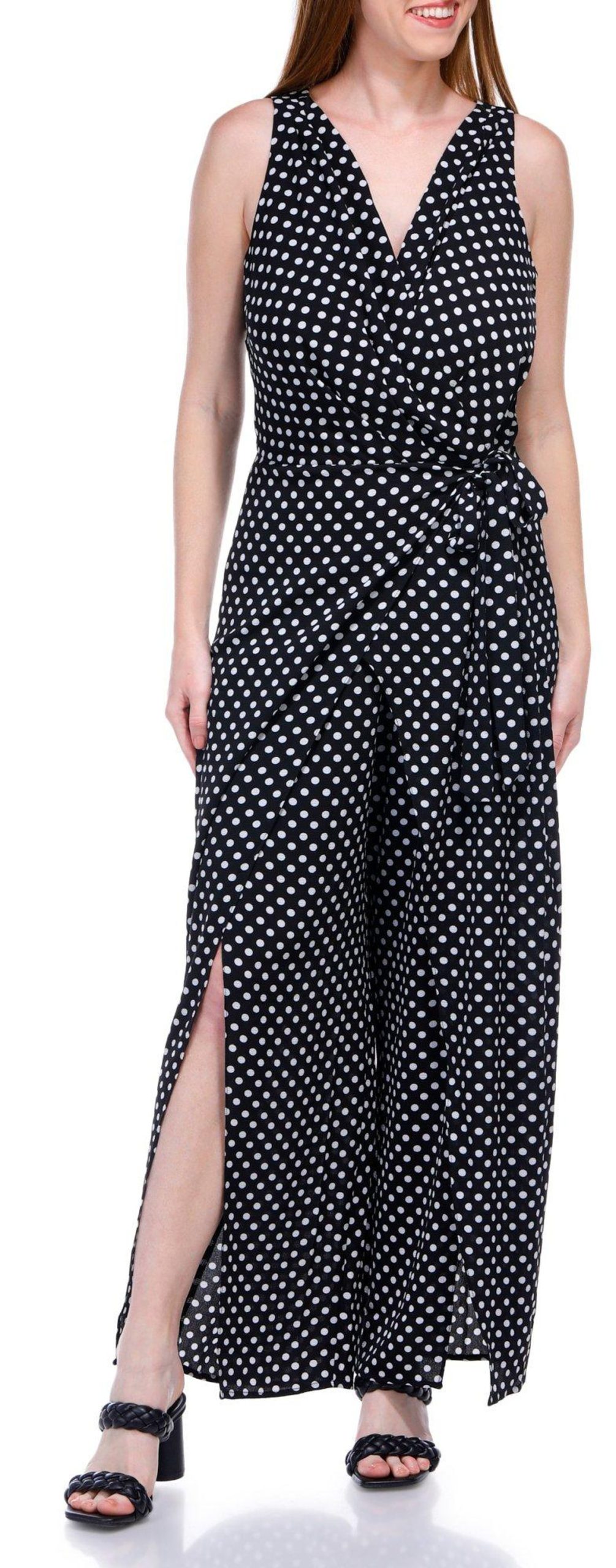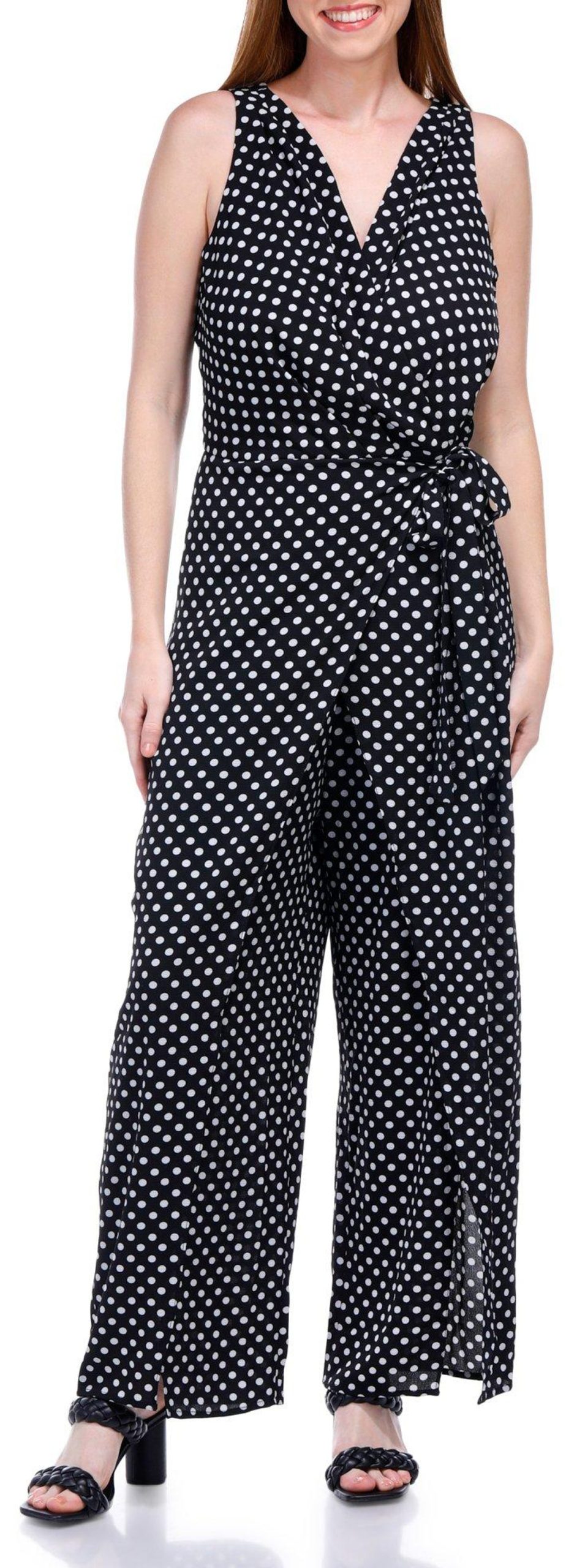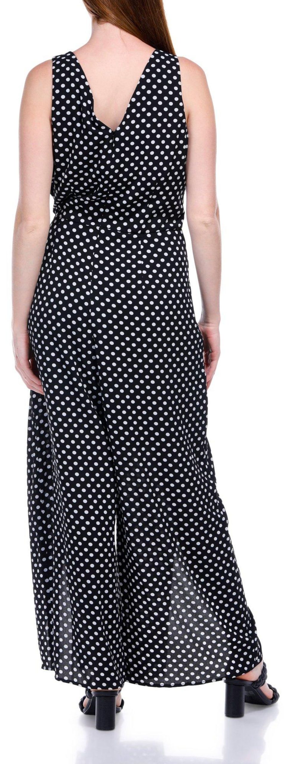 Introducing the Women’s Polka Dot Jumpsuit, crafted from a comfortable blend of polyester and spandex. This stylish jumpsuit features a playful polka dot print, a flattering v-neckline, and a sleeveless design. With a convenient back zip entry and a 26-inch inseam, it offers both ease and elegance. Perfect for any occasion, this jumpsuit combines fashion and comfort, making it a must-have addition to your wardrobe.