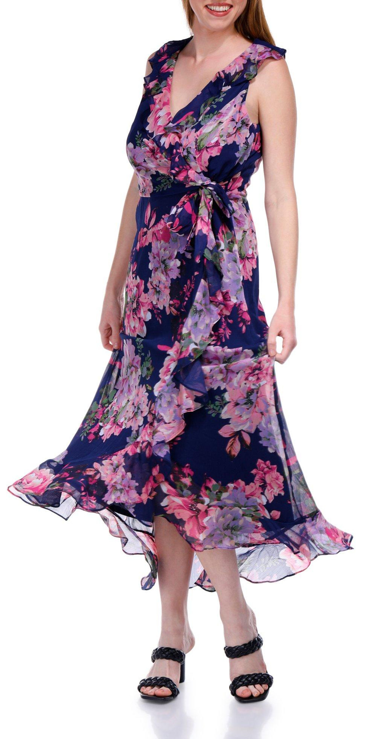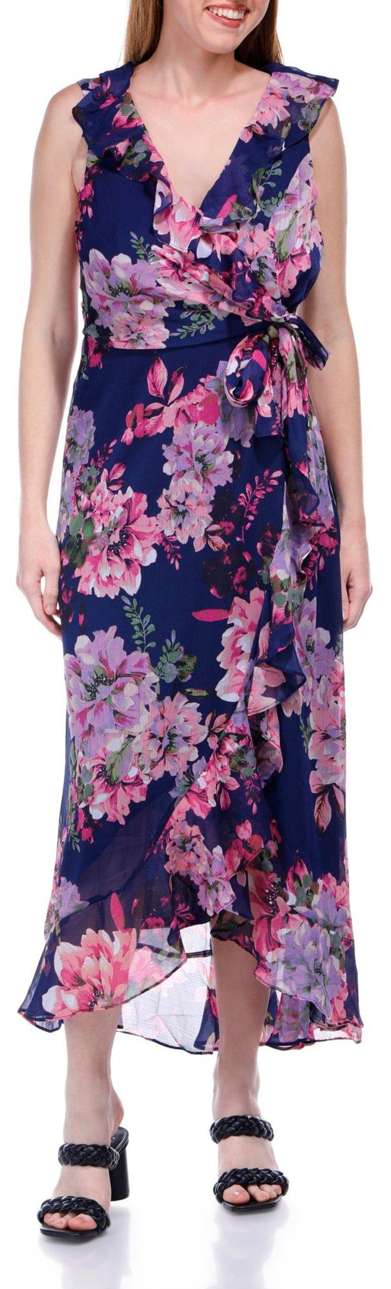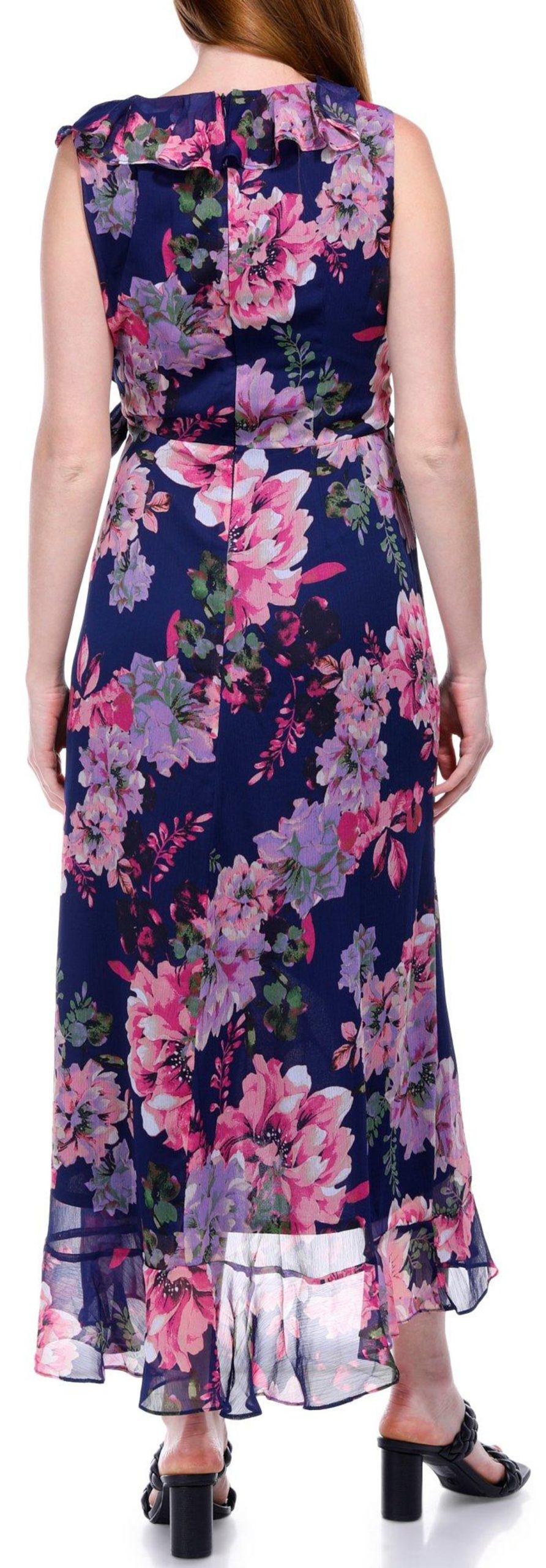 The Sleeveless Maxi Dress is a perfect blend of elegance and charm. Featuring a beautiful floral print, this dress adds a touch of femininity to your wardrobe. The ruffle details and wrap style front create a flattering and sophisticated silhouette, while the zipped back ensures easy wear. Ideal for both casual and dressy occasions, this versatile dress ensures you look effortlessly chic.