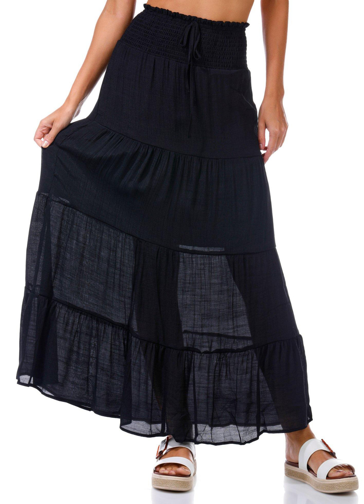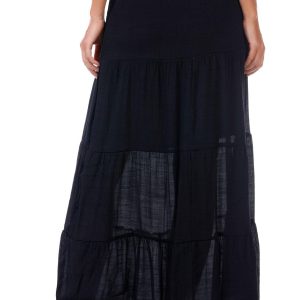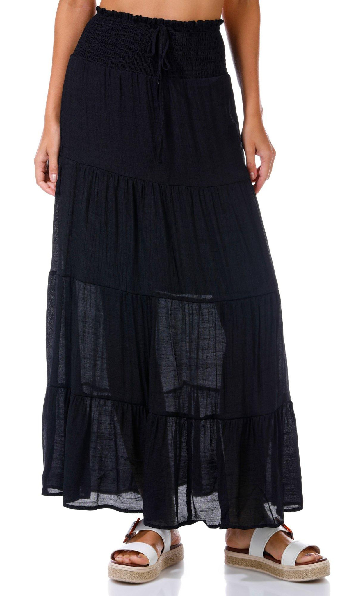 This juniors maxi skirt features a soft gauze fabric in a solid color with a breezy tiered design. The smocked waistband with drawstring tie offers a comfy fit while the knee length inner lining adds coverage. A perfect pick for warm weather days. Fabrication 65% rayon, 35% polyester