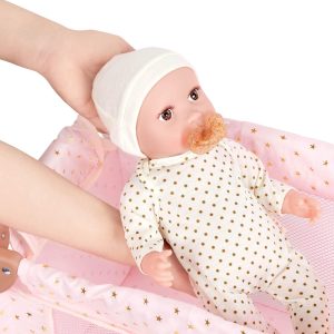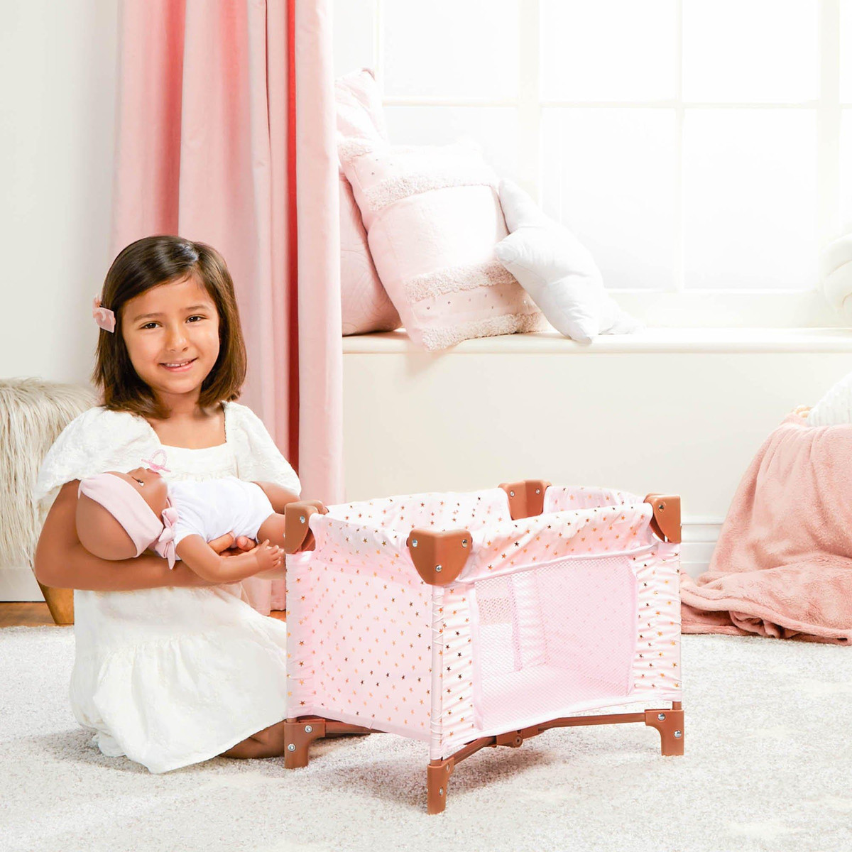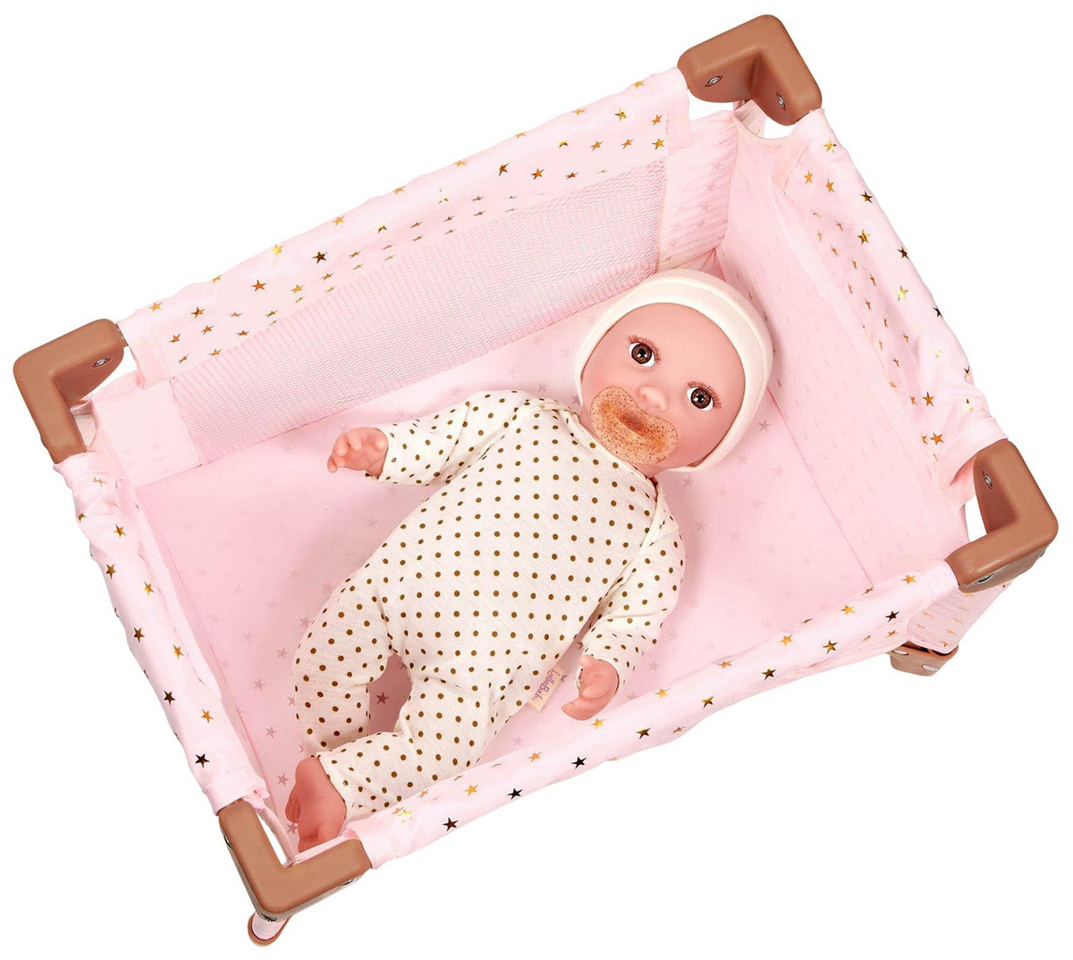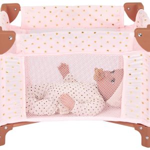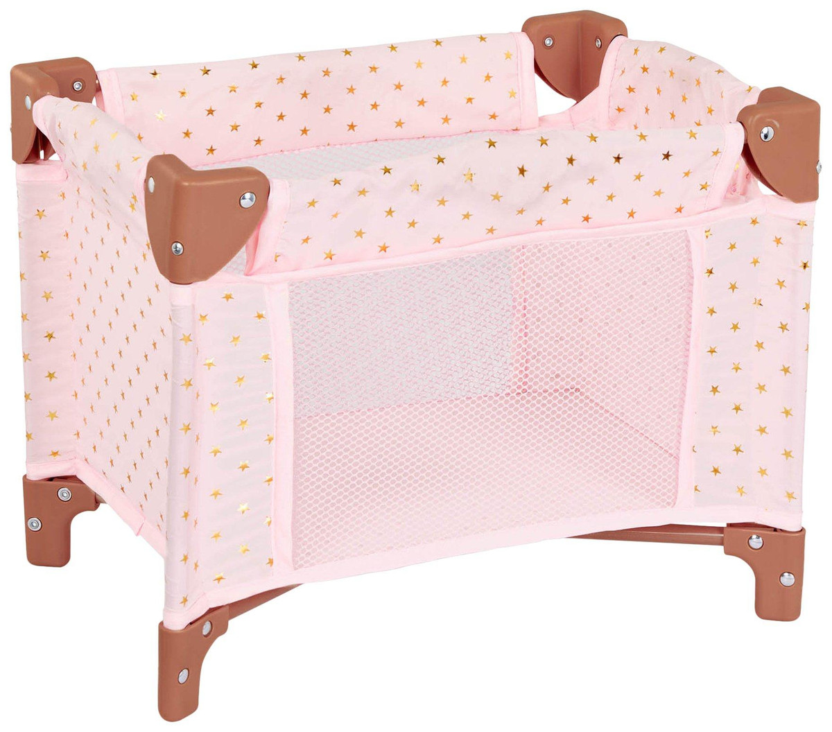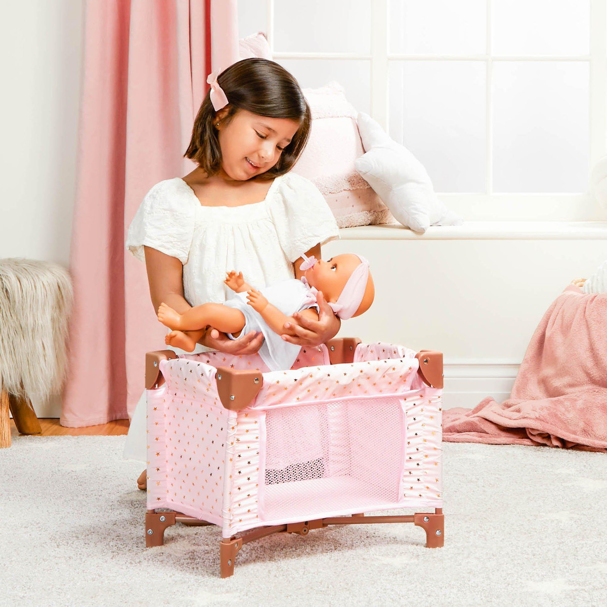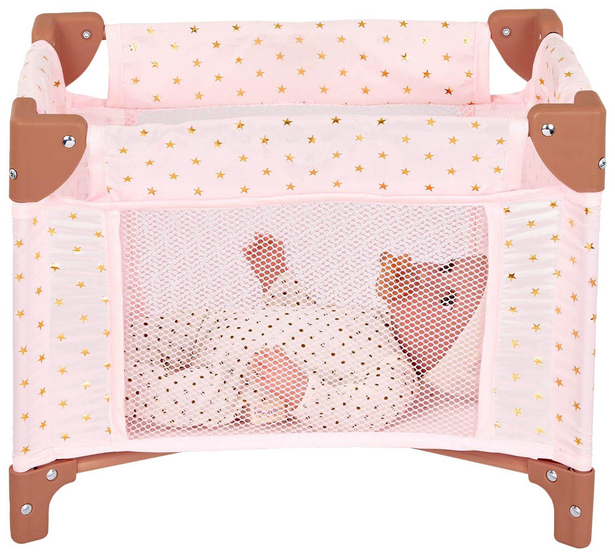 Give baby dolls a lovely place to dream and play with the beautifully designed LullaBaby playpen. Featuring a cute, golden star-print pattern, this modern playpen fits most 14-inch baby dolls comfortably and easily folds flat for convenient storage. Measuring 13 (H) x 11.5 (W) x 16 (L), the playpen is sturdy, lightweight and durable for everyday play. This LullaBaby doll accessory is recommended for kids ages 2 years old and up. Dimensions: 6.00 inch x 5.00 inch x 13.00 inch