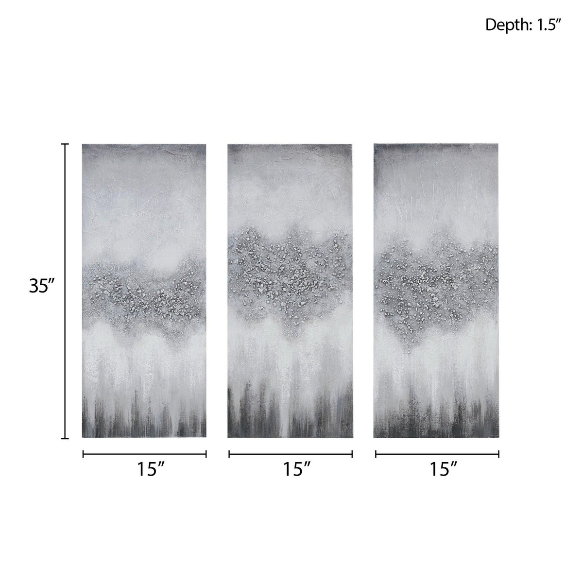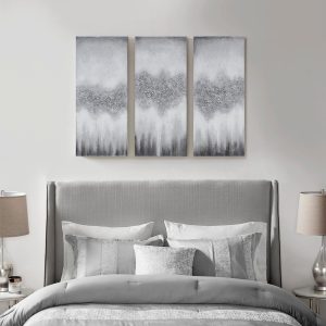 Accent your space with the contemporary allure of our Madison Park Luminous Heavily Embellished 3-piece Canvas Wall Art Set. 100% hand-painted, this canvas wall art set showcases rich grey and black ascending shades to create a bold and contrasting abstract look. Natural rock and stone embellishment on each canvas create beautiful texture and dimension, while a silver glitter finish adds a rich sheen and luster.