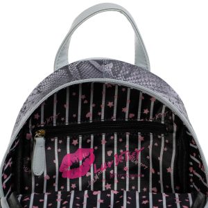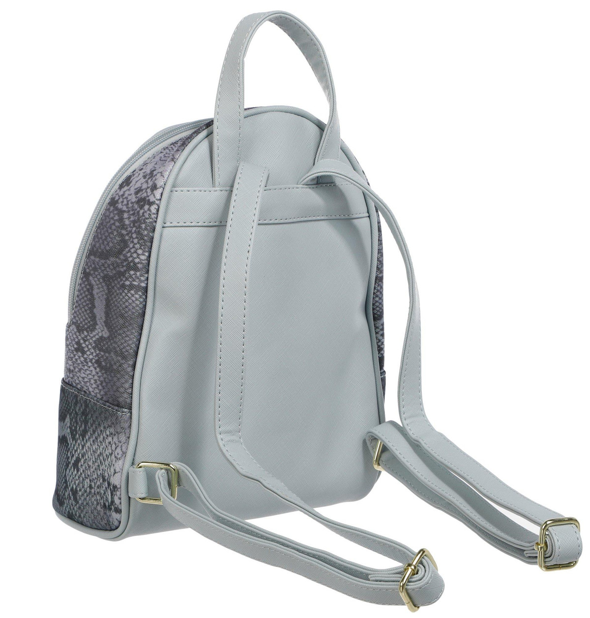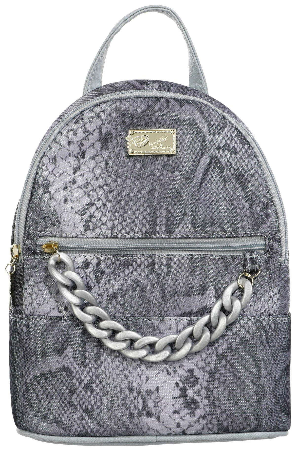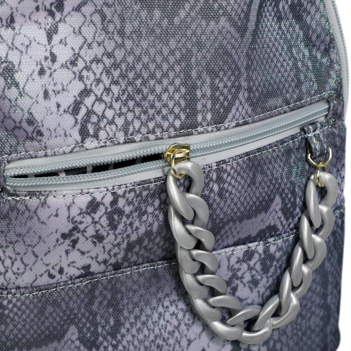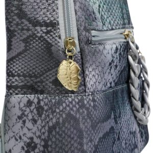The perfect blend of fashion and functionality, this Snake Print Backpack is a charming and stylish accessory for any occasion. This bag features a modern snake print design, two backpack straps, a top handle and a hangoff chain. The inner compartments reveals a lined interior with ample space and a zip pocket. Measures approximately 11 in x 9 in x 5 in.