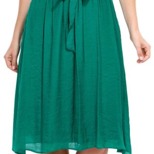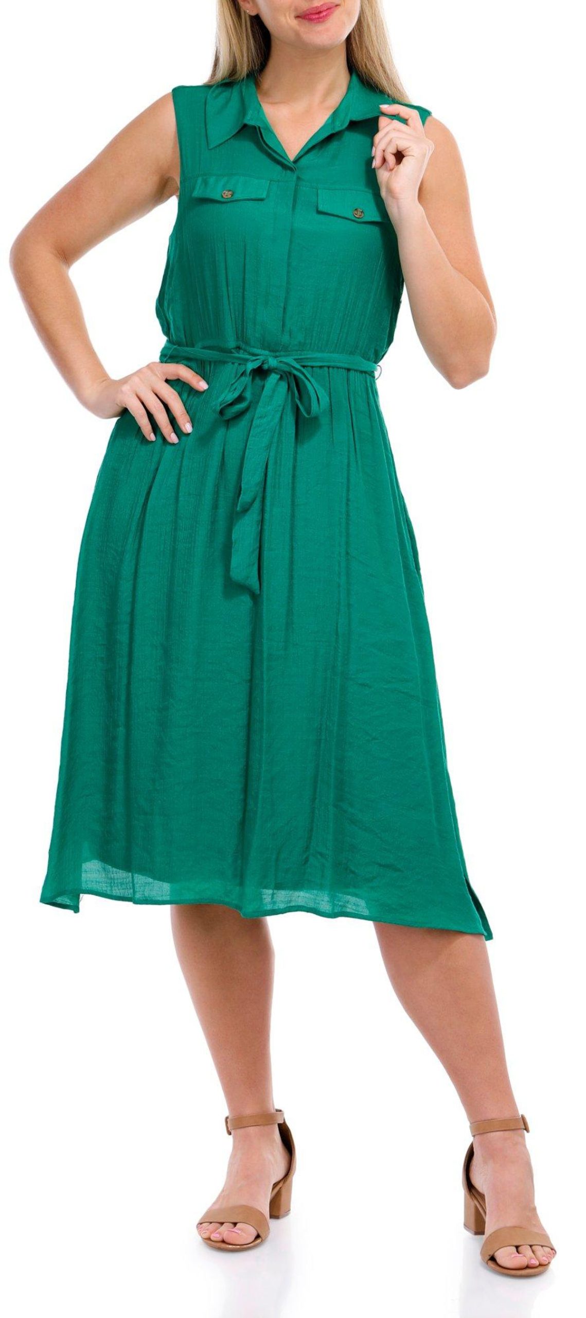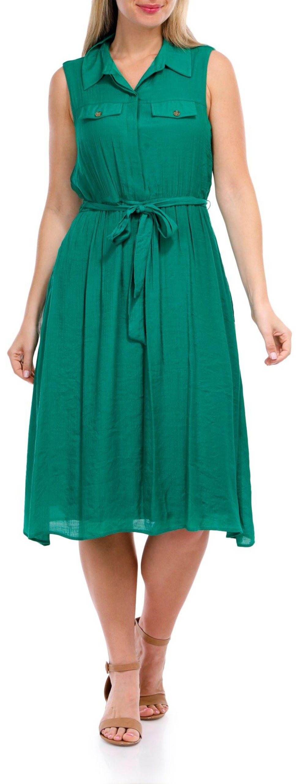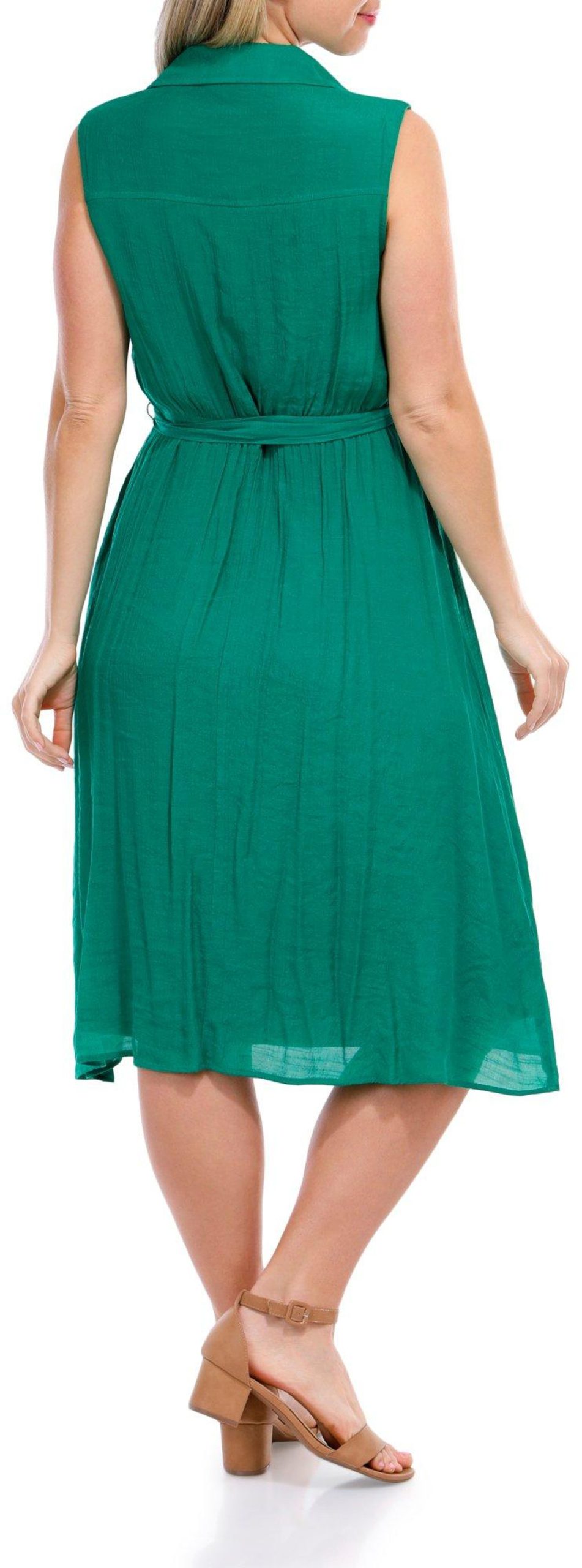 Introducing the Sleeveless High Neck Shirt Dress, a chic and versatile piece for your wardrobe. This dress features a button top and neck, adding a touch of sophistication. The waist tie allows for a customizable fit, while the faux chest pockets add a stylish detail. Fully lined for comfort, this dress is perfect for any occasion, combining practicality with elegance. Fabrication is 60% rayon, 40% polyester. Lining is 100% polyester.