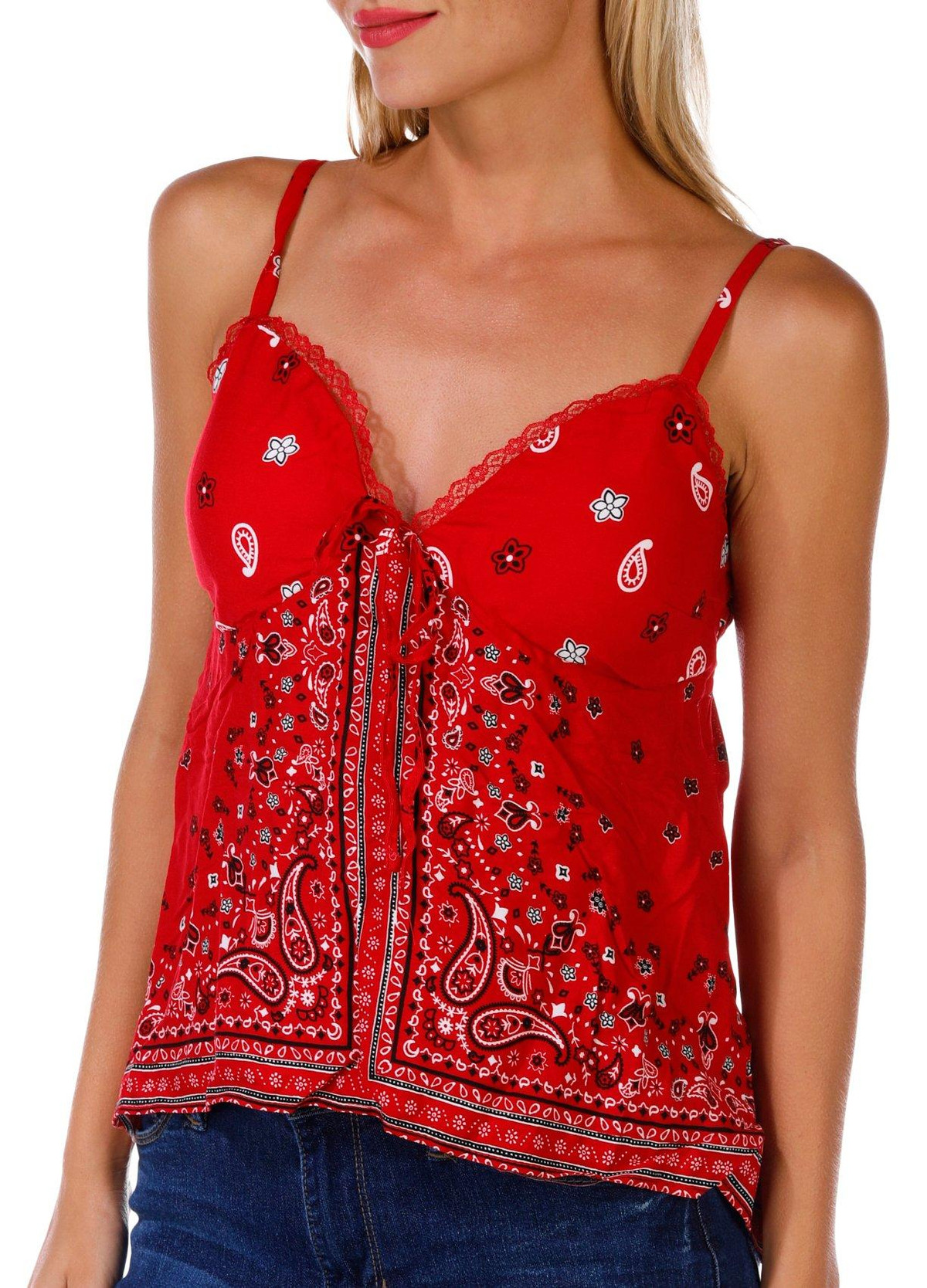 This juniors tank top features a bold bandana print with a scarf hem for a standout look. Adjustable straps and padded cups offer comfort and support while a smocked back ensures a flexible fit. Perfect for warm weather styling.