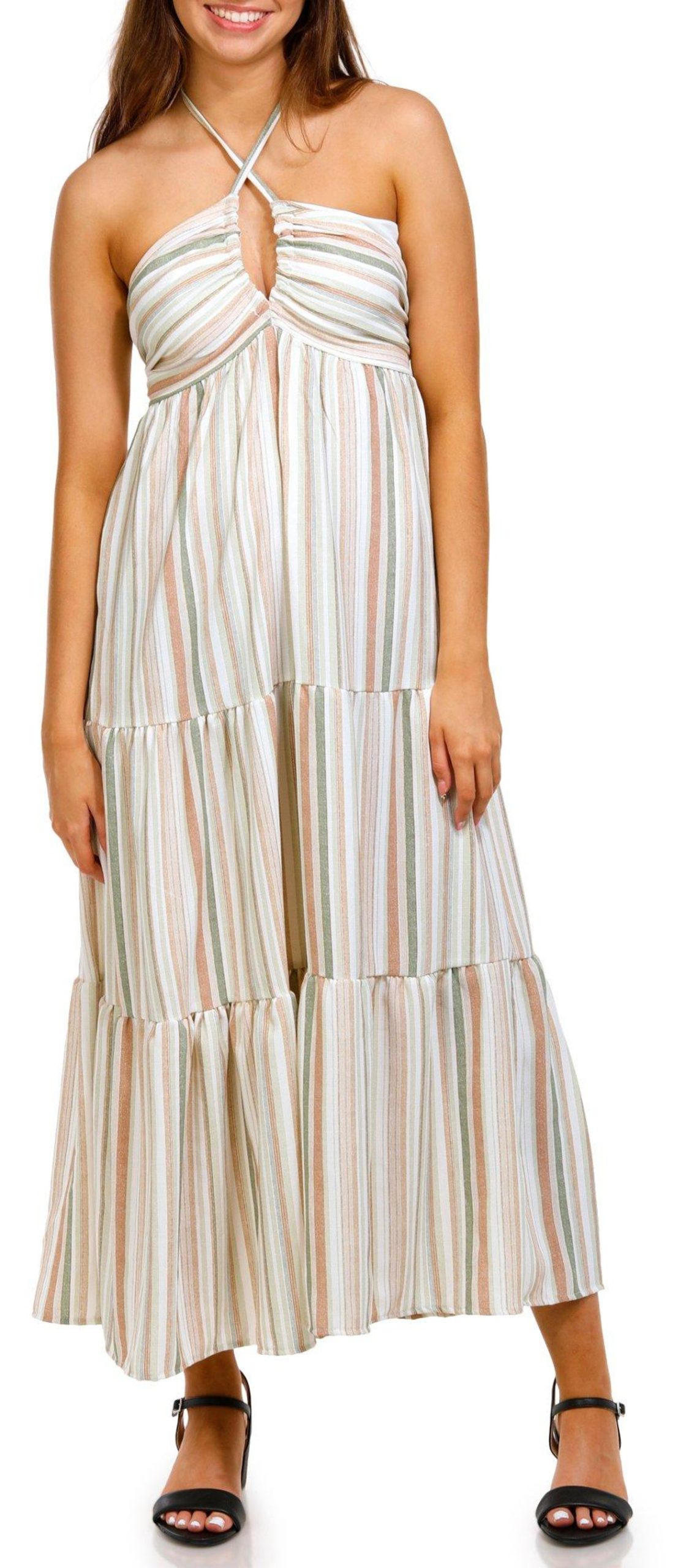 Elevate your style with the Juniors Halter Maxi Dress. Crafted from 100% polyester, this dress features a stylish striped print that adds a touch of sophistication. The back tie and halter tie ensure a perfect fit, making it ideal for any occasion. Embrace elegance and comfort in this stunning maxi dress.